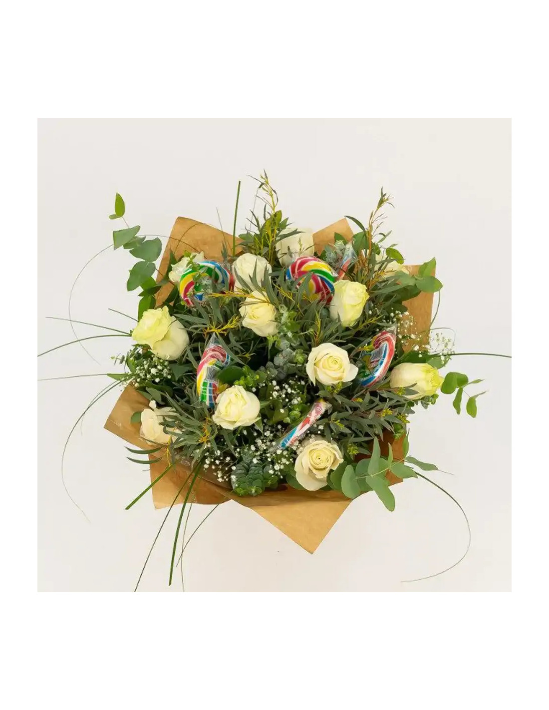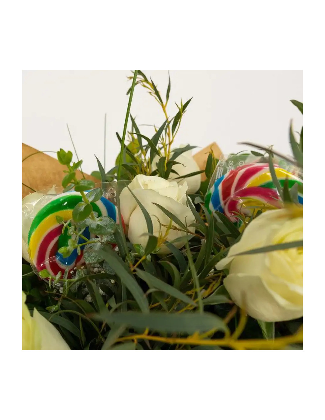 Sorprèn aquesta persona tan especial amb aquest ram de roses i piruletes de colors. Serà un regal divertit i alegre, perfecte per a una ocasió especial! Què millor que eun ram ben dolç per a aquesta persona que ens treu un somriure de bon matí? Amb aquest ram seràs tu qui li tregui un somriure i li faci el dia més dolç i agradable. Es pot fer millor regal? Com fer que el teu ram duri més? Primer cal treure el paper kraft que l'envolta perquè la flor respiri millor. Tallar la tija en diagonal 1 cm Posa el teu ram en un gerro ampli amb aigua neta Canvia l'aigua del gerro cada dos dies. Quan els pètals comencin a pansir-se, retira'ls per no fer malbé els altres pètals