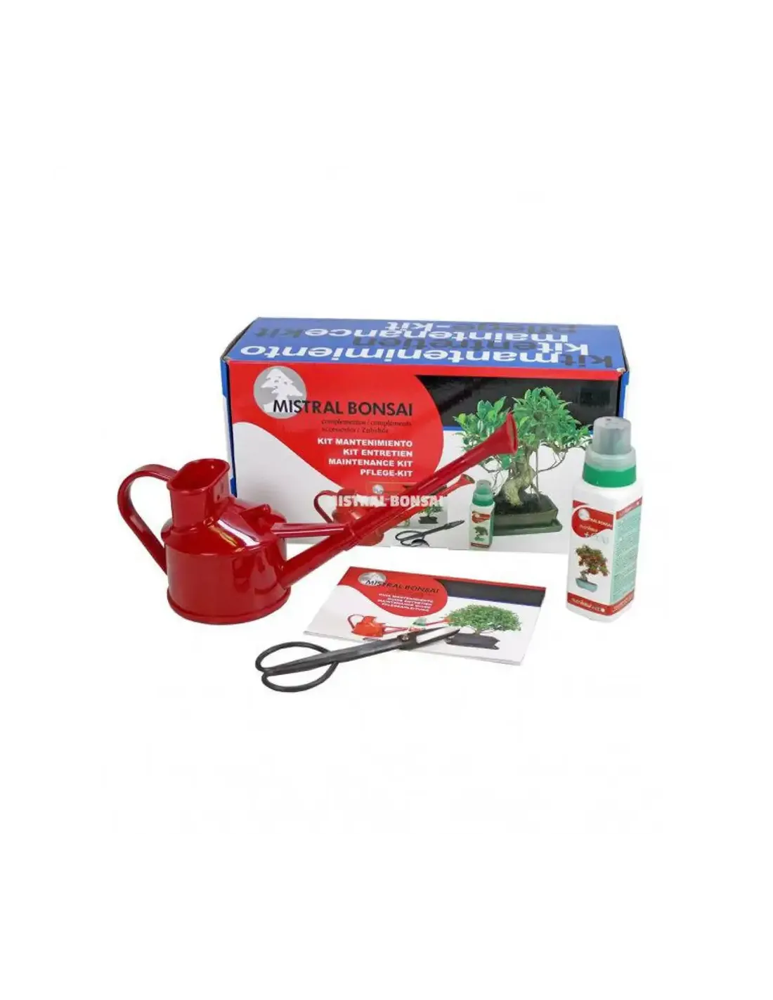 Composició del kit: una regadora vermella de 0,9 l. unes tisores fines de 190 mm. una ampolla de Nutribonsai eco i una guia de cures i consells.