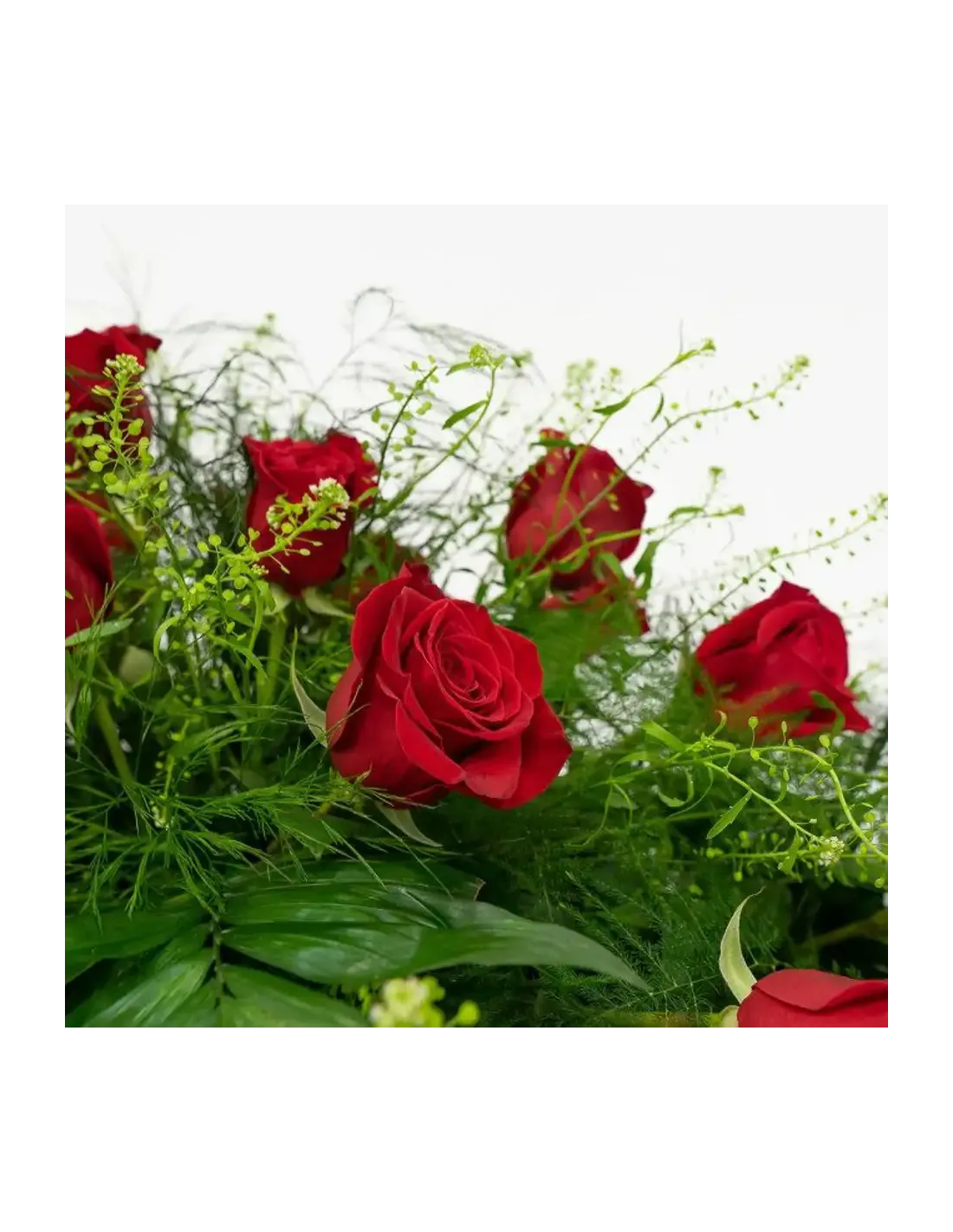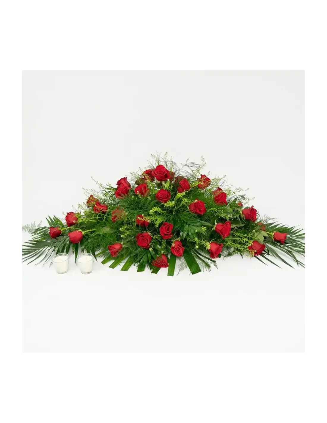 Un comiat sòbriu, elegant i profundament simbòlic. Aquest coixí funerari de roses tancades és un centre floral allargat dissenyat per col·locar-se sobre el taüt, transmetent respecte i amor etern en un moment de gran sensibilitat.