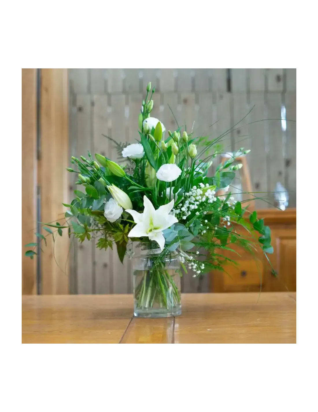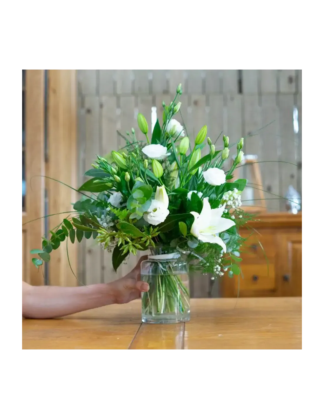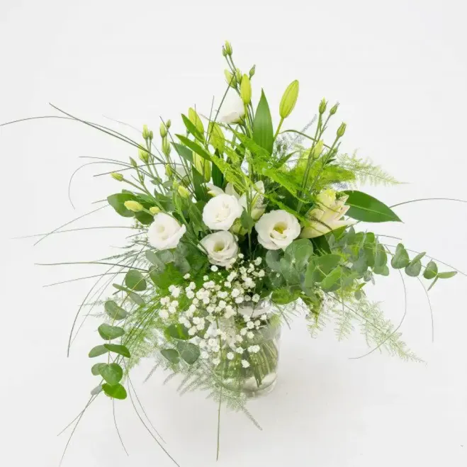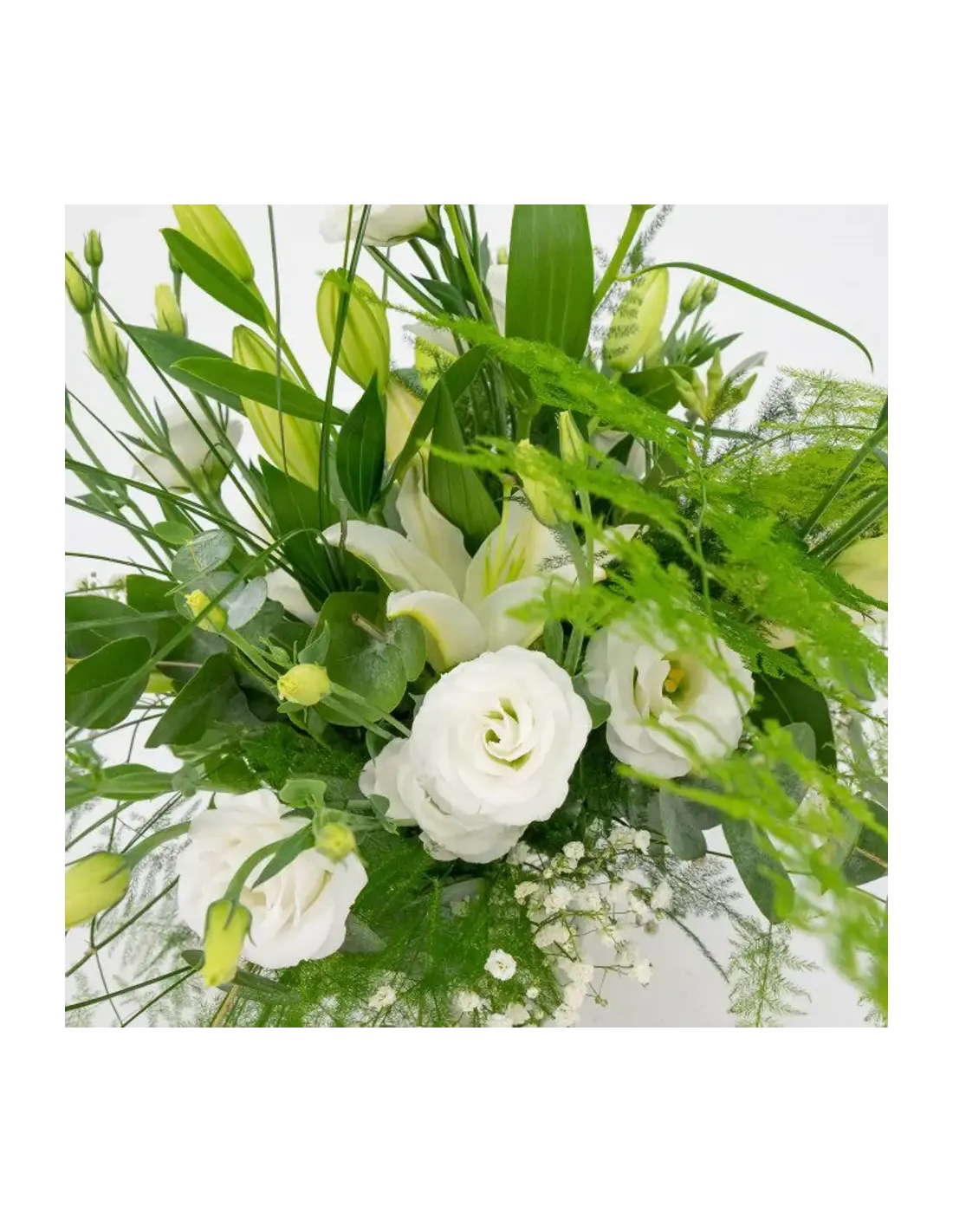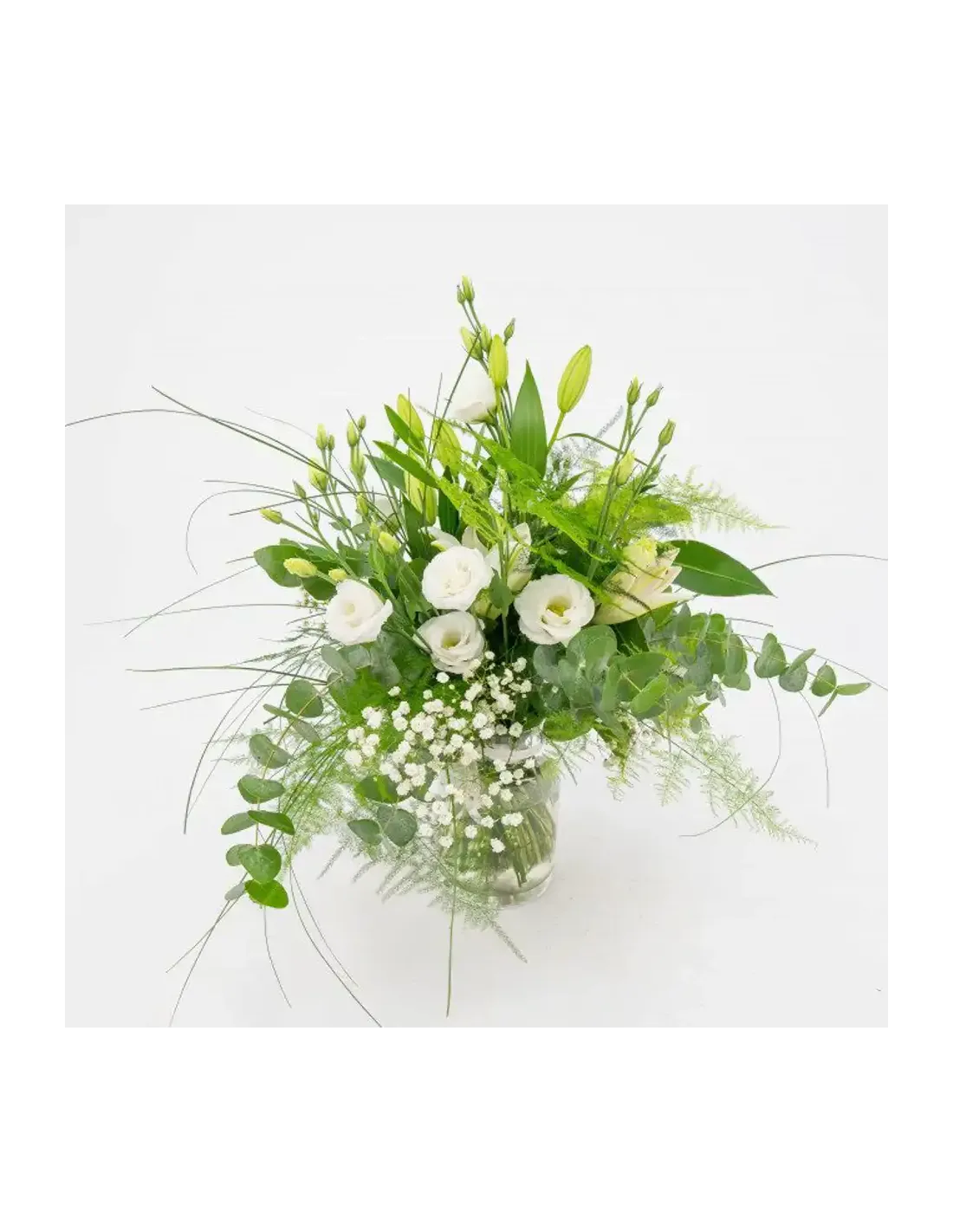 Dolç i natural! Perfecte per a regalar o il·luminar qualsevol habitació, un bell ram en blancs i follatge de temporada amb gerro inclòs. Si vols anar segur, el blanc mai falla. Regala aquest ram ple de llum i serenitat, amb elegants liliums casablanca i lisiantum blancs, i tocs romàntics amb paniculata blanca. Un disseny pur i espectacular.