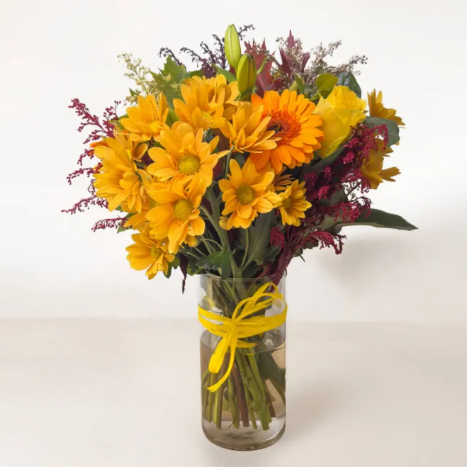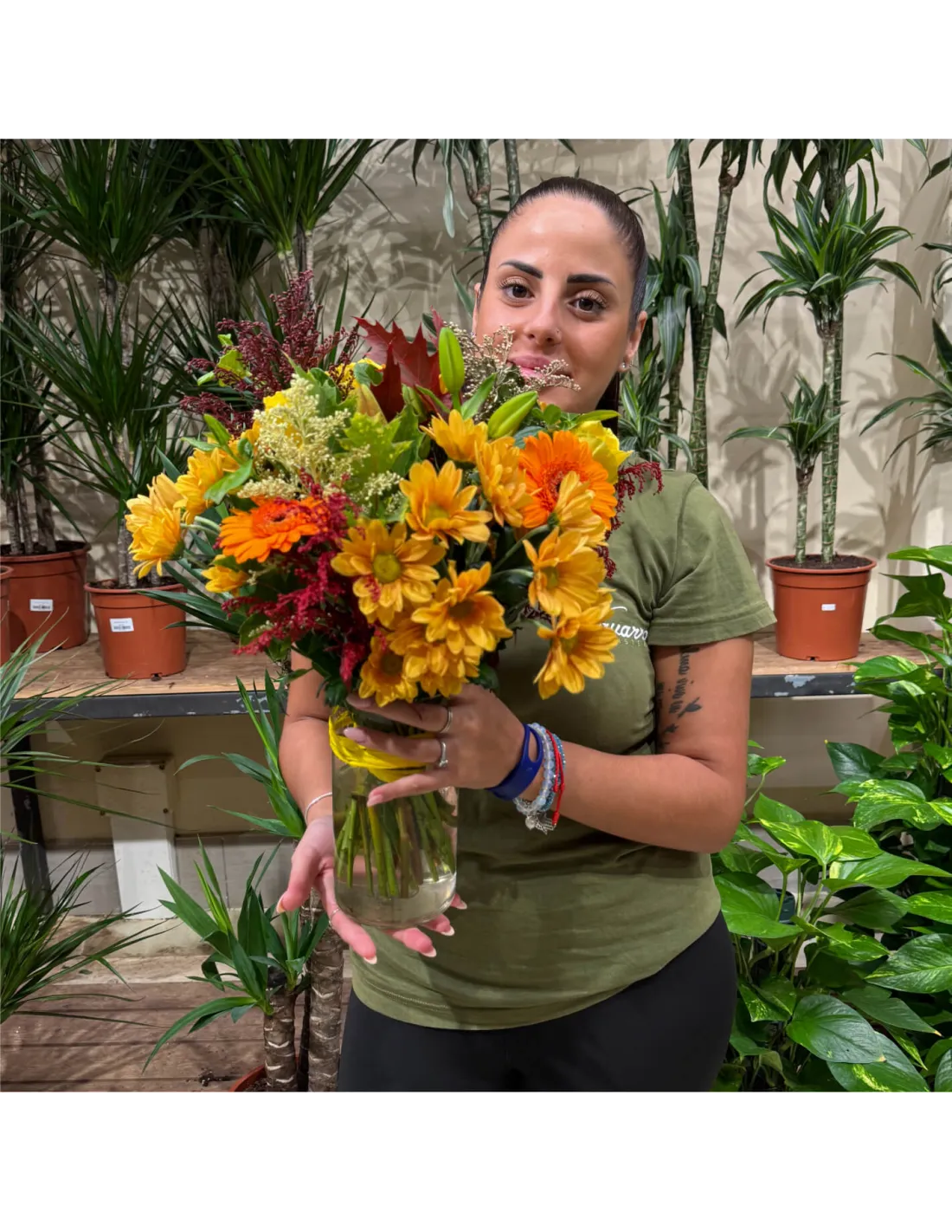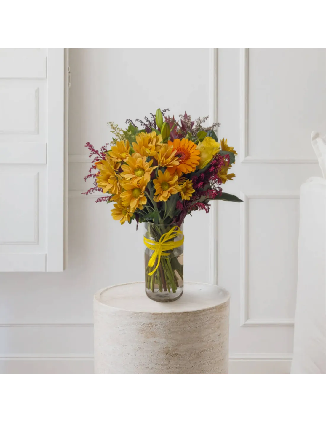 Petit en mida, però gran en encant. Aquest mini gerro de tardor reuneix flors de tons càlids com margarides daurades, gerberes taronja i tocs vermellosos que evoquen els colors més vibrants de l’estació. Una composició compacta, alegre i lluminosa, ideal per a escriptoris, tauletes o detalls plens de tendresa. El detall perfecte per dir “penso en tu” aquesta temporada.