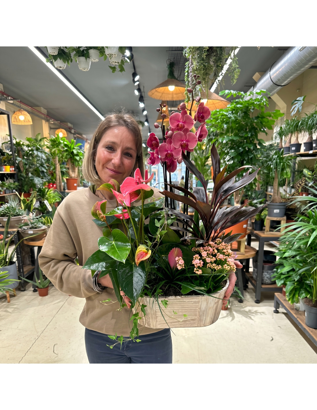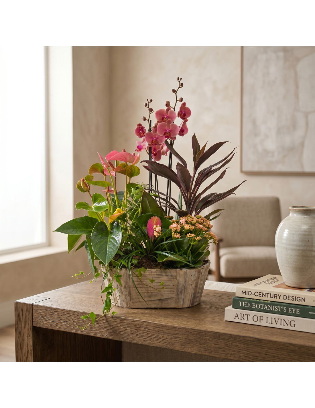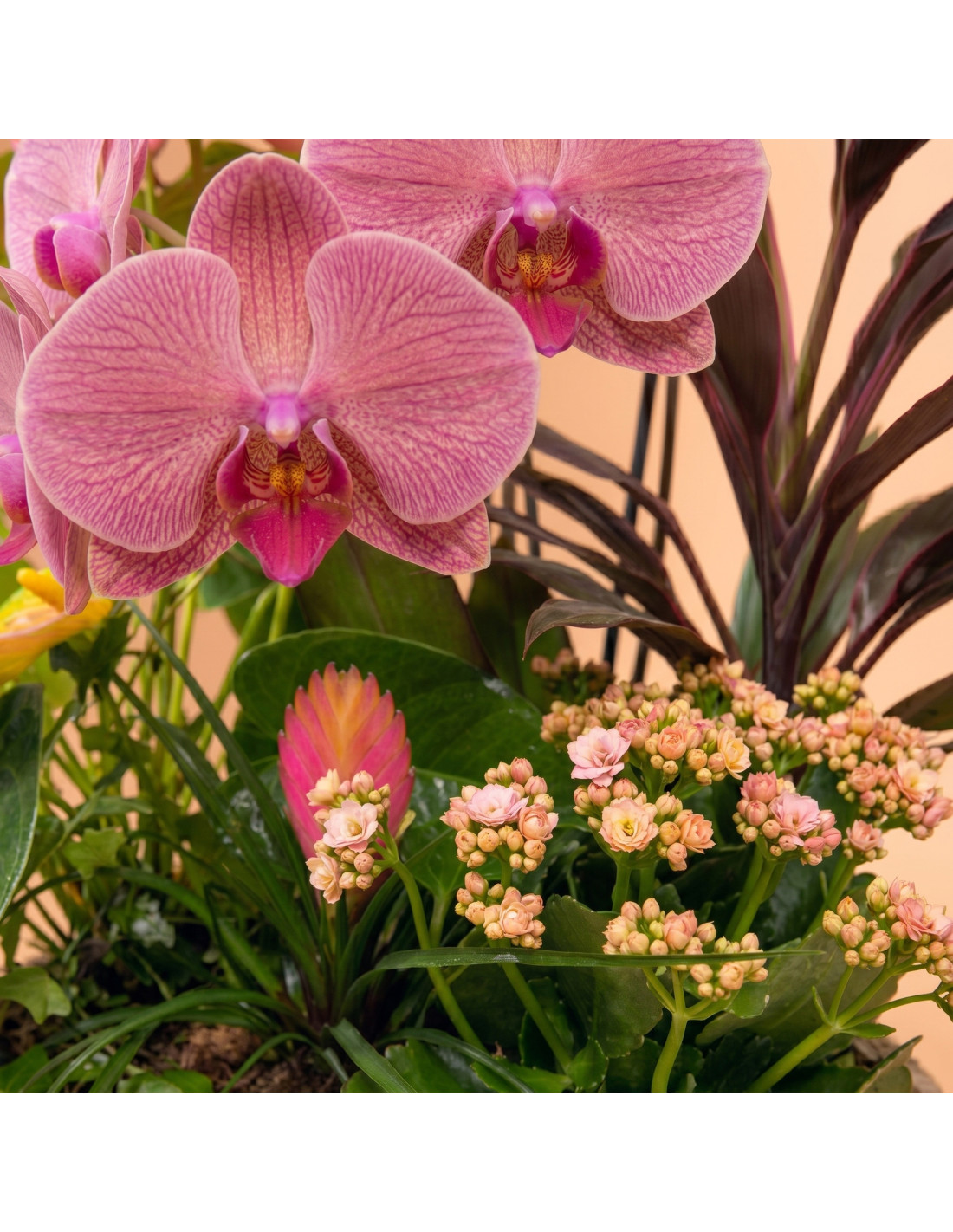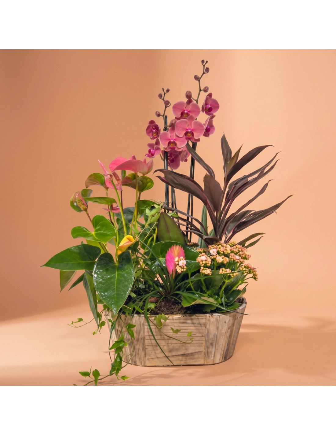 Orquídia rosa, anthurium rosa, cordyline, saintpaulia, tillandsia anita i heura, tot en una preciosa caixa de fusta. Un conjunt ple de suavitat i alegria floral. La base del producte pot variar segons la disponibilitat.