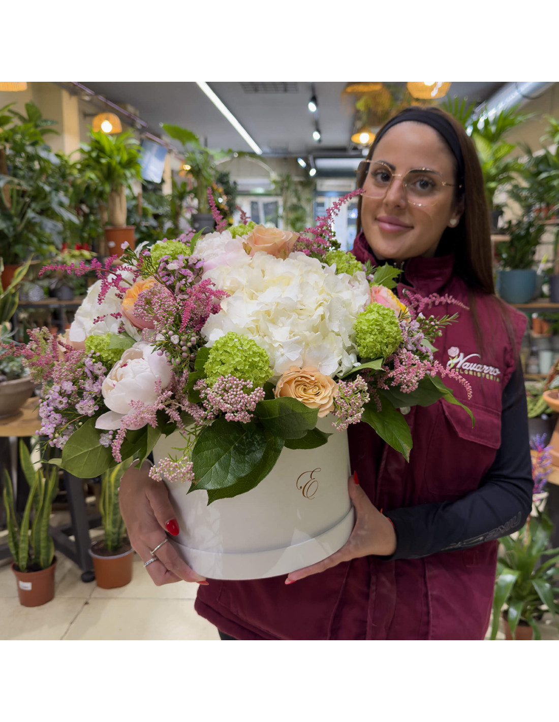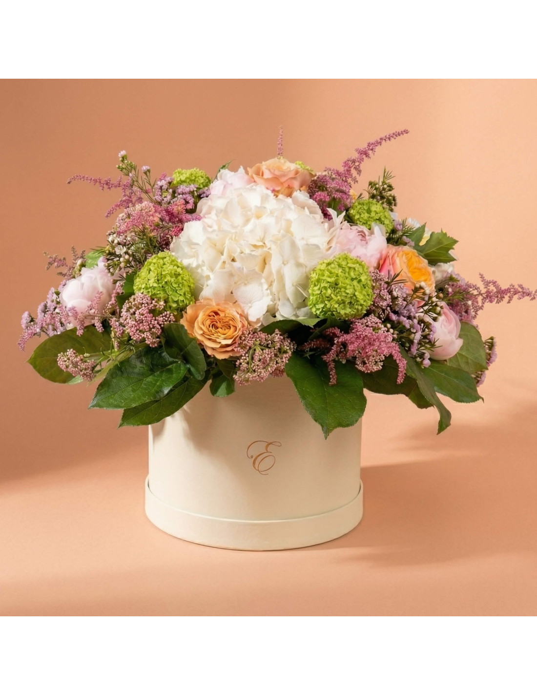 Al cor del disseny destaca l'hortènsia blanca, aportant un aire sofisticat i lluminós. Es combina amb la delicadesa de la peònia Sara Bernhardt, una de les flors més desitjades per la seva bellesa romàntica. Les roses garden en tons te i préssec afegeixen calidesa i un toc lleugerament vintage, mentre que el viburnum roseum aporta contrast amb el seu vibrant verd.