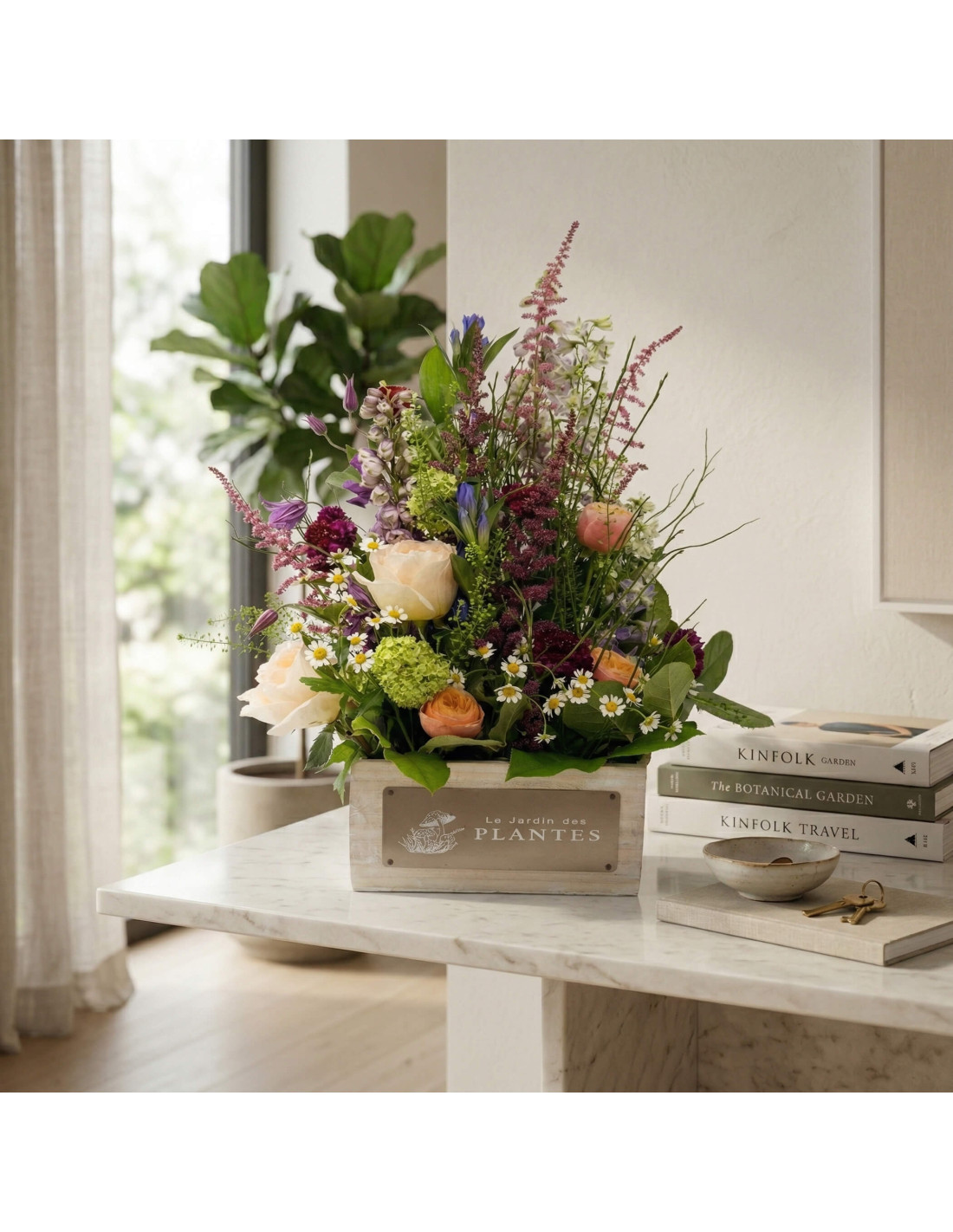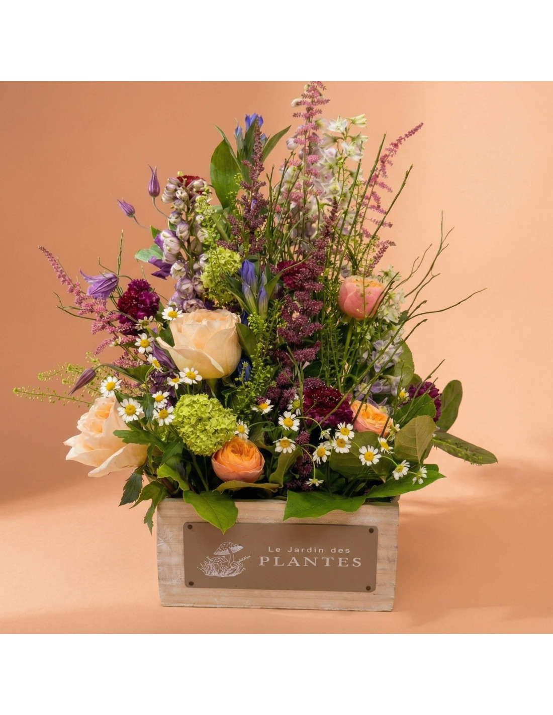 El conjunt s'enriqueix amb la lleugeresa de l'astilbe en fúcsia i rosa, el toc delicat de la clematis, la frescor vibrant del viburnum roseum i els detalls encantadors de la matricària (aquelles margarides petites que evoquen camps infinits). El thlaspi, per la seva banda, aporta aquest acabat natural que fa que tot flueixi amb harmonia.