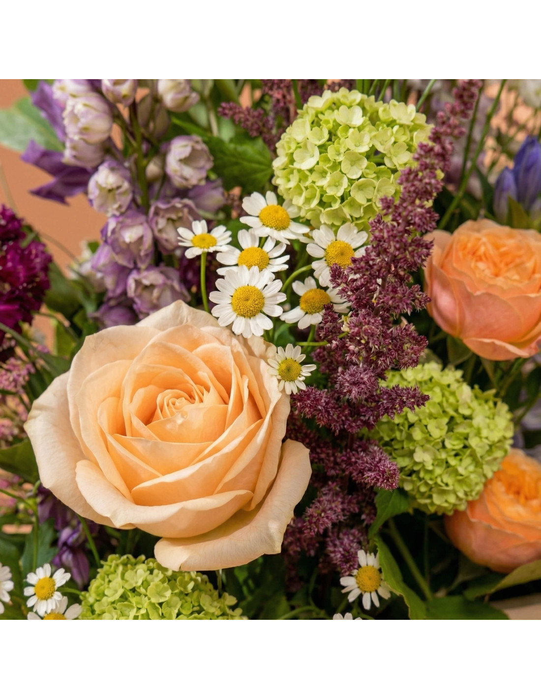 Els delfinium en tons lila i blau aporten verticalitat i frescor, creant una sensació de llibertat visual. Les roses guarden en tons salmó i préssec equilibren el conjunt amb la seva elegància suau i romàntica. Entre elles, apareixen petites joies botàniques com la scabiosa i la gentiana, que afegeixen profunditat i contrast.