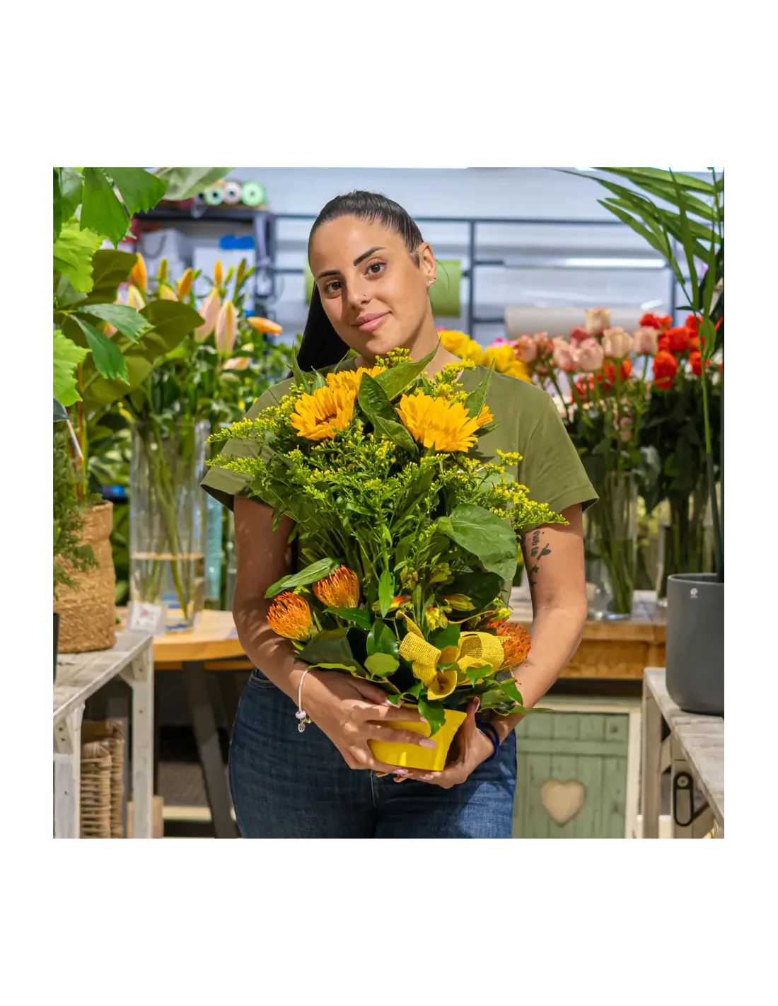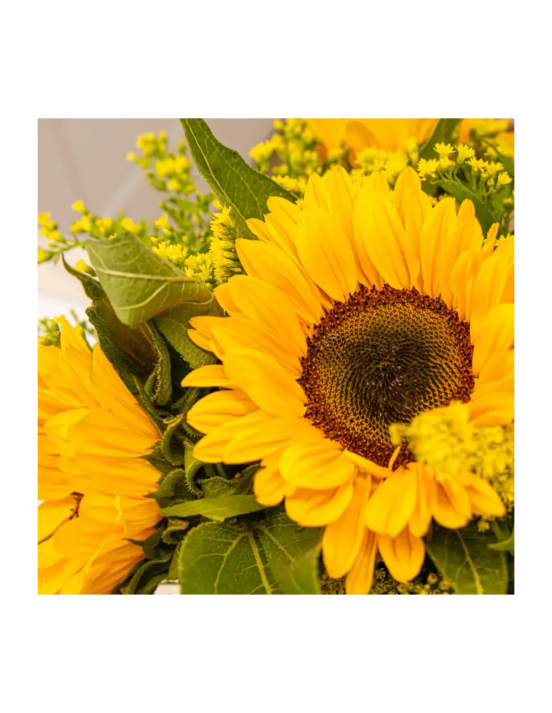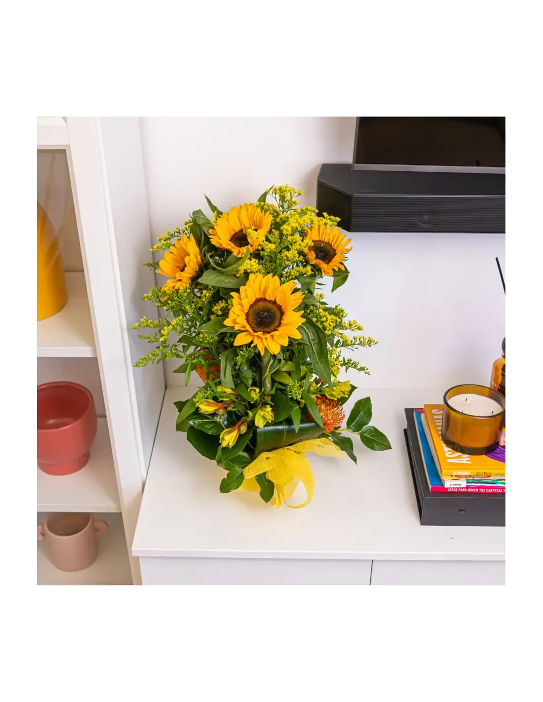 Descobreix el nostre vertical de gira-sols, una creació única amb 5 gira-sols, 1 pom solidago, 3 leucospernus taronja, 3 tiges alstromelia amariila.