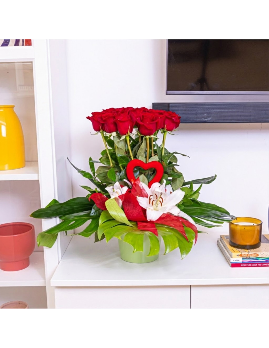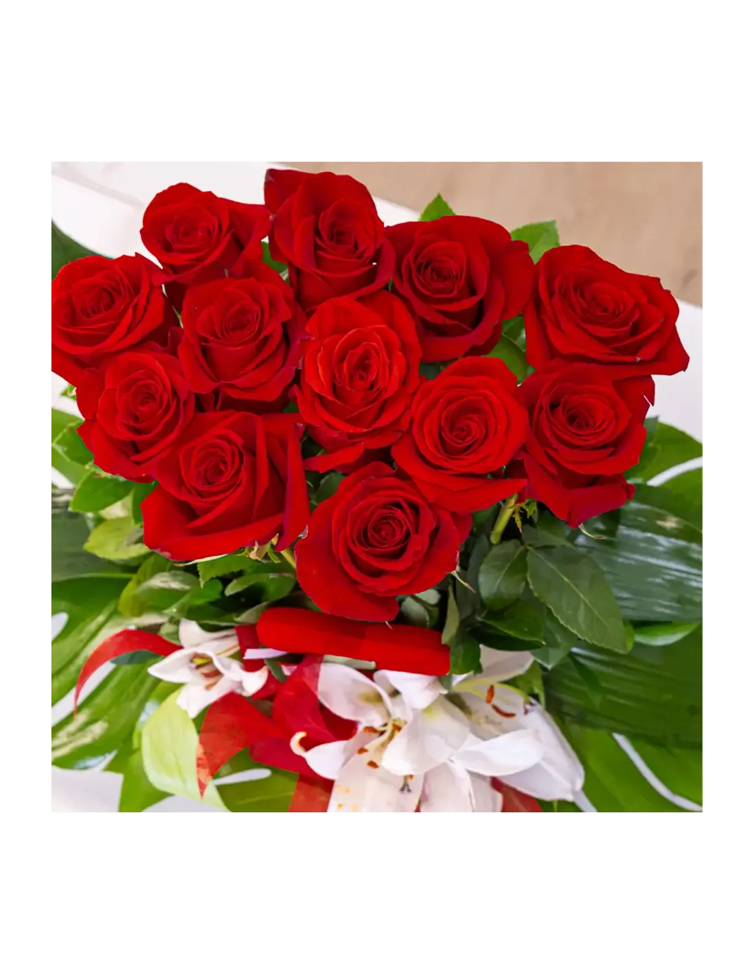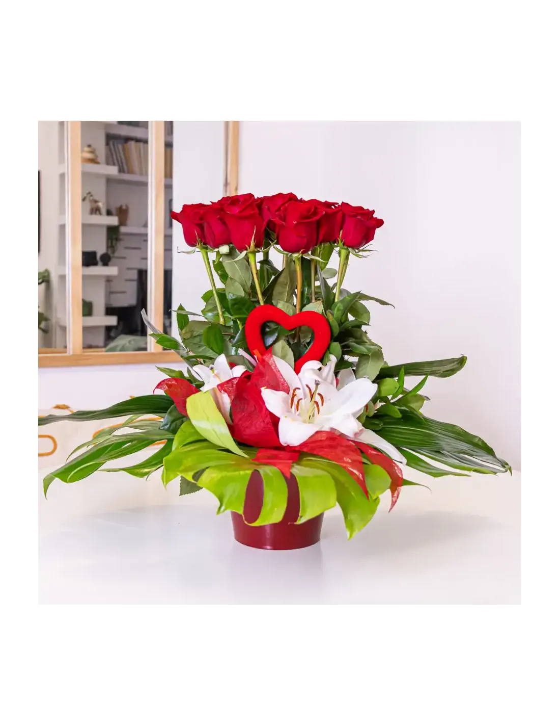 Sorprèn el teu ésser estimat amb el nostre impressionant Centre de 12 Roses Rojas! Aquest arranjament floral únic presenta 12 belles roses vermelles disposades verticalment, creant una declaració d'amor que s'eleva literalment per sobre de la resta. Per afegir un toc especial, hem inclòs detalls de lilium que aporten un encant extra a aquest centre elegant. Els verds decoratius complementen perfectament les roses, creant una combinació visualment impactant.