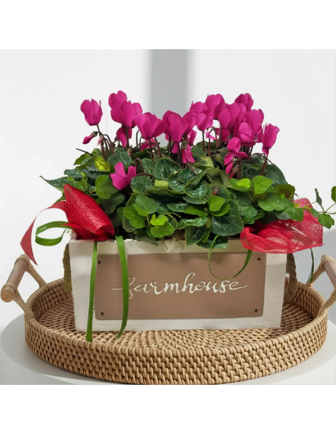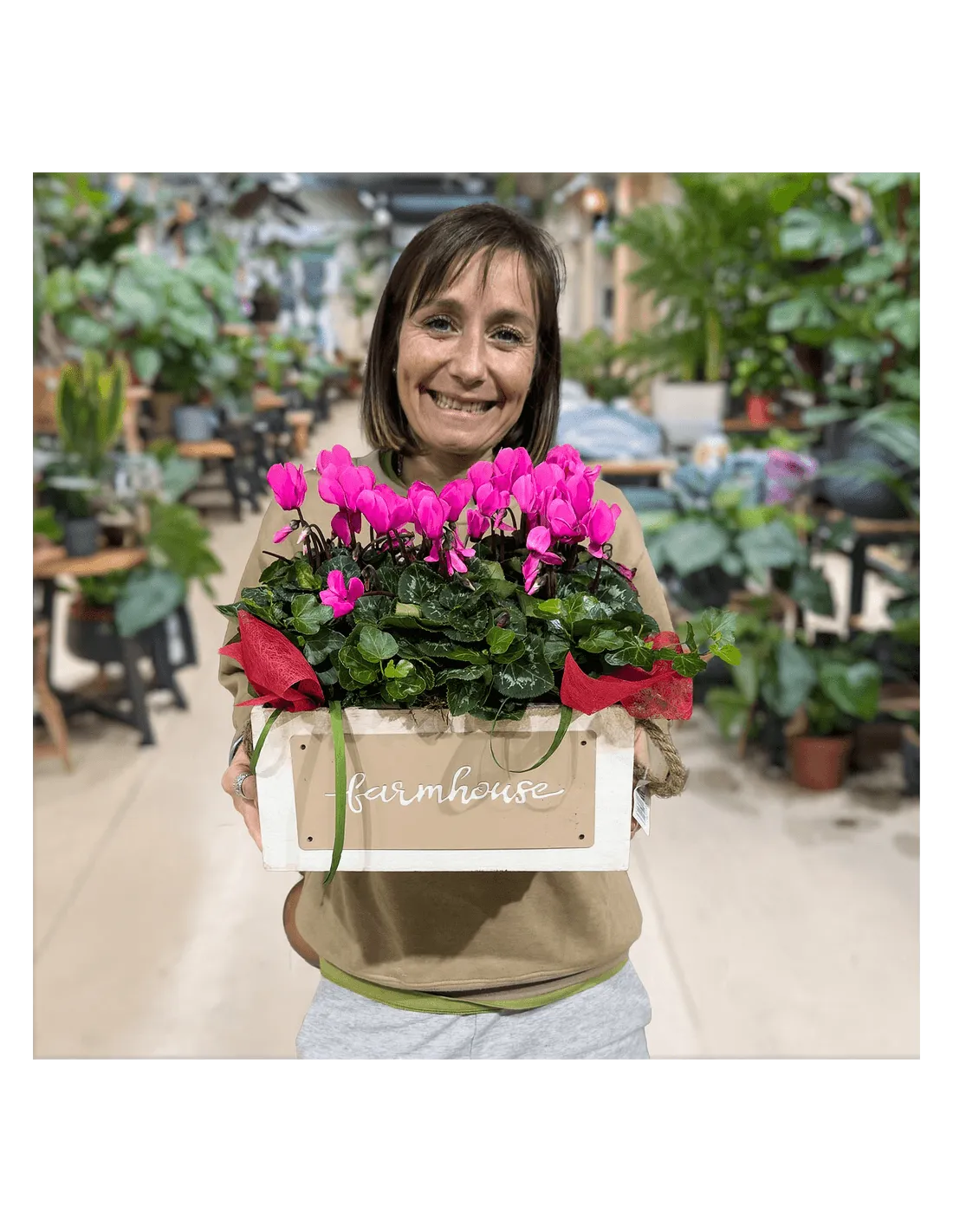 Amb la seva floració vibrant i un toc rústic encantador, aquesta composició de ciclàmens és una autèntica explosió de color i alegria. La caixa de fusta estil farmhouse ressalta el contrast amb les fulles verdes i les flors vermelles, creant una peça que dona vida a qualsevol racó. Ideal per decorar terrasses, entrades o interiors amb bona llum. Els ciclàmens són resistents al fred i fàcils de mantenir: bellesa natural amb esperit acollidor.