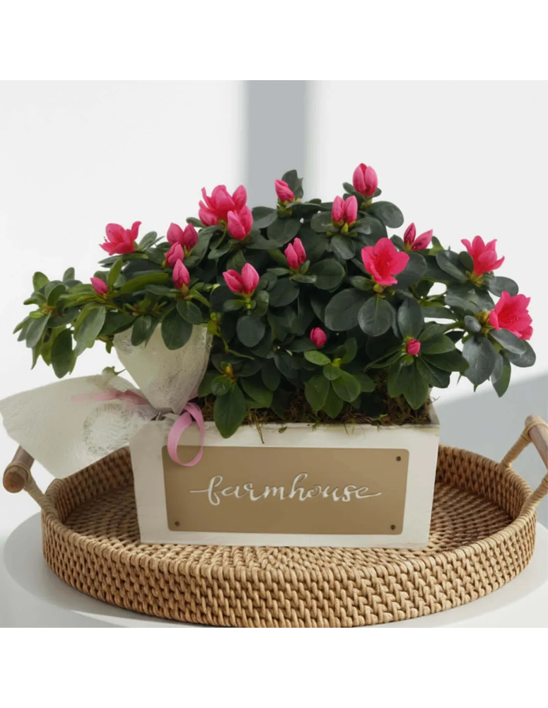 Delicada i amb un aire romàntic, aquesta composició d’azalees blanques en caixa farmhouse aporta llum i serenor a qualsevol espai. Les seves flors, suaus i abundants, contrasten amb el verd intens del fullatge i l’estil natural de la base de fusta. Perfecta per a interiors lluminosos o per sorprendre amb un regal diferent a Barcelona. Les azalees floreixen durant setmanes i no necessiten gaire manteniment: bellesa pura amb molt poc esforç.