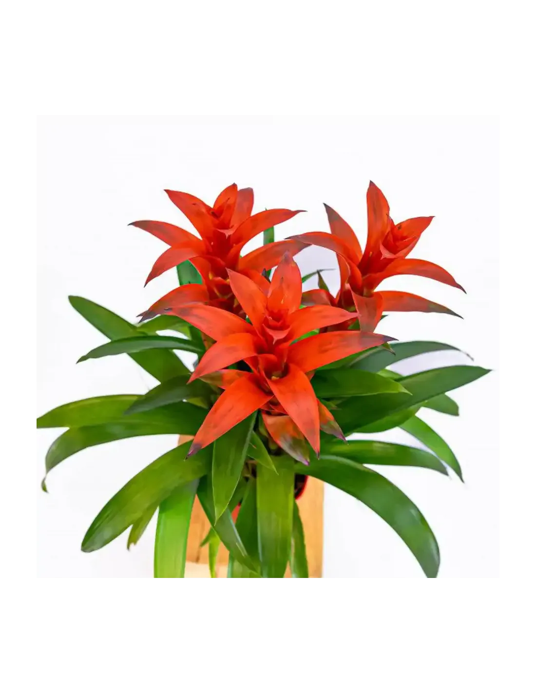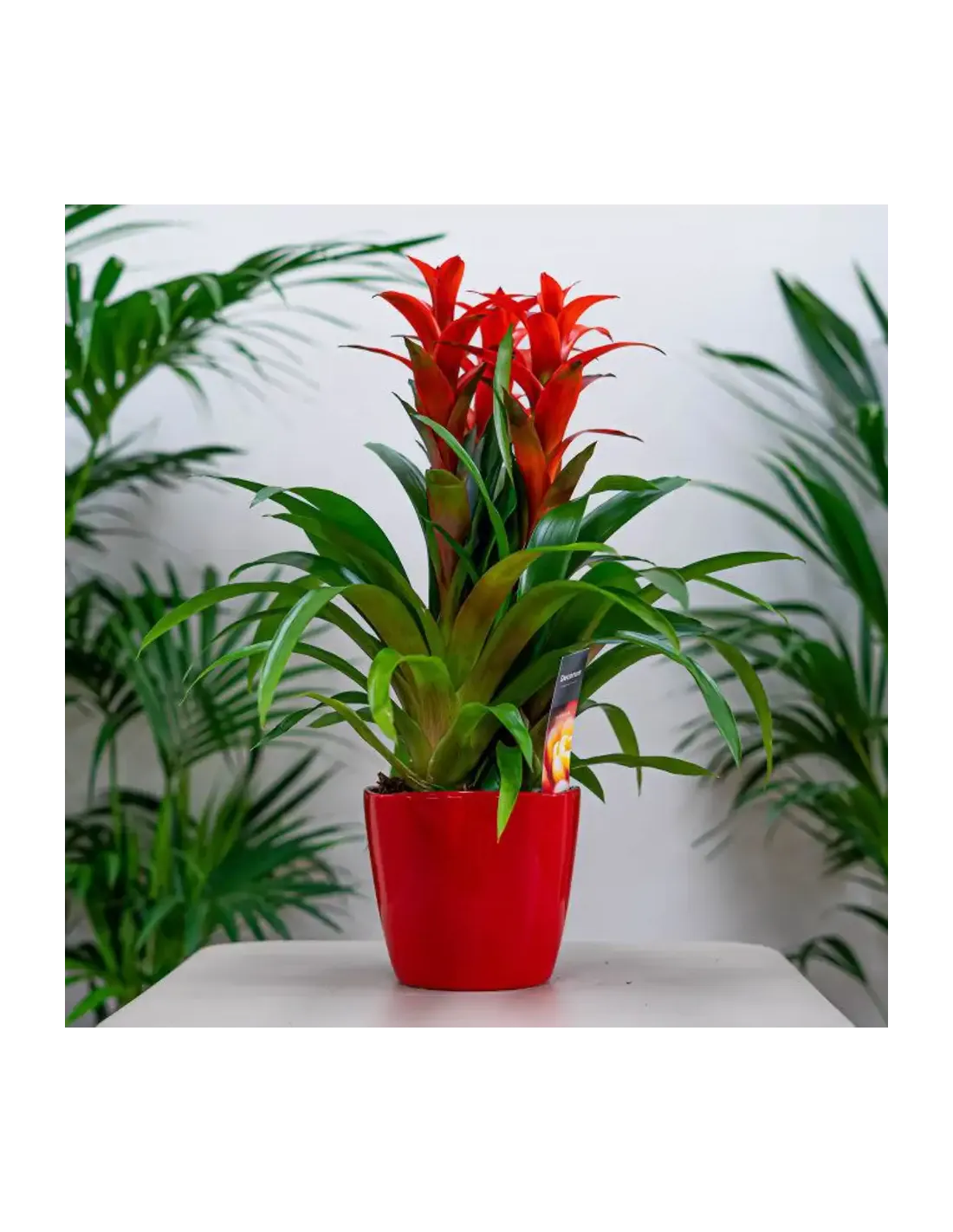Preciós gerro de ceràmica amb 3 guzmànies, una planta d´interior molt forta i amb gran colorit. Fàcil de cuidar. Ideal per decorar el teu saló