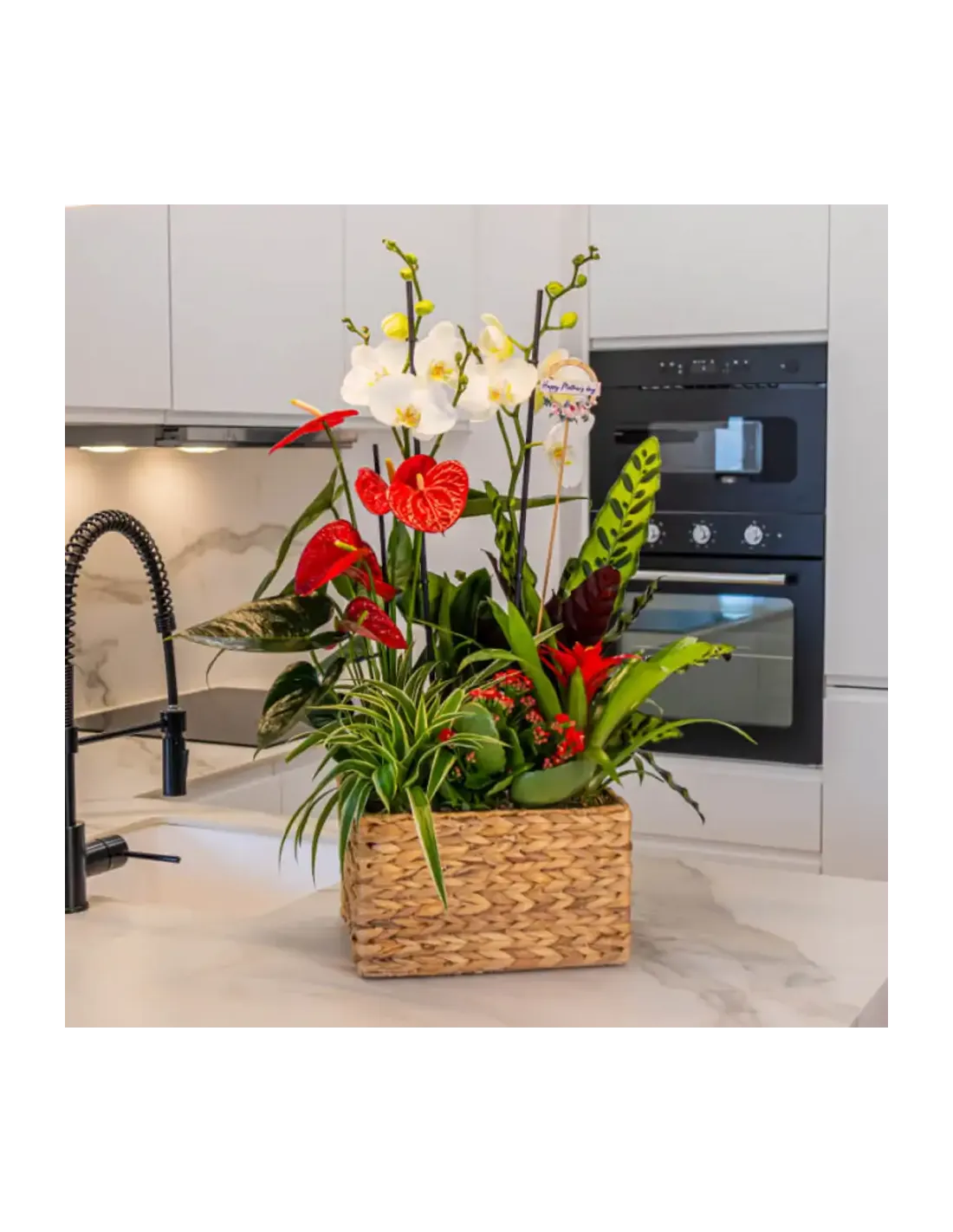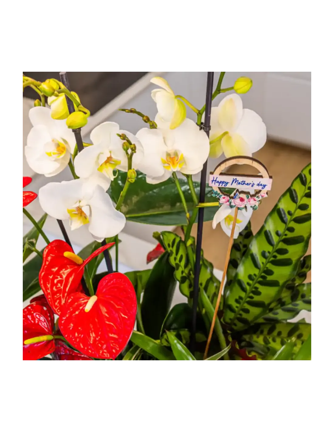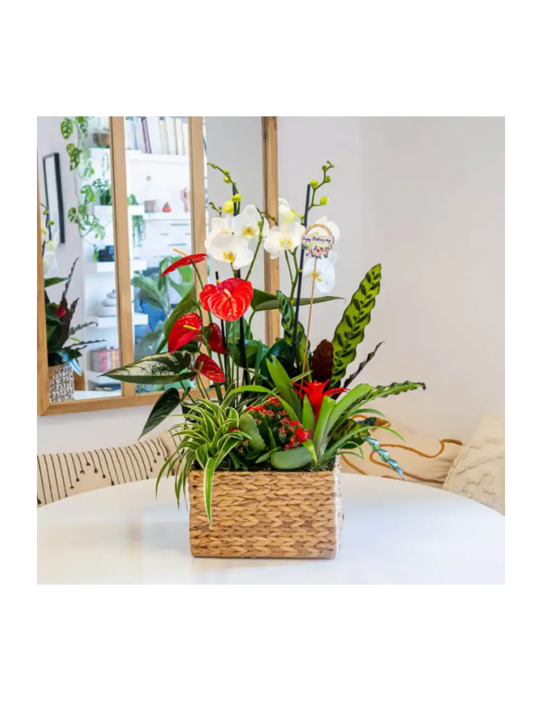 Celebra la bellesa exòtica amb el nostre encantador grup de plantes. Des de l'elegància de l'orquídia fins a la vivacitat de l'anthurium vermell i la bromèlia vermella, cada planta és una obra d'art natural. Aquest regal és una expressió perfecta d'amor i gratitud cap a la mare al seu dia especial. Un toc de frescor i exotisme que il·luminarà la llar i el cor.