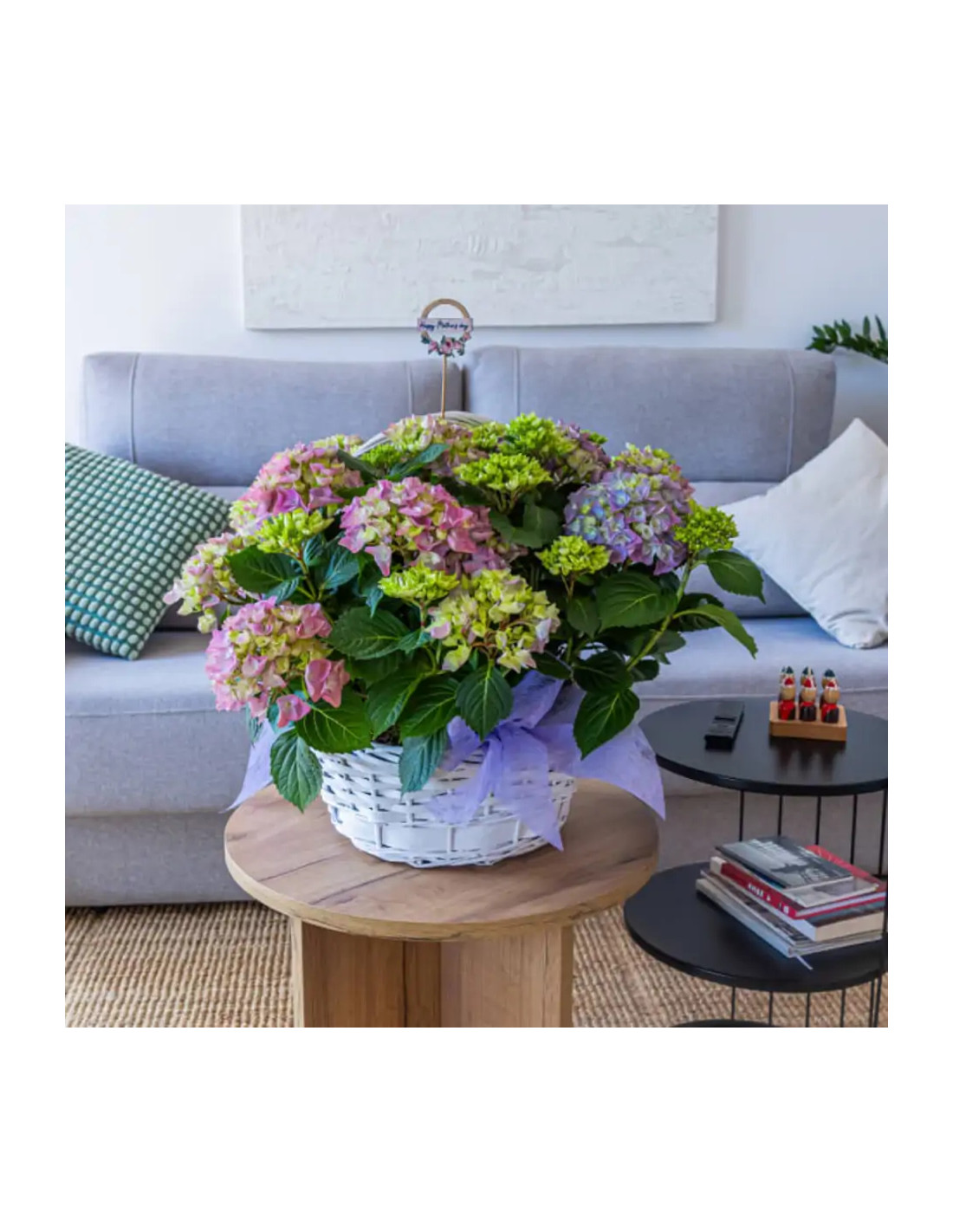 Embelleix casa teva o jardí amb la nostra exclusiva cistella de vímet, que conté exuberants plantes d'hortènsies. Aquesta combinació perfecta de rusticitat i sofisticació ofereix una decoració natural que perdura, brindant frescor i vitalitat a qualsevol espai