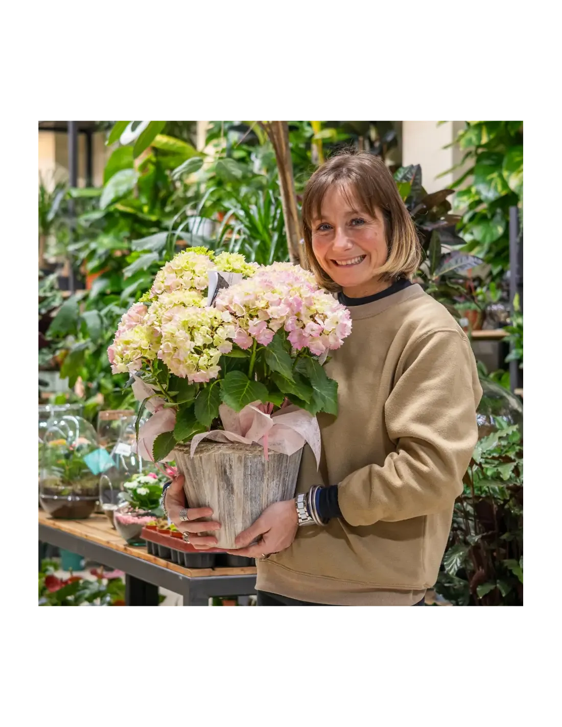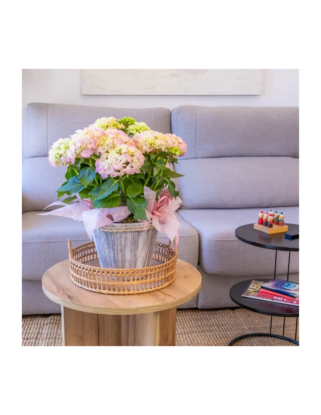 Hortènsies fresques sobre base de fusta natural. Una proposta elegant, romàntica i plena de color per celebrar la bellesa del que és senzill.