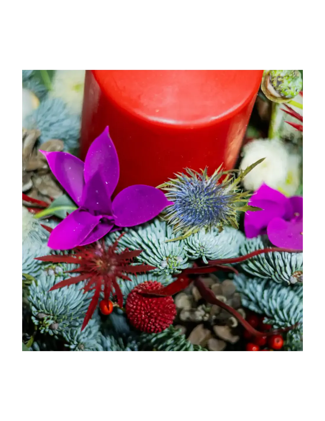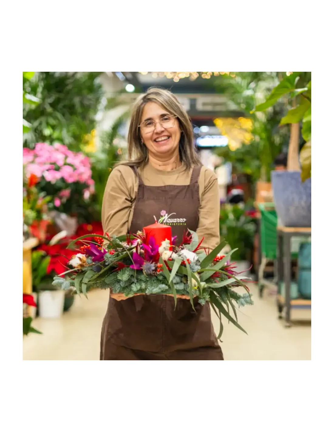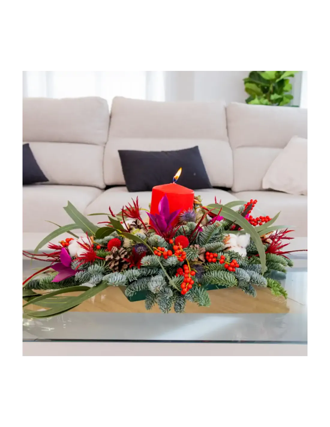 Una fusió harmoniosa d'elements naturals és el nostre Centre de Taula Allargat compost per 4 delicades flors de cotó, petites branques d'ilex, tiges d'eucaliptus bola, craspedies vermelles, branques d'avet, pinyes petites, 2tiges d'Erengium i tiges de ruscus lila s'entrellacen per crear un refugi hivernal a la teva taula.Un bonic centre de taula nadalenc on els tons verds es destaquen elegantment al voltant d'una espelma brillant, mentre que les craspèdies vermelles afegeixen un toc càlid i acollidor a l'ambient. Et convidem a submergir-te a la màgia de la temporada amb encant i festivitat.