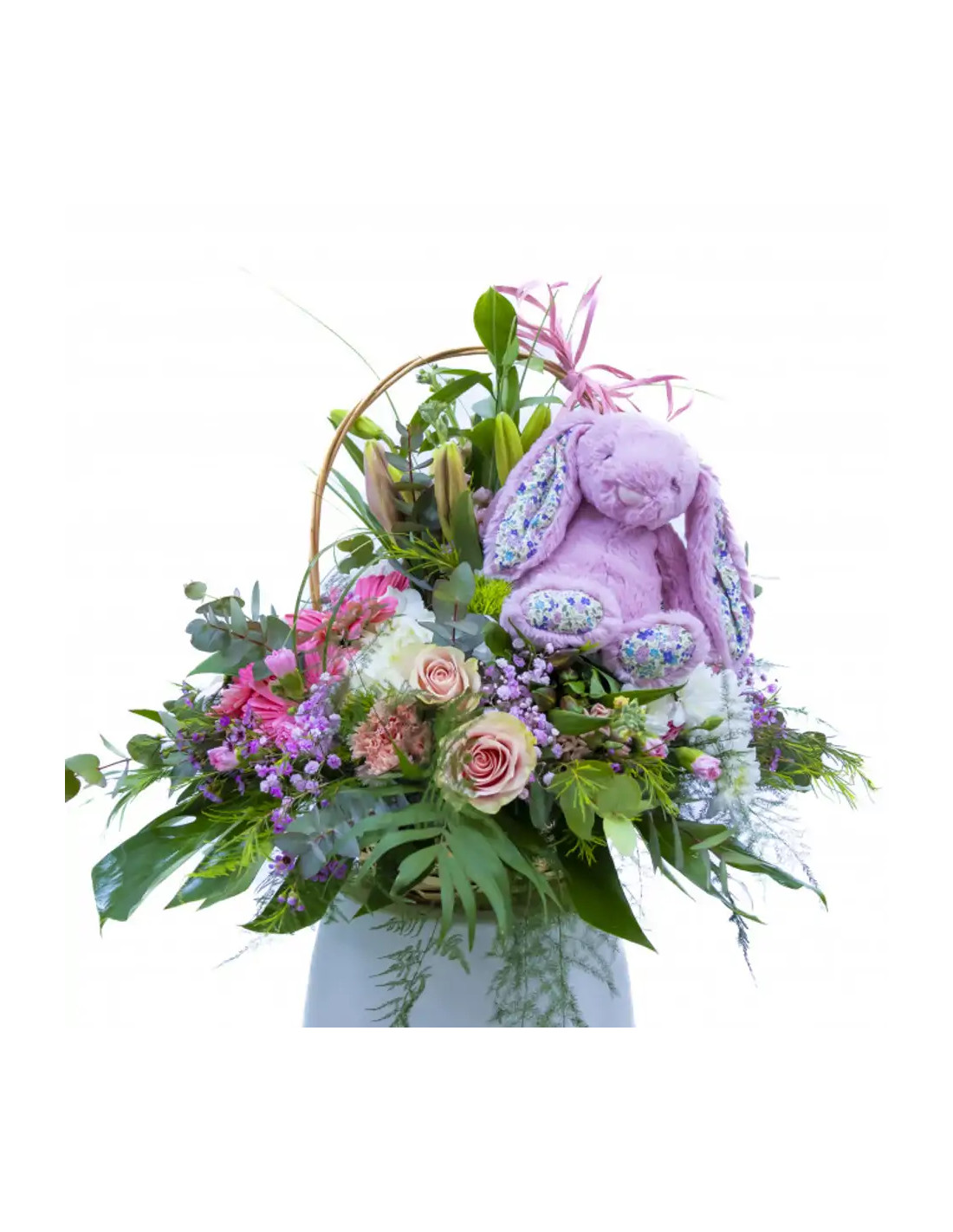 Celebra l'arribada del nou nadó i fes que els nous pares se sentin especials amb aquesta bella cistella de flors variades amb peluix. La cistella de flors variades inclou una bella selecció de flors fresques i vibrants, cada flor ha estat acuradament seleccionada per la seva bellesa i capacitat per transmetre els sentiments d'amor i felicitat que envolten l'arribada del nounat. (el peluix pot ser diferent del de la foto)