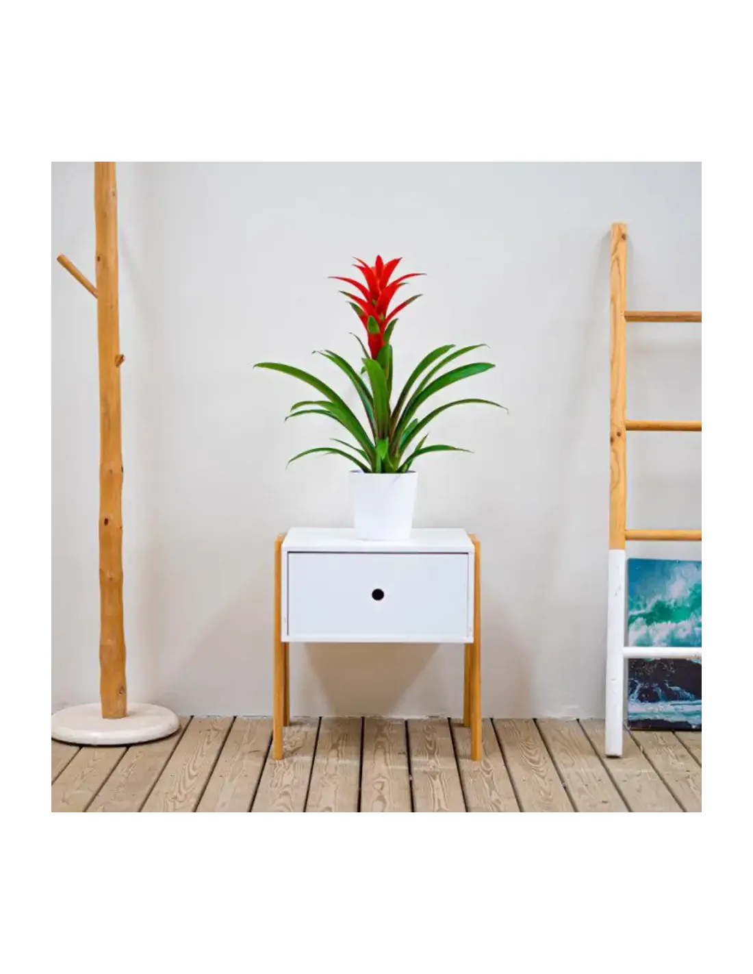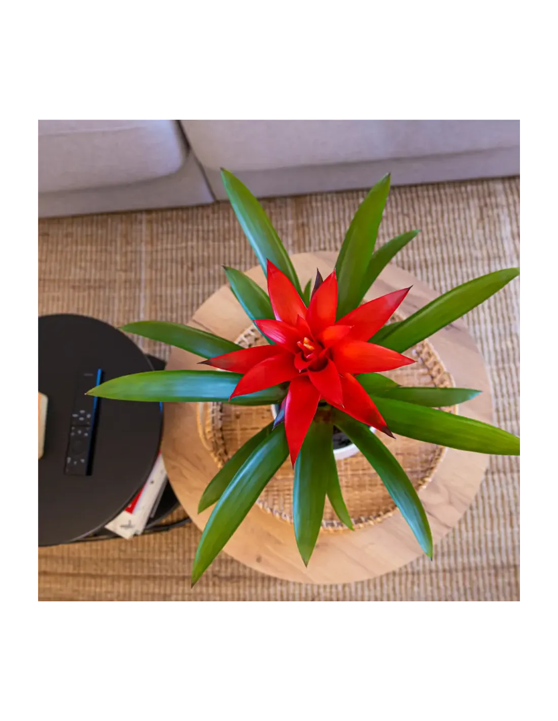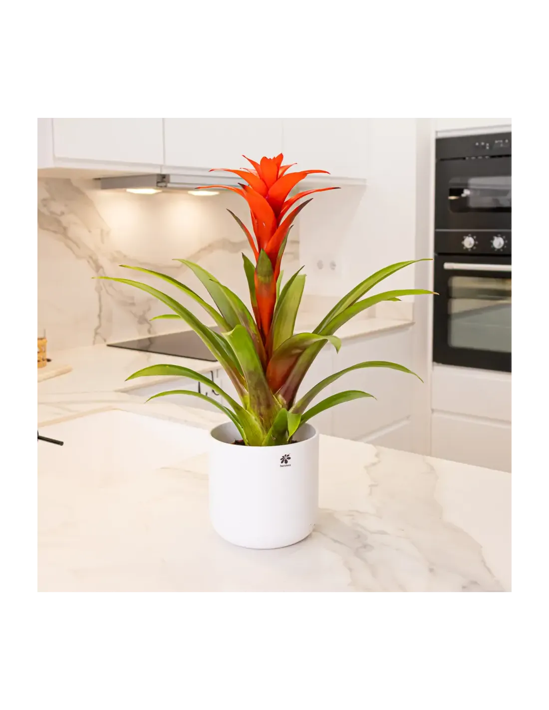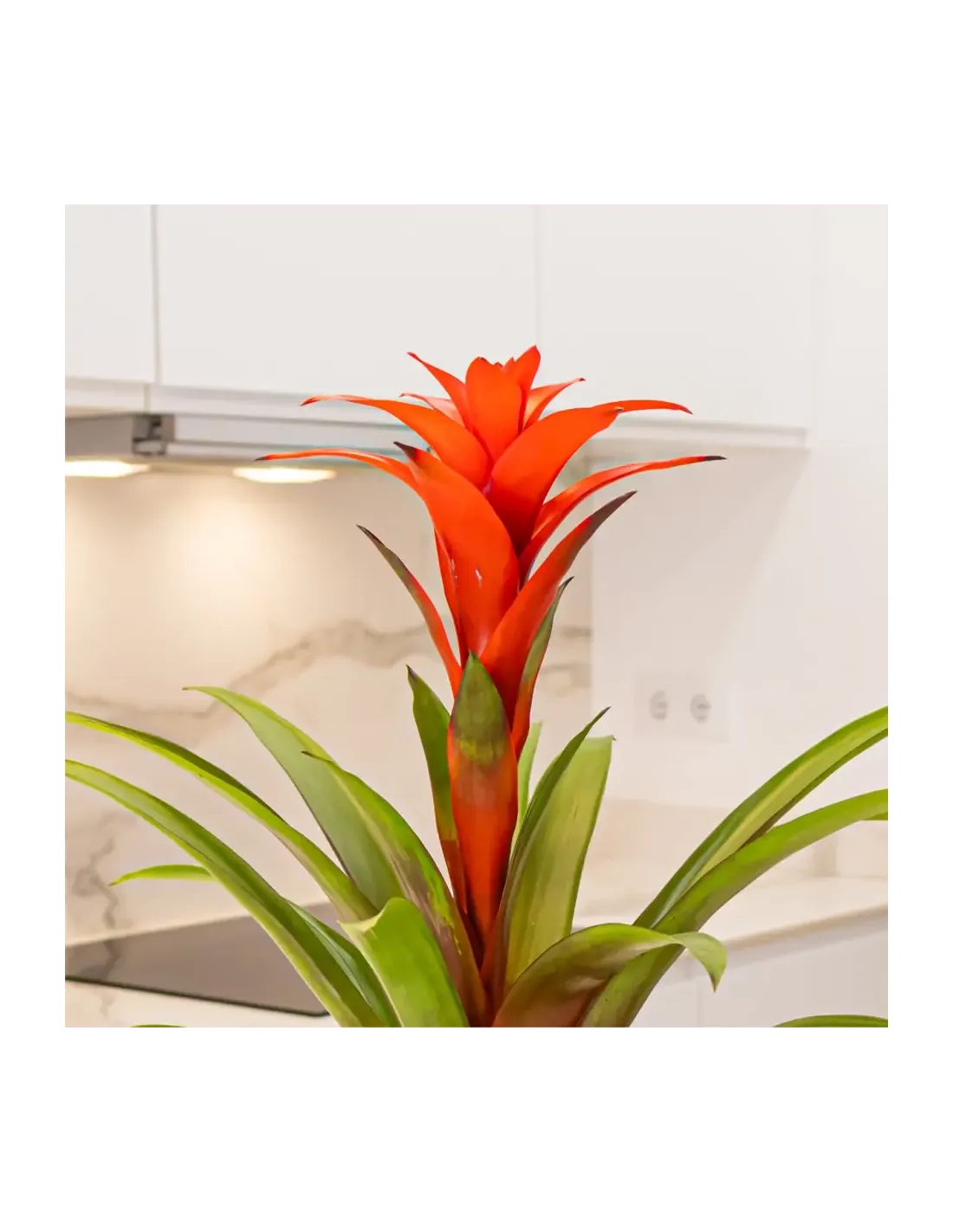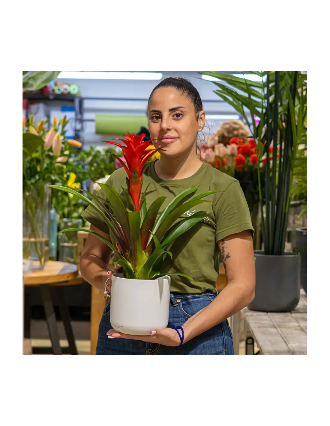 Plantes que produeixen bràctees de color intens que duren fins a dos mesos. ( test no inclòs) La Guzmania és la Bromèlia amb la flor més cridanera de tota les Bromeliàcies. Originària de zones tropicals d'Amèrica, bosc humits de l'Índia i de Sud-amèrica. Fulles verdes que es disposen en roseta i que presenten el característic dipòsit d'aigua com en la gran majoria de les Bromèlies. Les seves inflorescències apareixen en forma vertical i que poden ser de molts colors segons la varietat, des de vermells, ataronjats, liles, grocs etc.