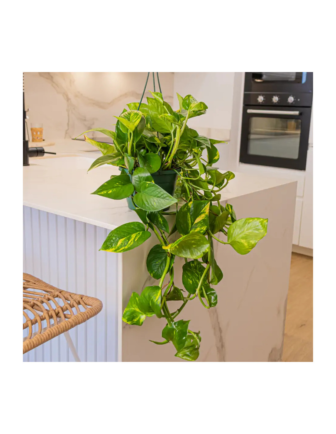 Planta d'interior molt resistent que pot ser conreada com a planta trepadora o de penjar (Test no inclòs) El pothos és una planta que igual que podem fer que pengi, també pot grimpar. Planta resistent que requereix llum tamisada de finestra. Podem realitzar esqueixos de les parts més noves de la planta perquè es reprodueixi, o bé per a tornar a plantar-los en el test i aconseguir una mata més densa. Podrem convertir nostre pothos de penjar en una planta trepadora, només amb col·locar un tutor enmig del test per a ajudar-la a créixer en vertical. Quan els pothos pengen, les fulles són més petites. Només hem d'esperar que la planta pugui grimpar per a veure com augmenta la grandària de les seves fulles de manera considerable.