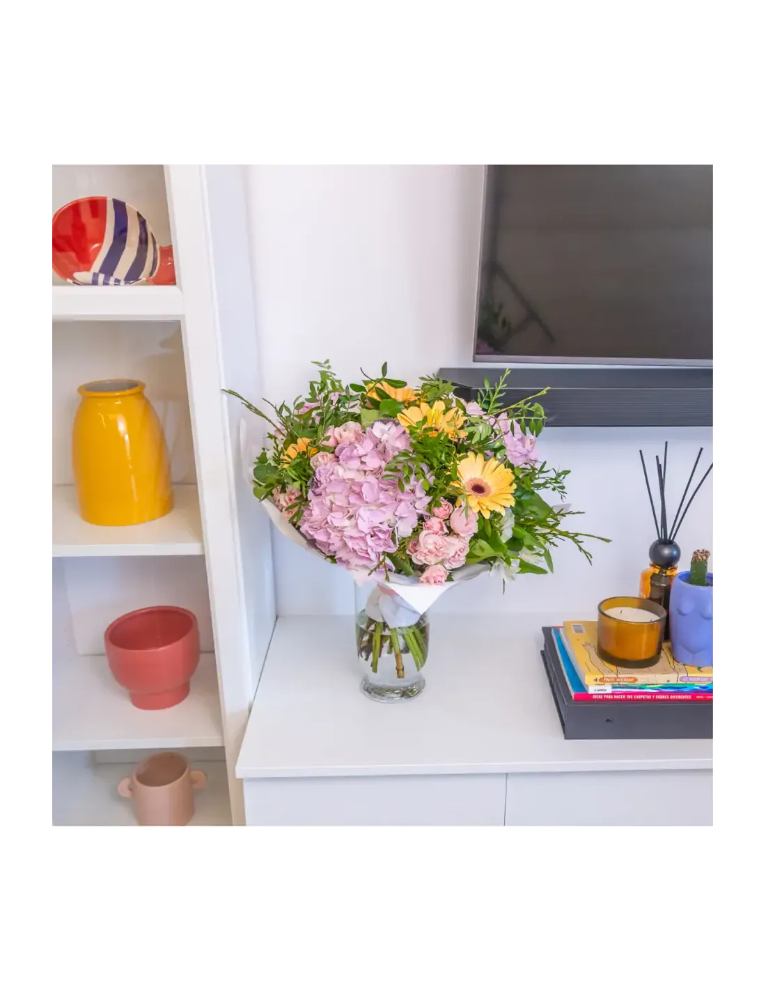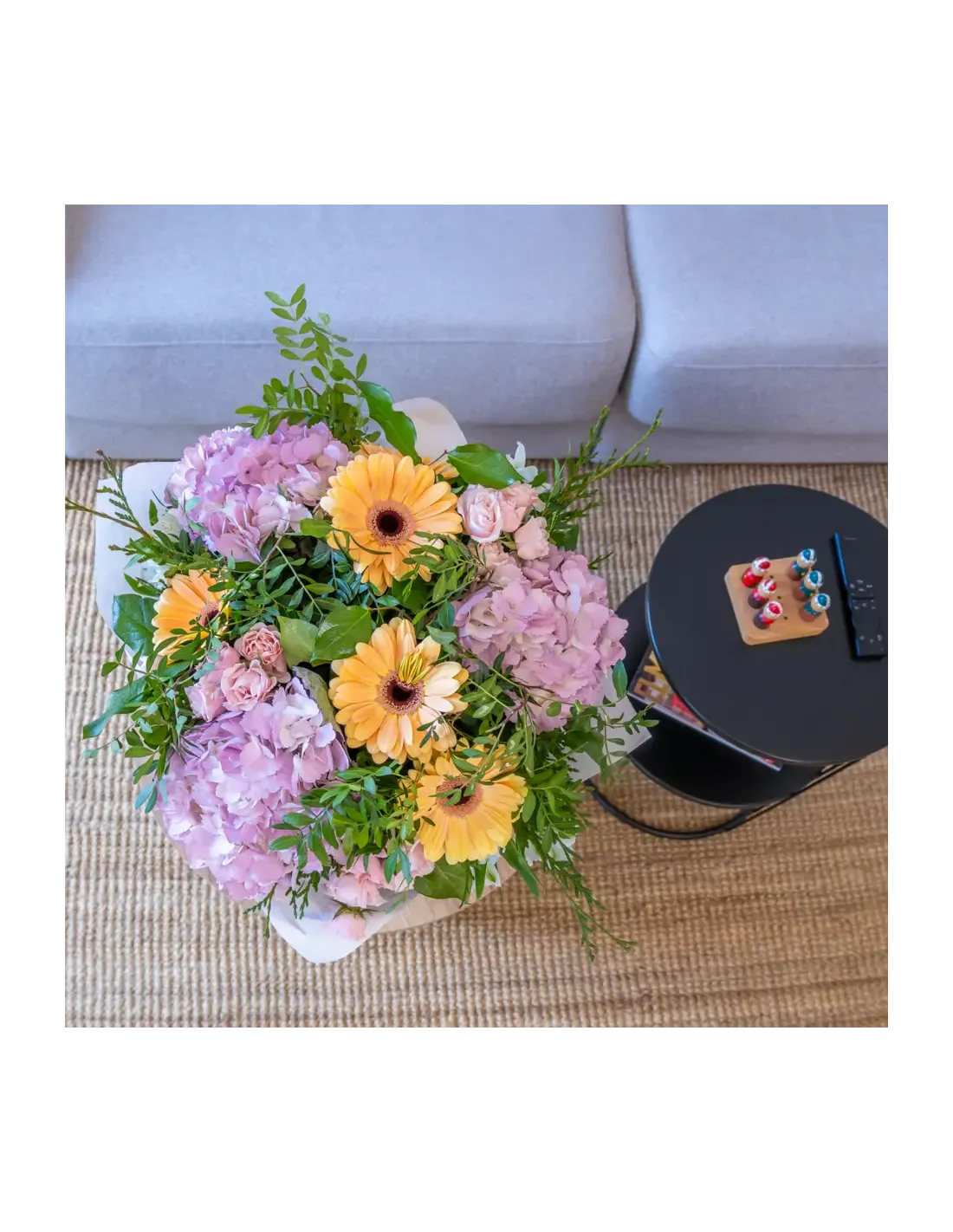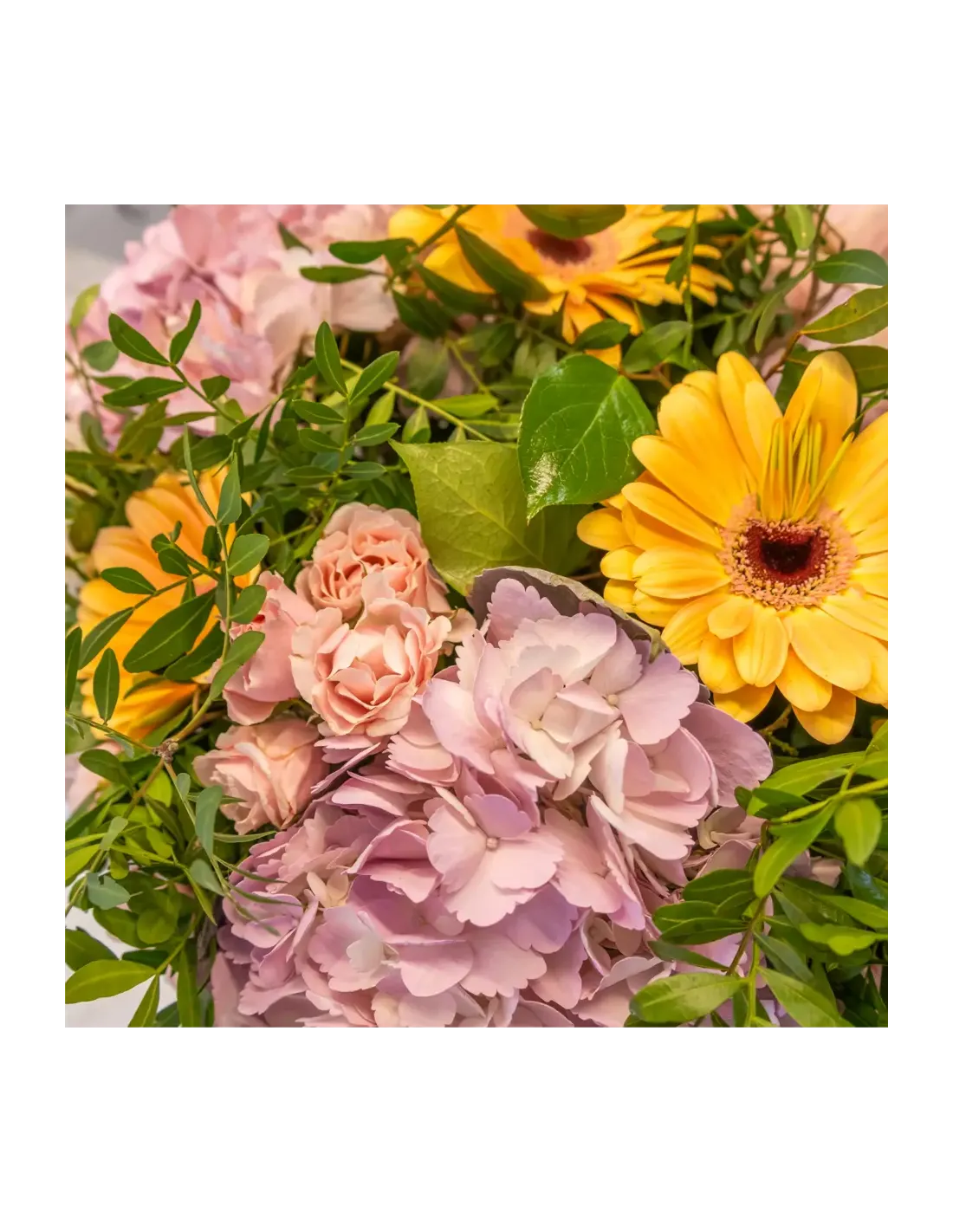 Un ram delicat i ple de tendresa, pensat per transmetre afecte sincer. Les seves hortènsies i alstroemèries en tons suaus es combinen amb roses spray i gerberes que aporten frescor i alegria. Perfecte per dir "t’estimo" de la manera més dolça.
