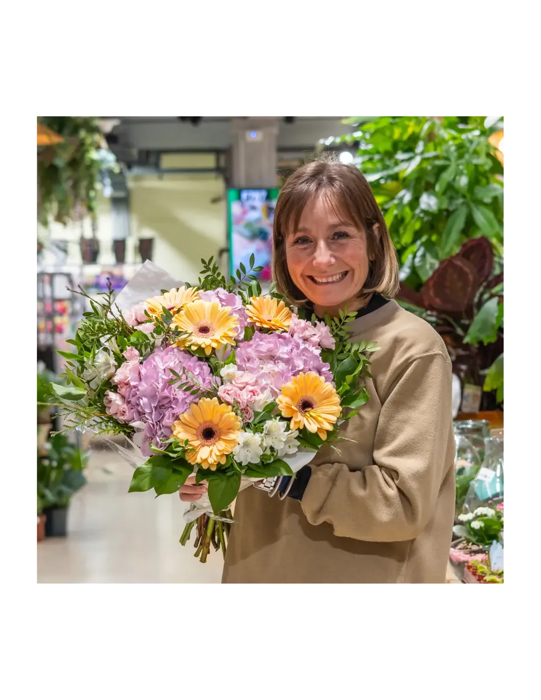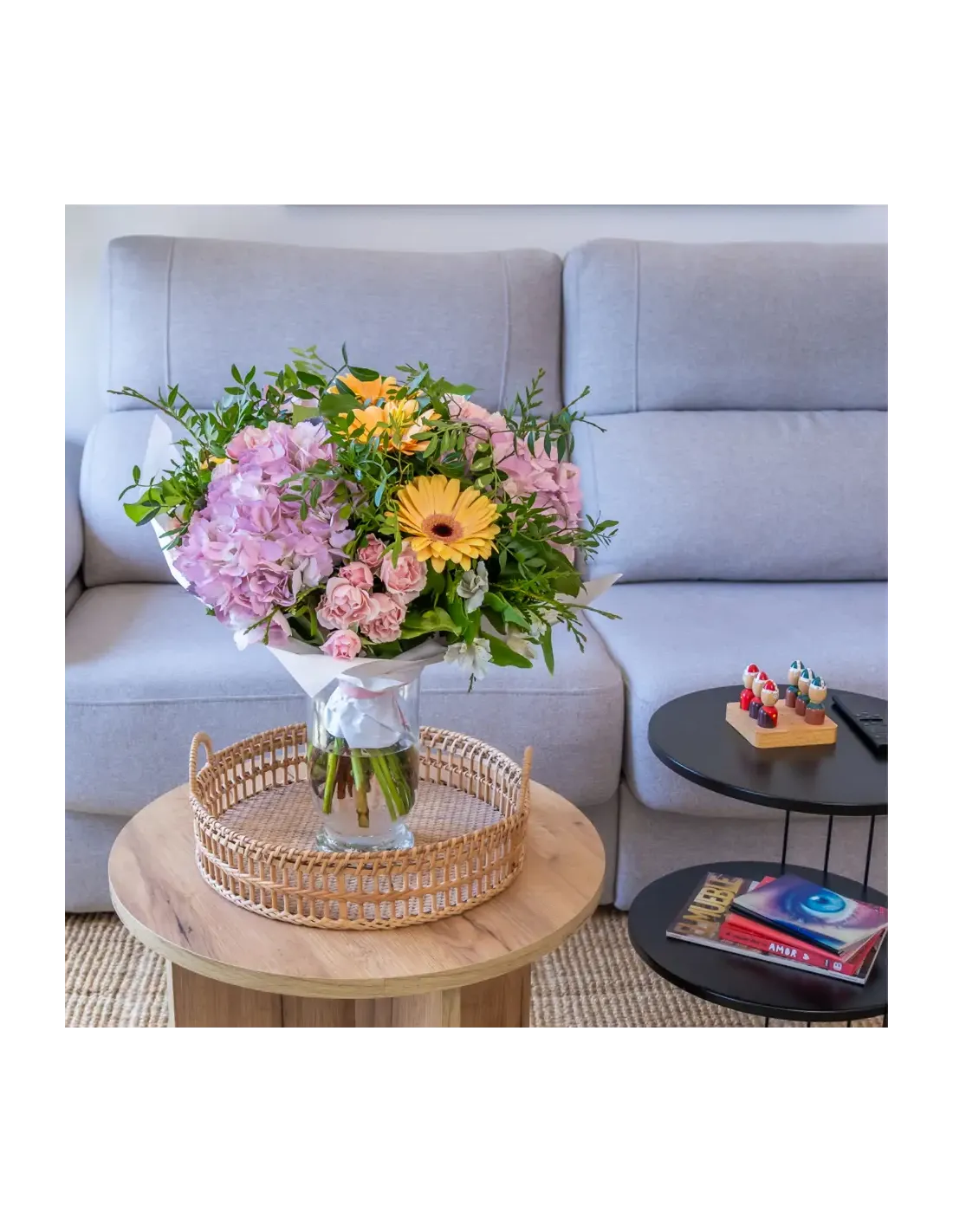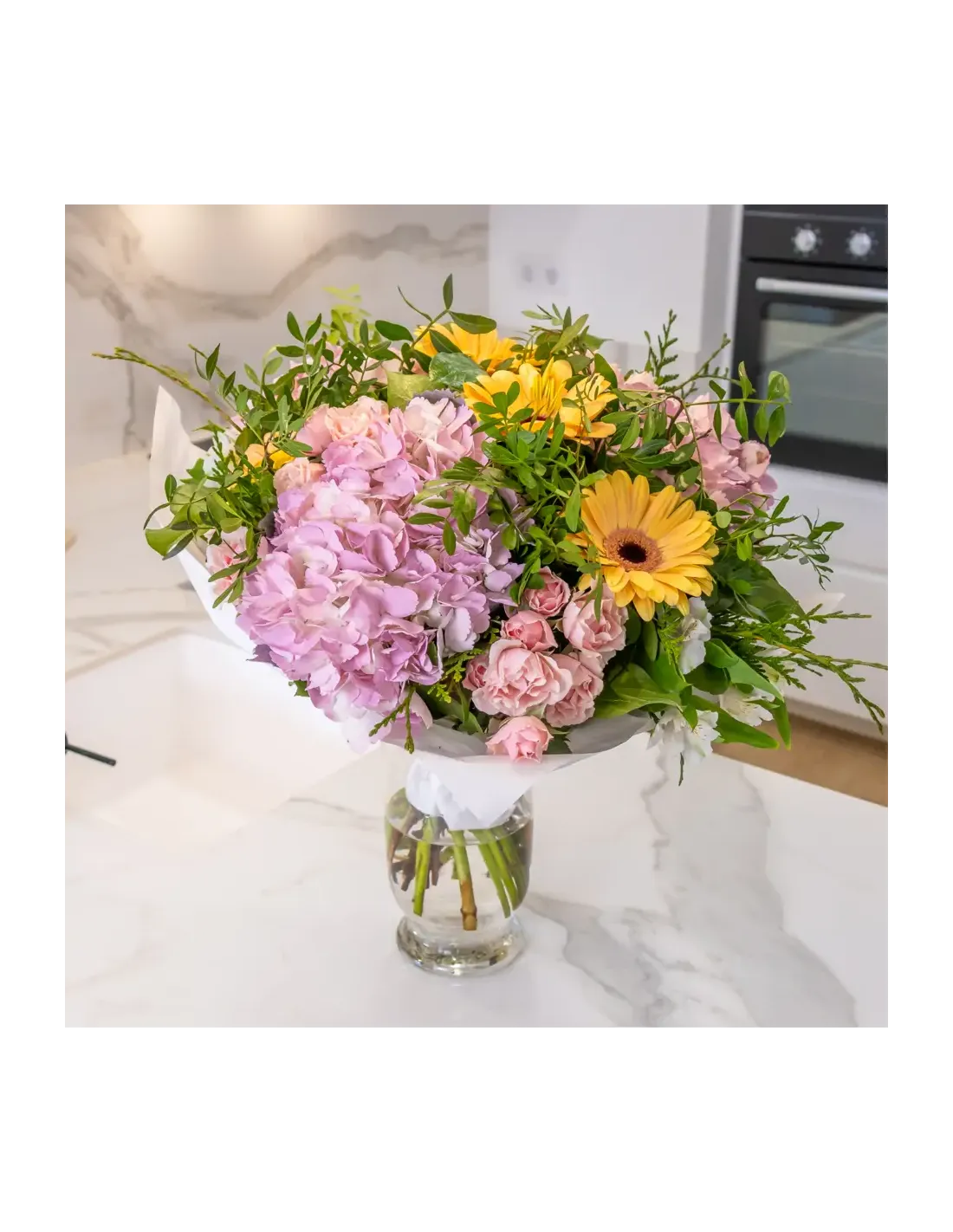 Un ram delicat i ple de tendresa, pensat per transmetre afecte sincer. Les seves hortènsies i alstroemèries en tons suaus es combinen amb roses spray i gerberes que aporten frescor i alegria. Perfecte per dir "t’estimo" de la manera més dolça.