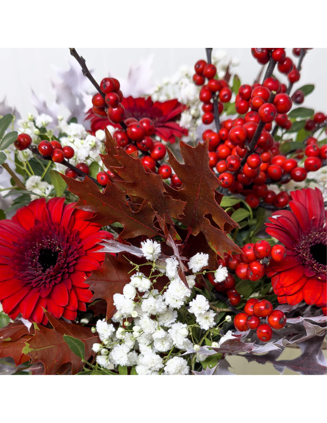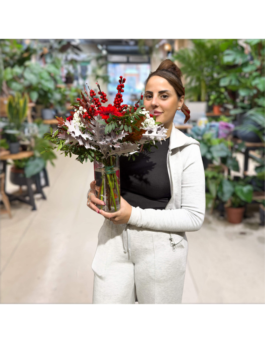 Descobreix la màgia del Nadal en la seva versió més delicada amb el nostre Minigerro de flor nadalenca. Un arranjament cuidat fins al detall amb gerberes vermelles, branques d’ilex (baies vermelles), paniculata blanca i verds naturals que evoquen els boscos d’hivern. És perfecte per donar un toc festiu a qualsevol racó sense carregar l’ambient. Ideal per regalar o decorar tauletes amb molt d’encant.