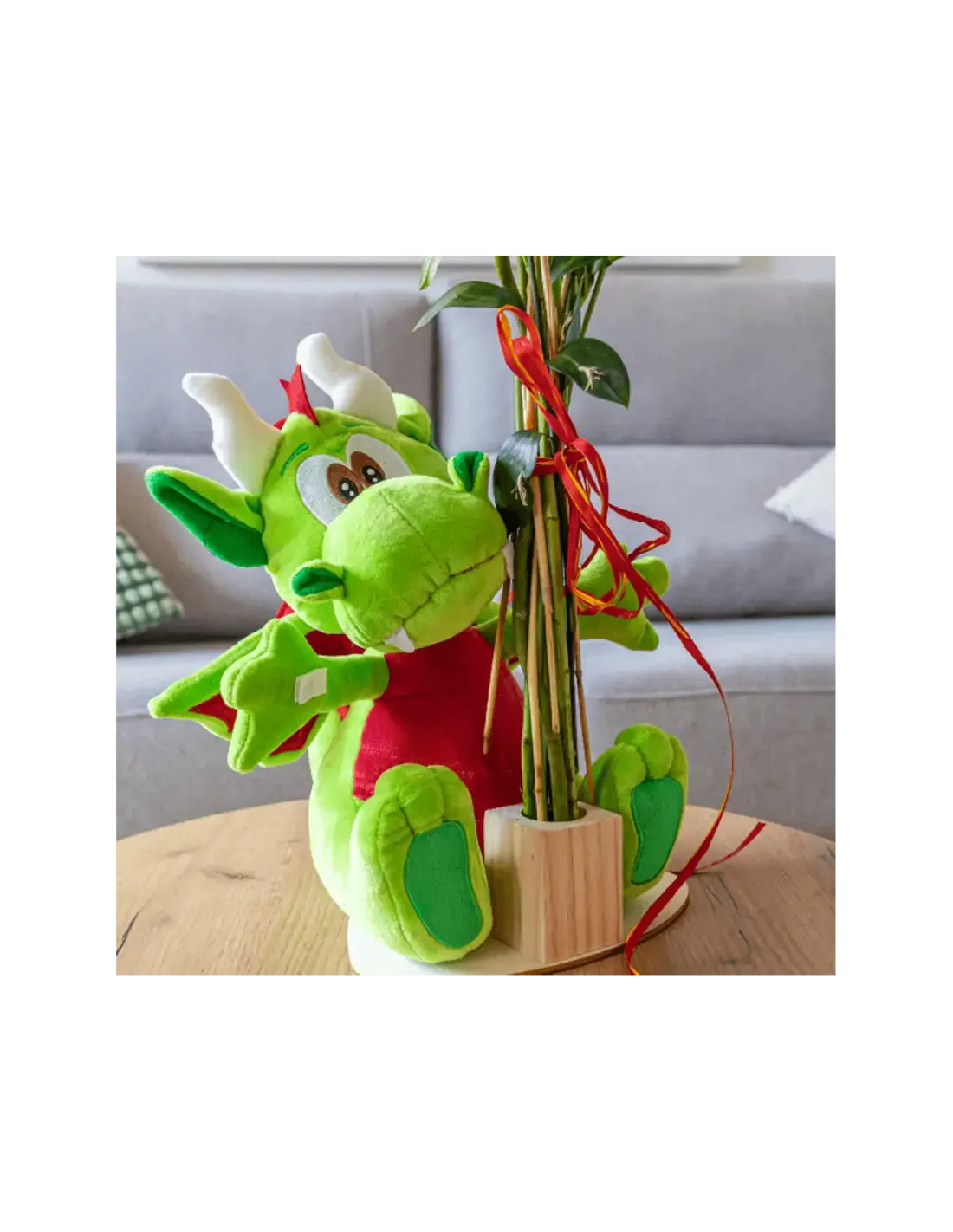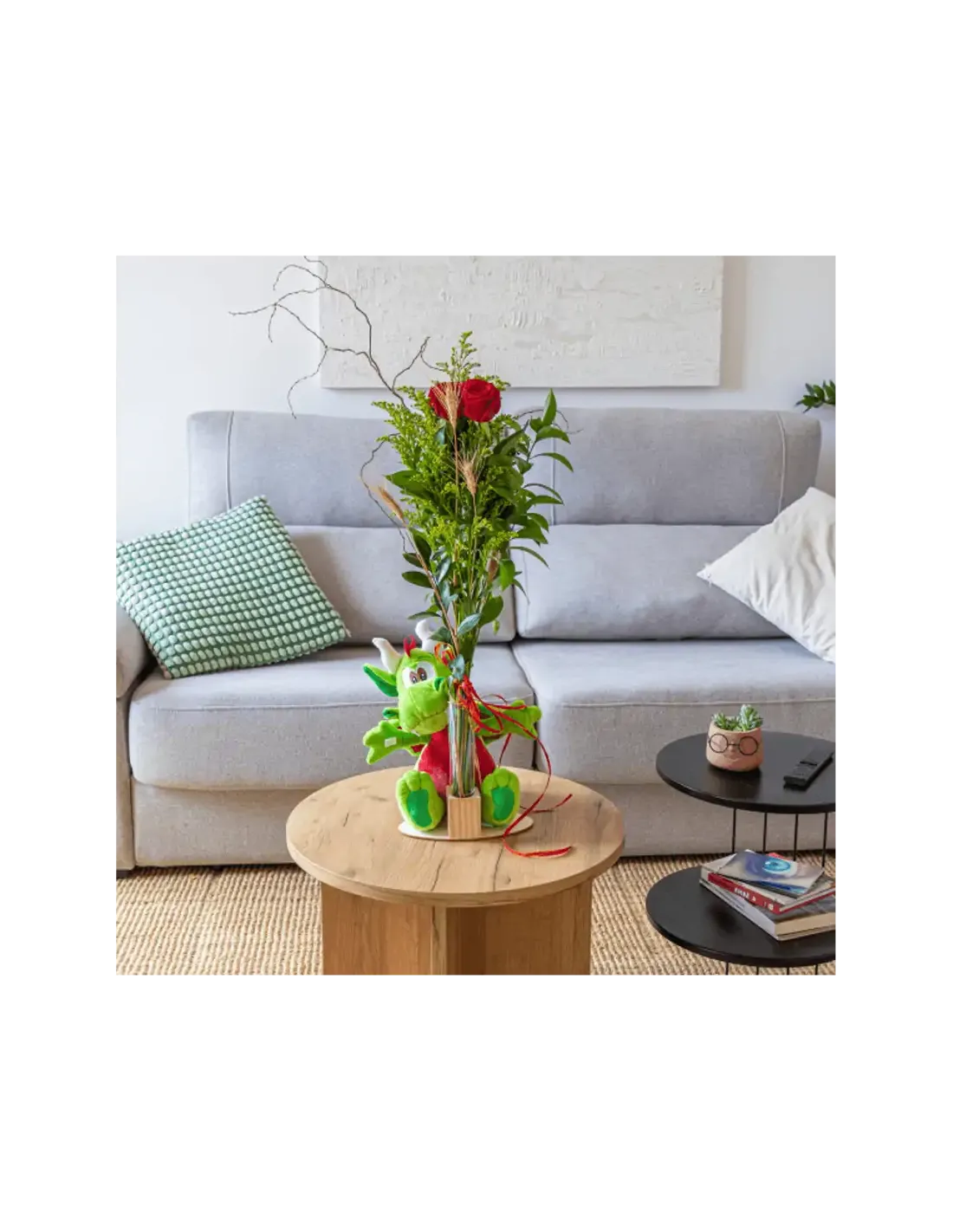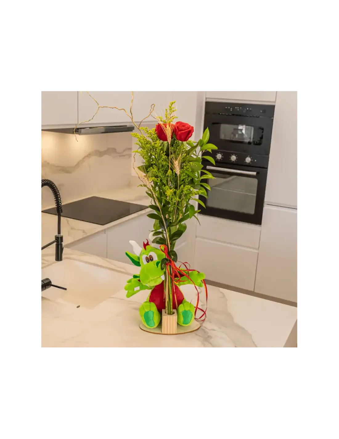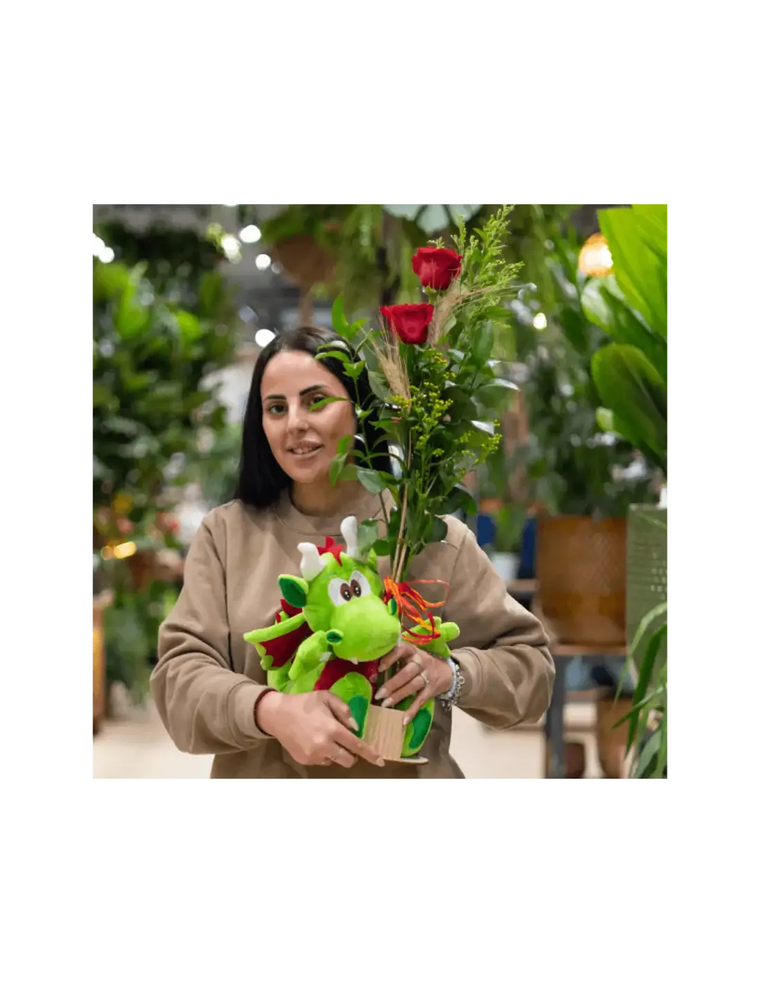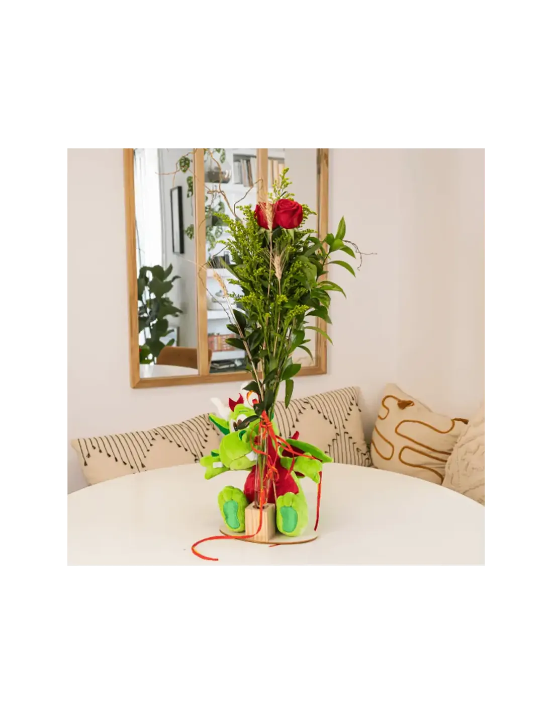 Celebra Sant Jordi amb el nostre encantador drac de peluix, unitats limitades, en una base de fusta, acompanyat per 2 belles roses vermelles, salix, solidago i ruscus. Aquest regal únic combina la màgia de la llegenda de Sant Jordi amb la bellesa de les flors, tot creant una experiència memorable. El peluix del drac hi afegeix un toc de fantasia i tendresa, mentre que les roses vermelles simbolitzen l'amor i la passió. Presentat sobre una base de fusta, aquest arranjament és un tribut encantador a aquesta celebració tradicional. Fes d´aquest Sant Jordi una experiència inoblidable amb aquest regal ple d´encant i significat!