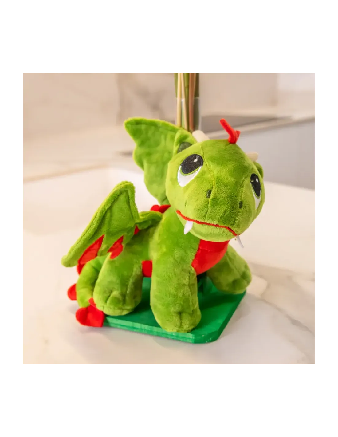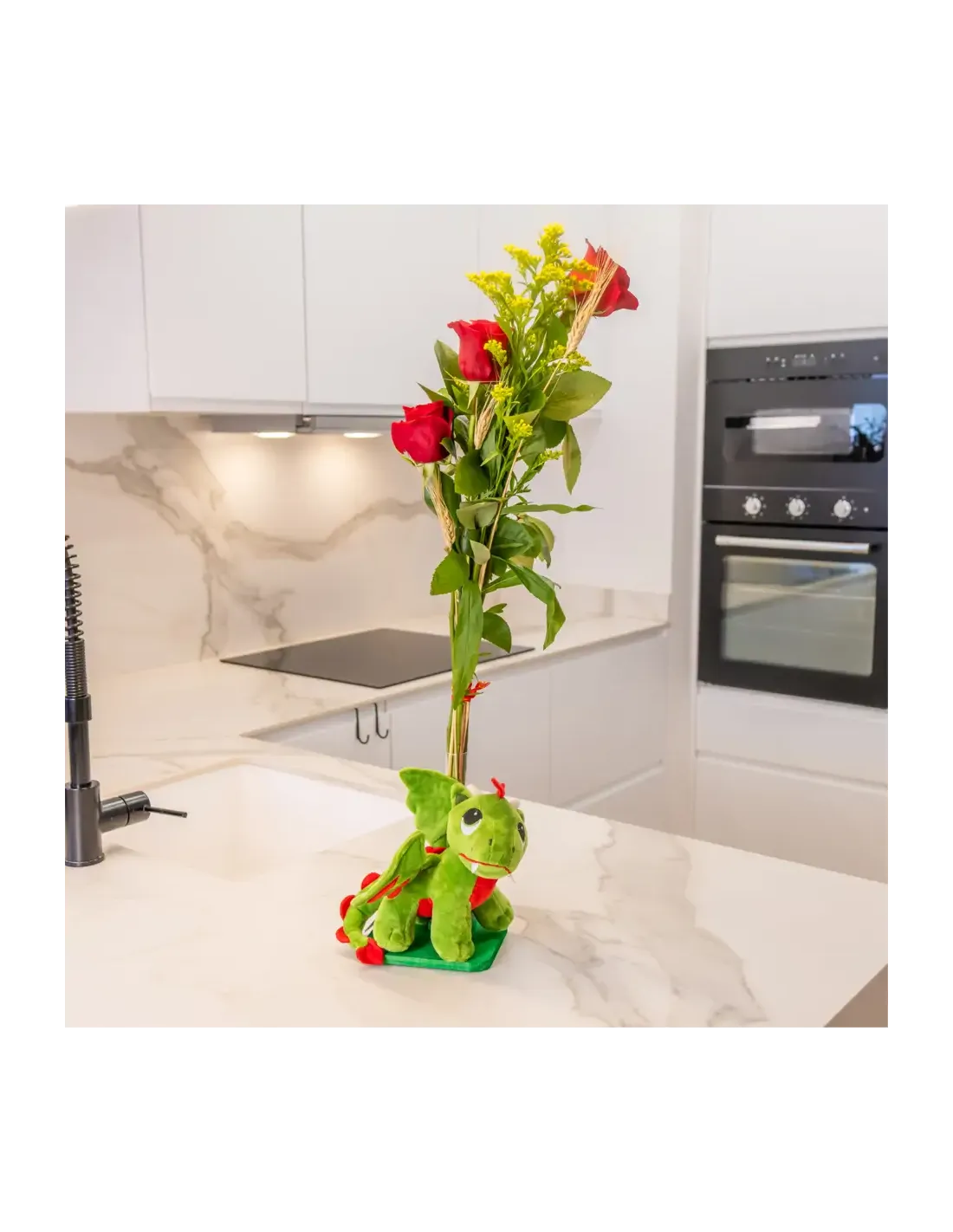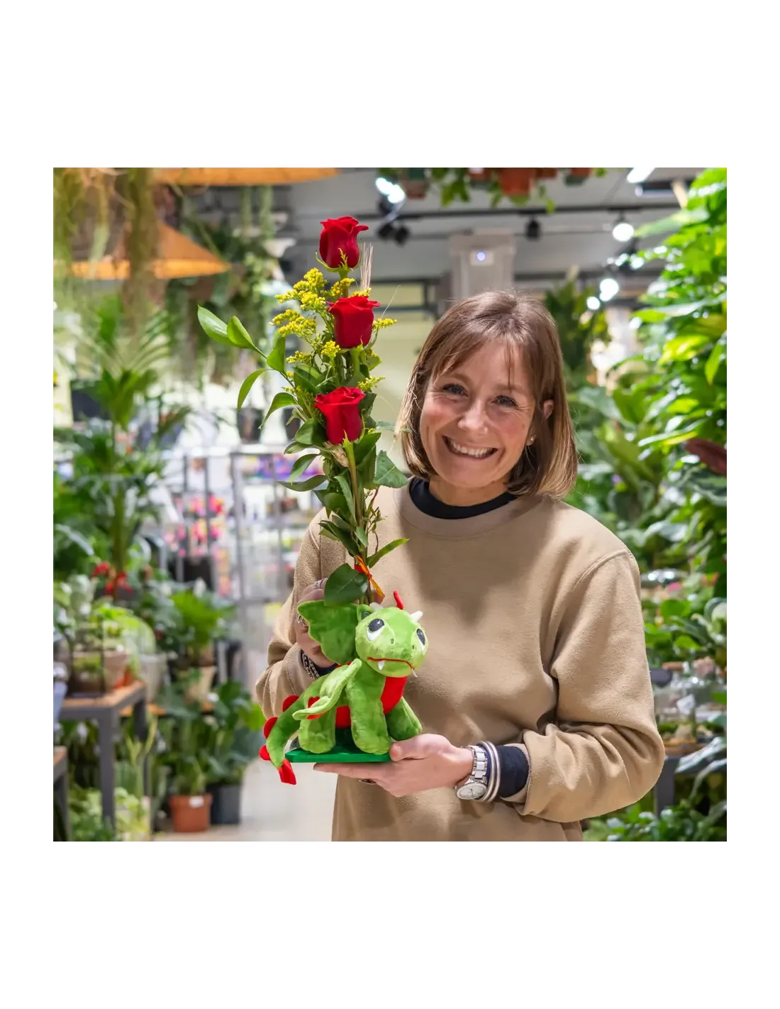 Un drac adorable amb 3 roses vermelles a una figura de fusta artesanal. Ideal per sorprendre amb fantasia i tendresa.