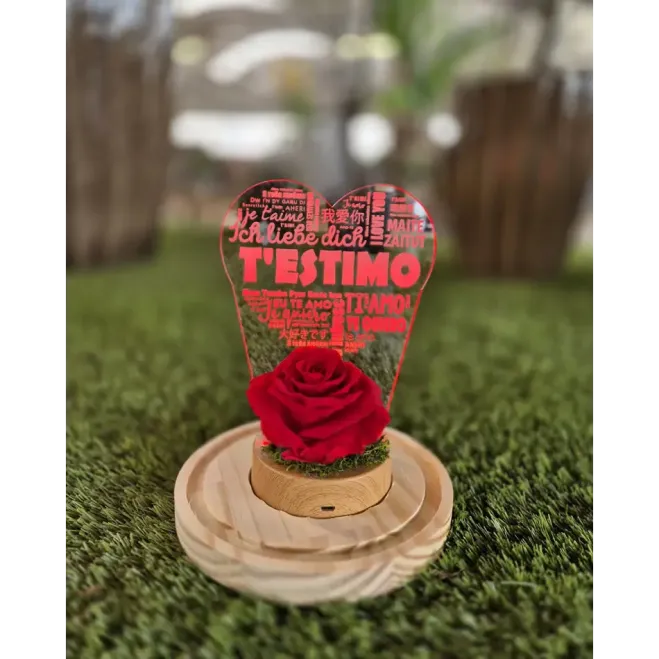 Imagina un moment màgic, una habitació tènue i la llum càlida d'una cúpula que il·lumina una rosa vermella perfecta. Aquest regal no és només una rosa; és una promesa d'amor etern. Tancada en vidre, la rosa roman intacta, mentre els llums LED ressalten la seva esplendor, creant un ambient romàntic i especial. A la seva base, les paraules "T' estimo" són el xiuxiueig que acompanya aquest obsequi, ideal per expressar el que les paraules no arriben a dir. Porta comandament incorporat per canviar la llum, la intensitat i la freqüència