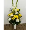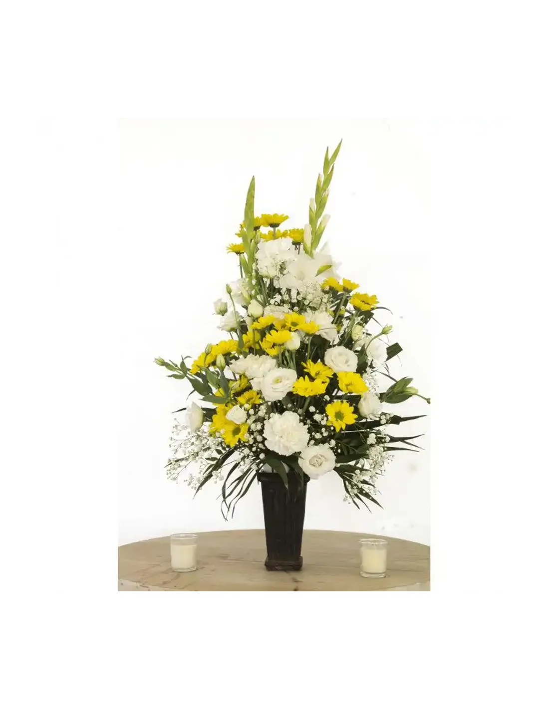 Ram de flor variada en con de plàstic blanc, amb gladiol, clavell, lisianthum i crisantem.