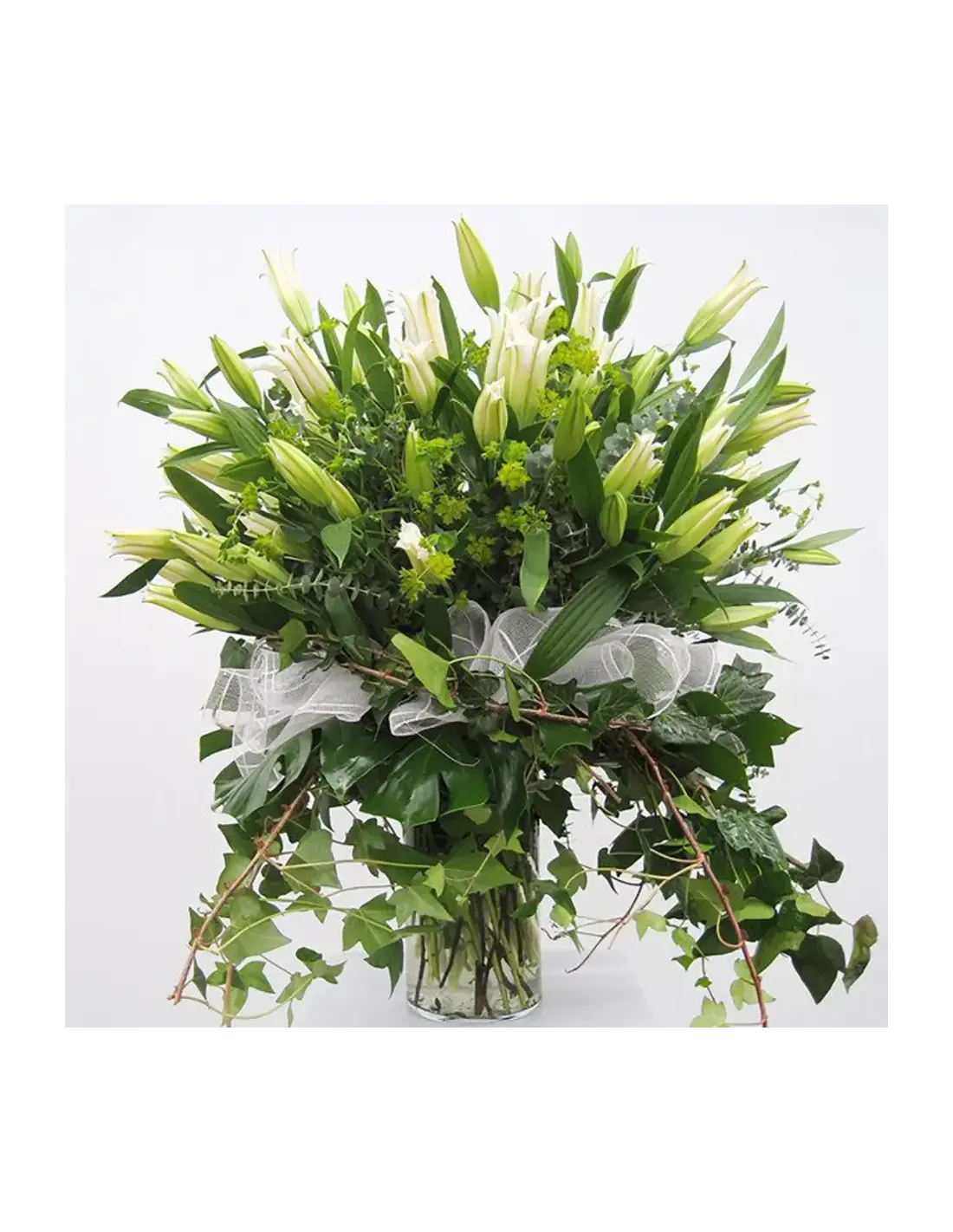 Hermoso jarrón de liliums blancos con verdes decorativos Este impresionante composición con liliums desprende un aroma elegante y sofisticado que dejará boquiabierta a la persona afortunada de recibirlo