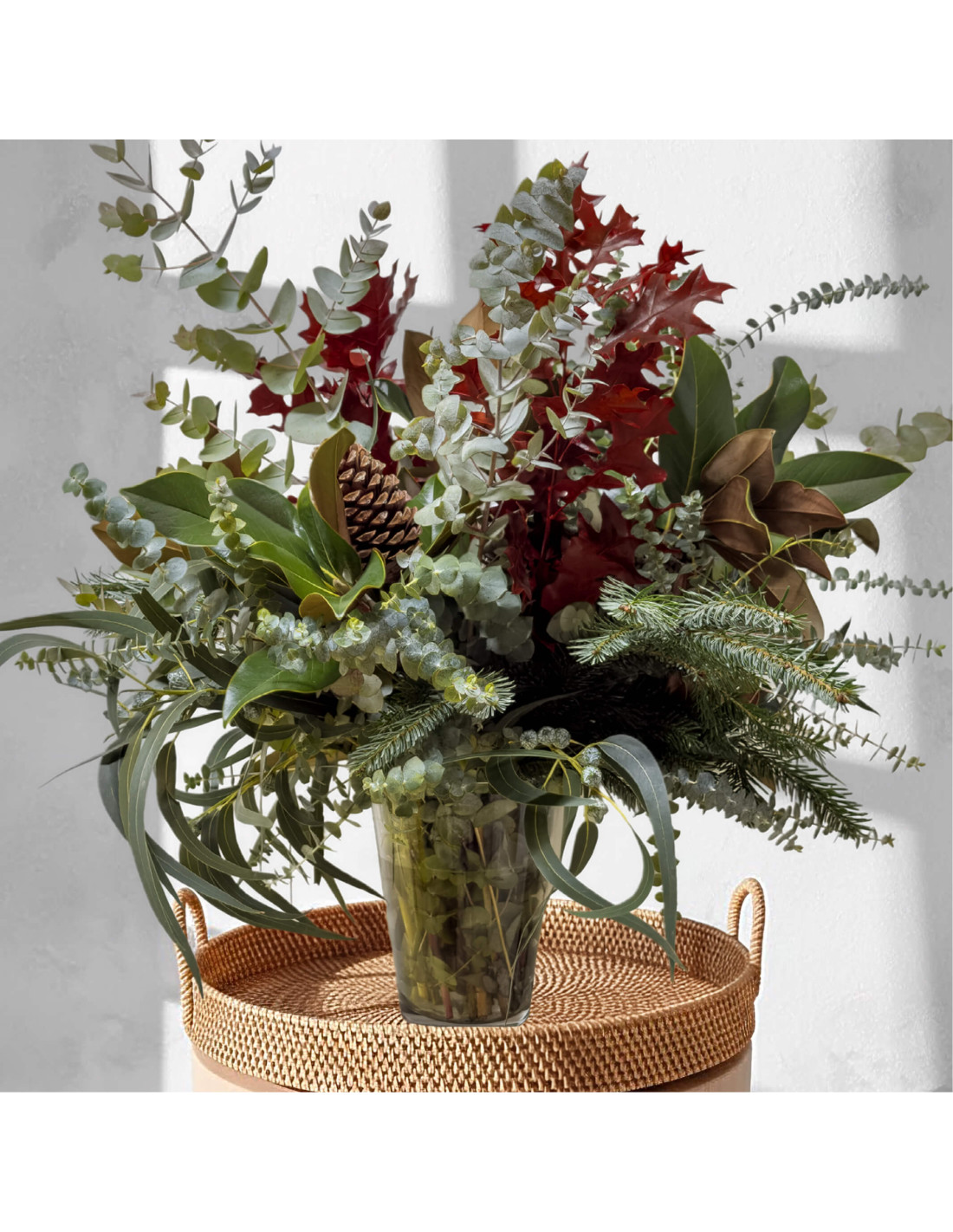 El jarrón de verdes navideños es una auténtica pieza decorativa con alma de bosque invernal. Su diseño mezcla distintas variedades de eucalipto, ramas de abeto, laurel, hojas de roble teñidas y una piña natural como punto focal. Todo dispuesto en un jarrón de cristal que realza la frescura y volumen del arreglo.