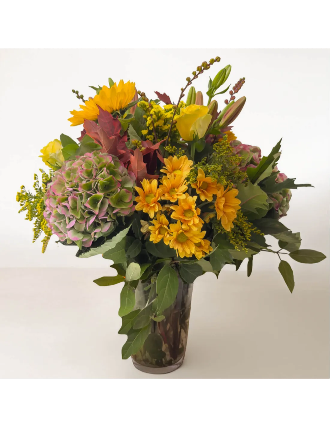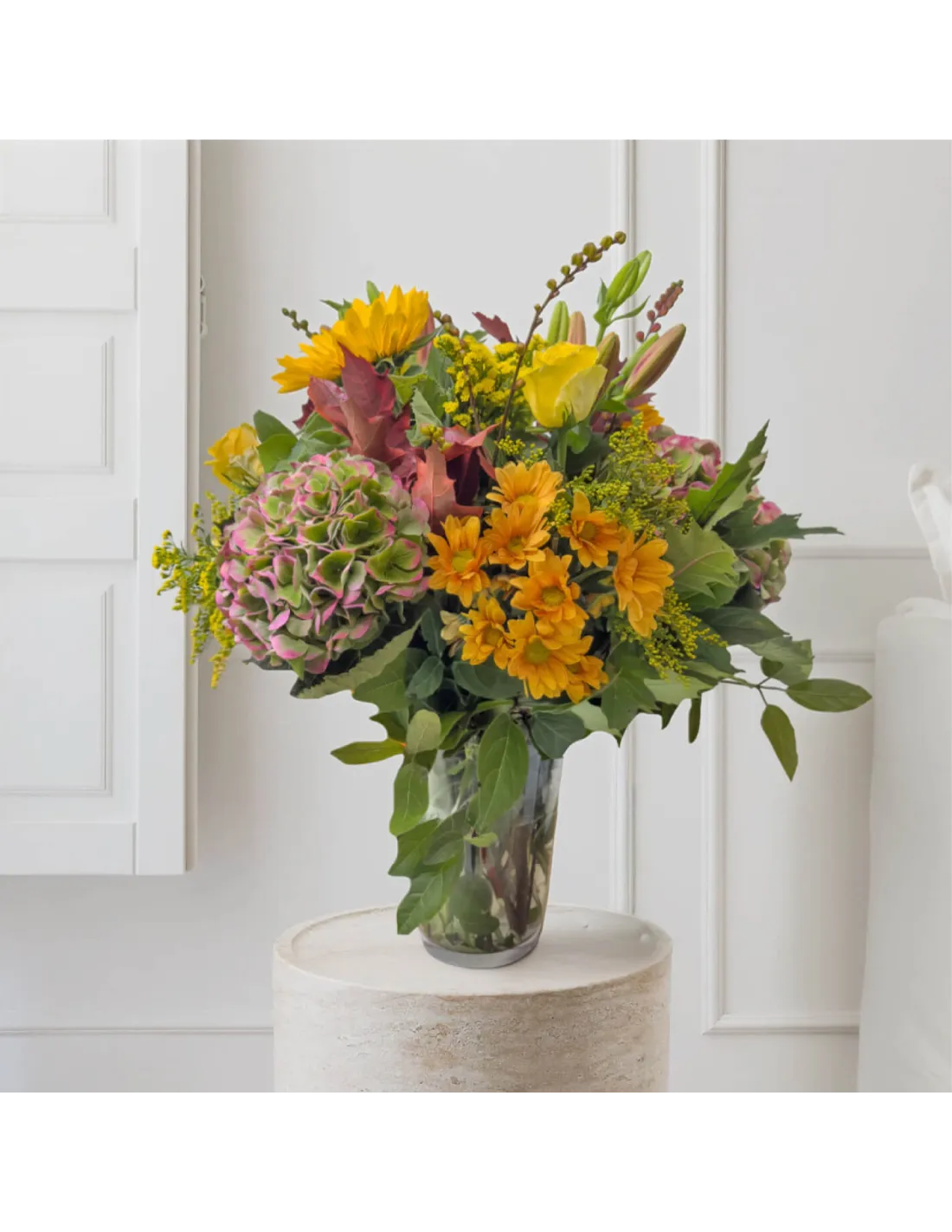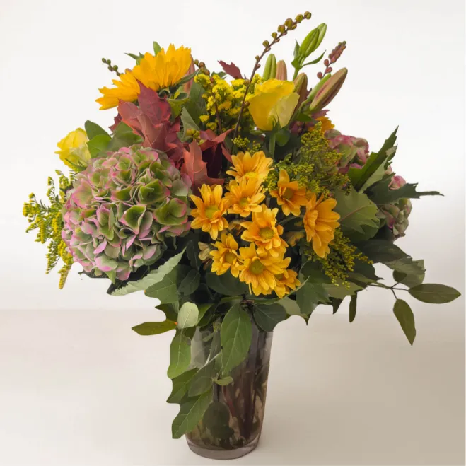 Celebra la belleza del otoño con este jarrón floral de temporada, una combinación vibrante de tonos cálidos y texturas naturales. Las hortensias rosadas, los girasoles dorados y las margaritas anaranjadas se entrelazan con hojas secas y verdes intensos, evocando paseos entre bosques y puestas de sol doradas. Ideal para regalar o llenar de vida cualquier rincón del hogar. Un centro de mesa que transmite calidez, elegancia y naturaleza otoñal.