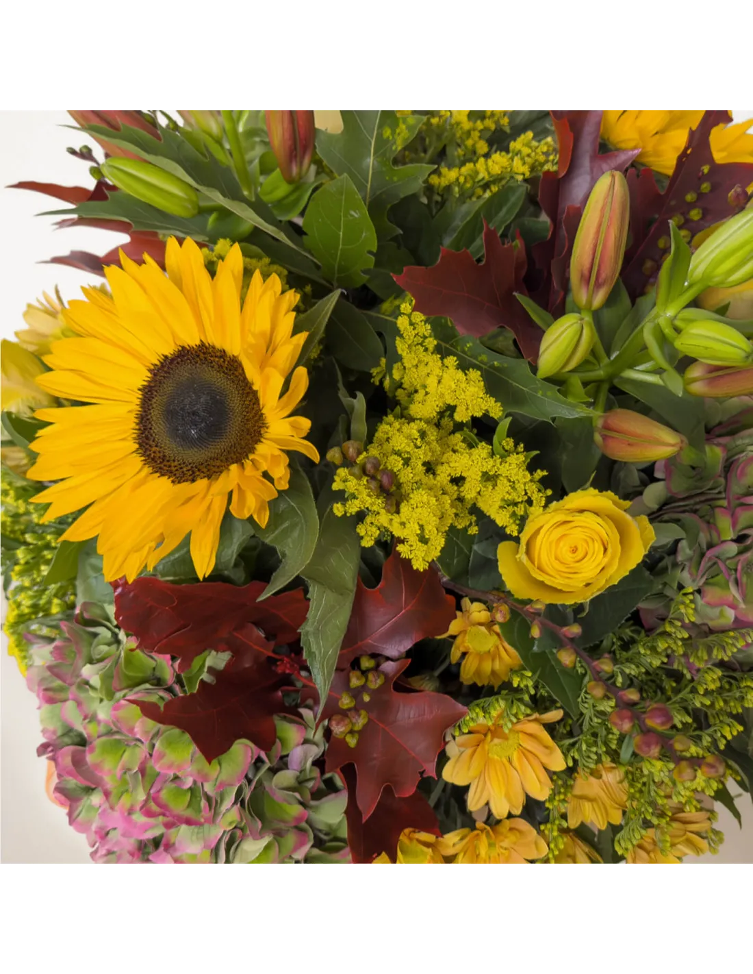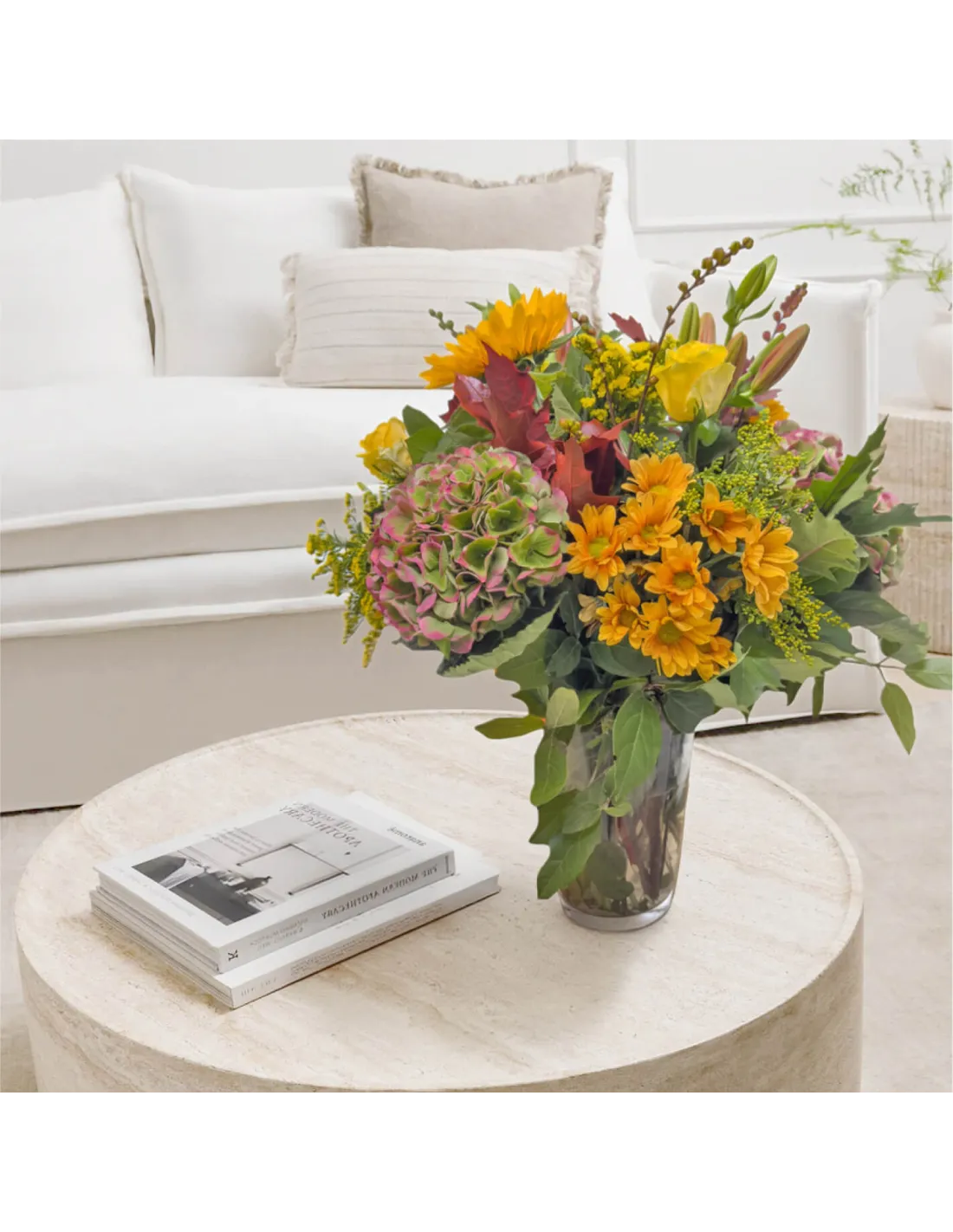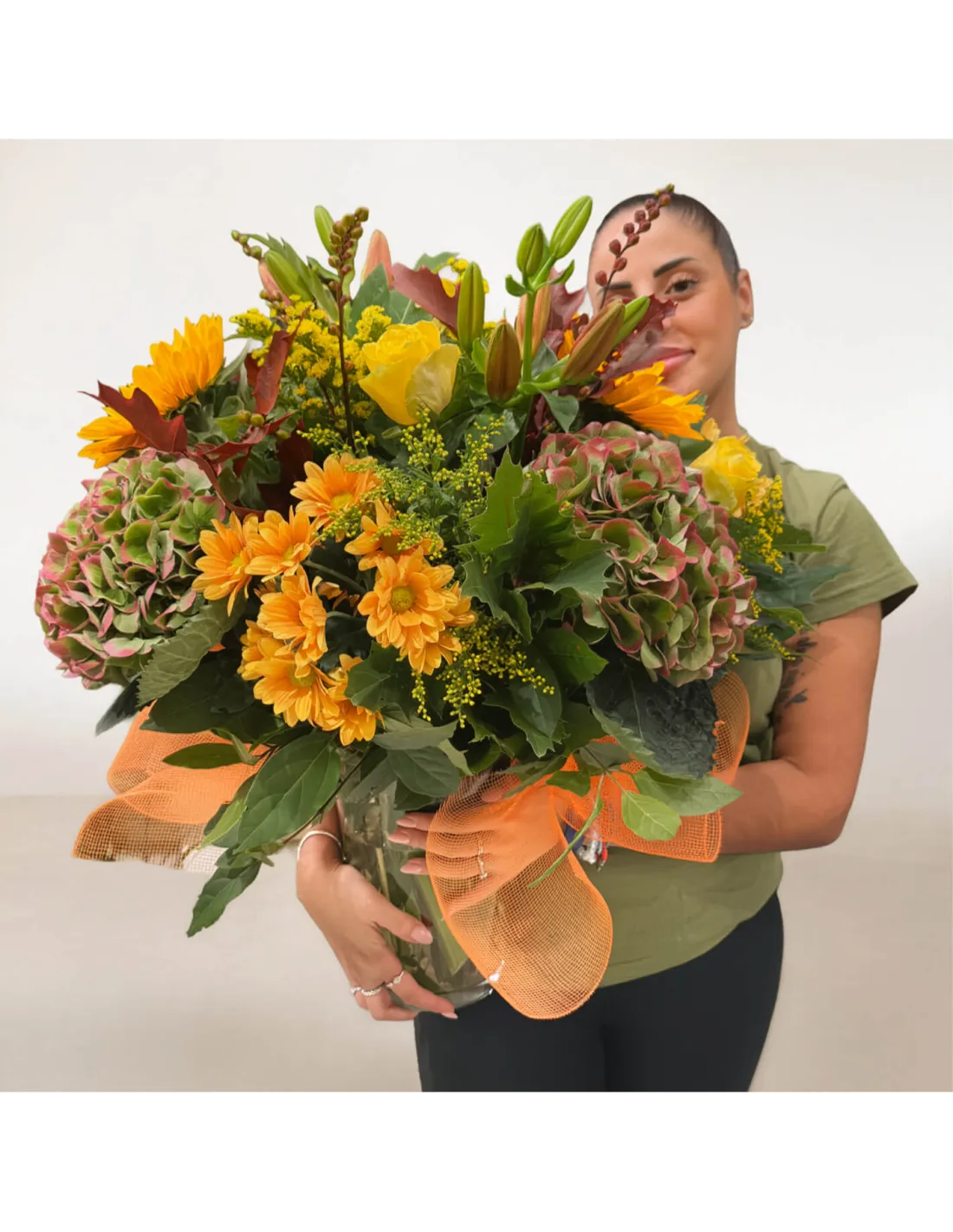 Celebra la belleza del otoño con este jarrón floral de temporada, una combinación vibrante de tonos cálidos y texturas naturales. Las hortensias rosadas, los girasoles dorados y las margaritas anaranjadas se entrelazan con hojas secas y verdes intensos, evocando paseos entre bosques y puestas de sol doradas. Ideal para regalar o llenar de vida cualquier rincón del hogar. Un centro de mesa que transmite calidez, elegancia y naturaleza otoñal.