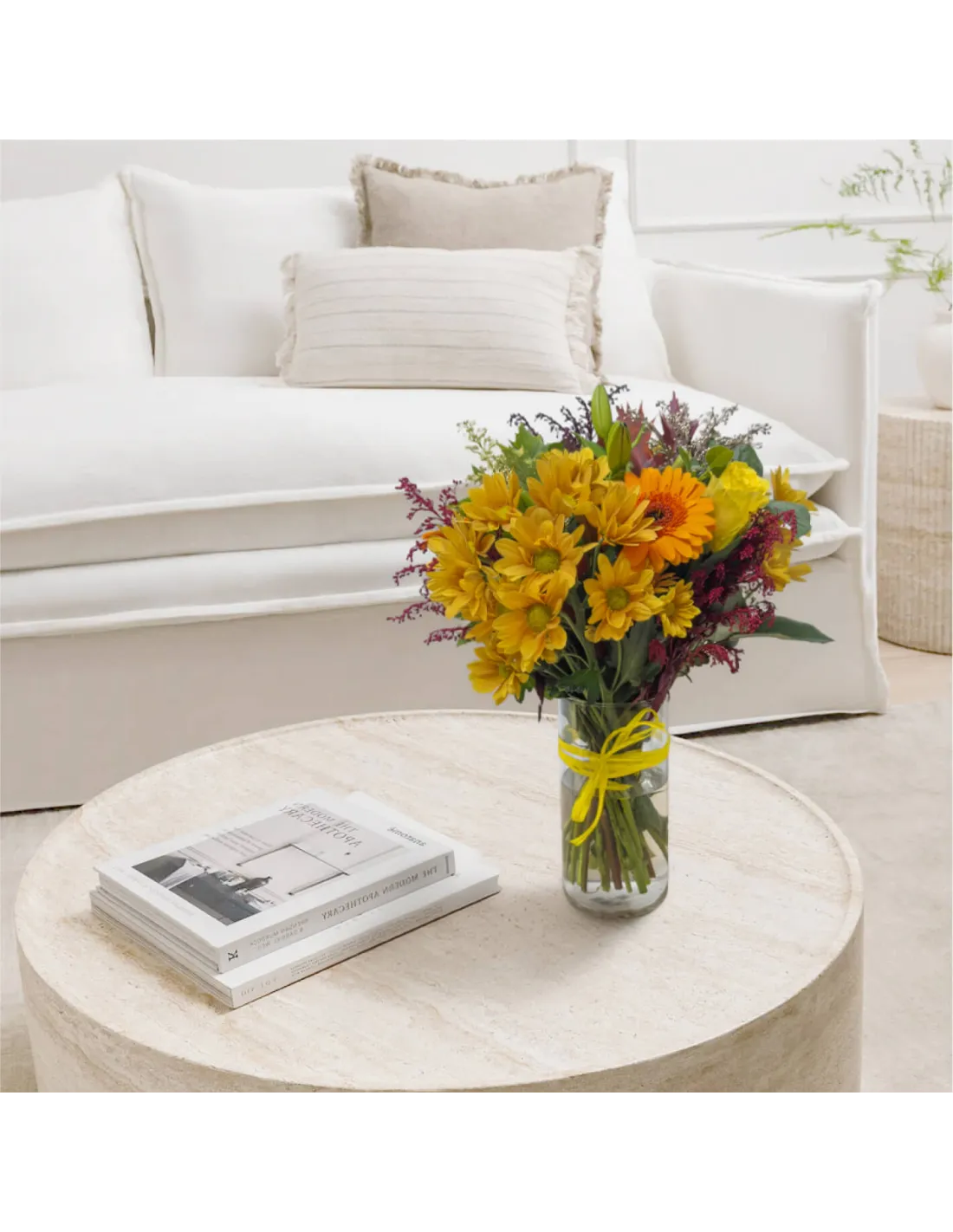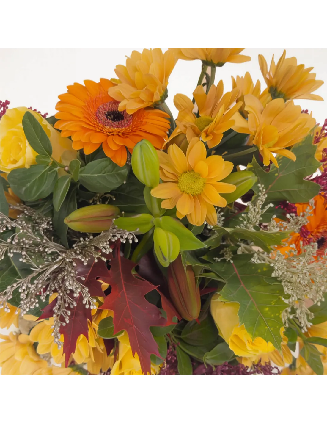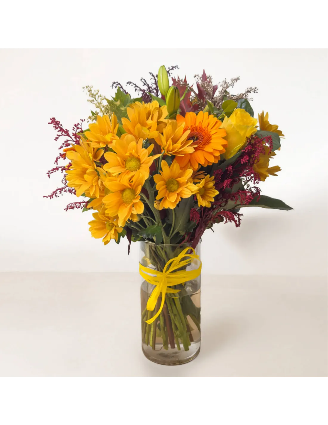 Pequeño en tamaño, pero grande en encanto. Este mini jarrón otoñal reúne flores de tonos cálidos como margaritas doradas, gerberas anaranjadas y toques rojizos que evocan los colores más vibrantes de la estación. Una composición compacta, alegre y luminosa, ideal para escritorios, mesitas auxiliares o detalles llenos de cariño.El detalle perfecto para decir “estoy pensando en ti” esta temporada.