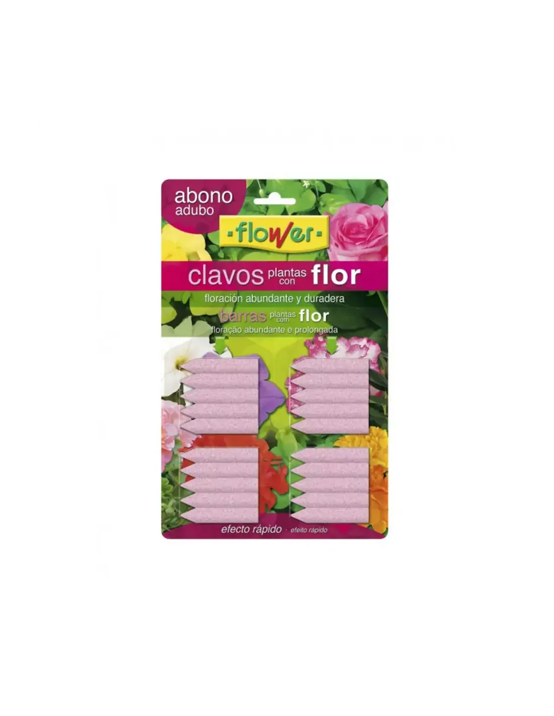 El Abono Clavos Flor es un abono compactado para nutrir las plantas con flor de interior que se cultivan en macetas o las de exterior en maceta o jardinera. La aplicación de este abono consigue que las plantas estén abonadas durante 30 días. Su formulación, rico en potasio y fósforo, está pensada para inducir la floración de manera rápida. El Abono Clavos Flor se inserta en el substrato. Riego a riego va administrando el abono necesario a la planta. Por ello, la fertilización se durante un mes.