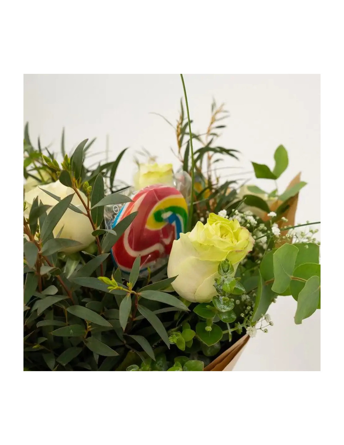 Sorprende a esa persona tan especial con este ramo de rosas y piruletas de colores. Será un regalo divertido y alegre, ¡perfecto para una ocasión especial! Que mejor que endulzar el día a esa persona que nos quita una sonrisa de buena mañana? Con este ramo serás tú quien le saque una sonrisa y le haga el día más dulce y agradable. Se puede hacer mejor regalo? ¿Cómo hacer que tu ramo dure más? Primero hay que quitar el papel kraft que la envuelve para que la flor respire mejor. Cortar el tallo en diagonal 1 cm Pon tu ramo en un jarrón amplio con agua limpia Cambia el agua del florero cada dos días. Cuando los pétalos comiencen a marchitarse, retírelos para no dañar los demás pétalos