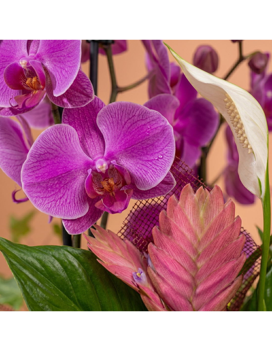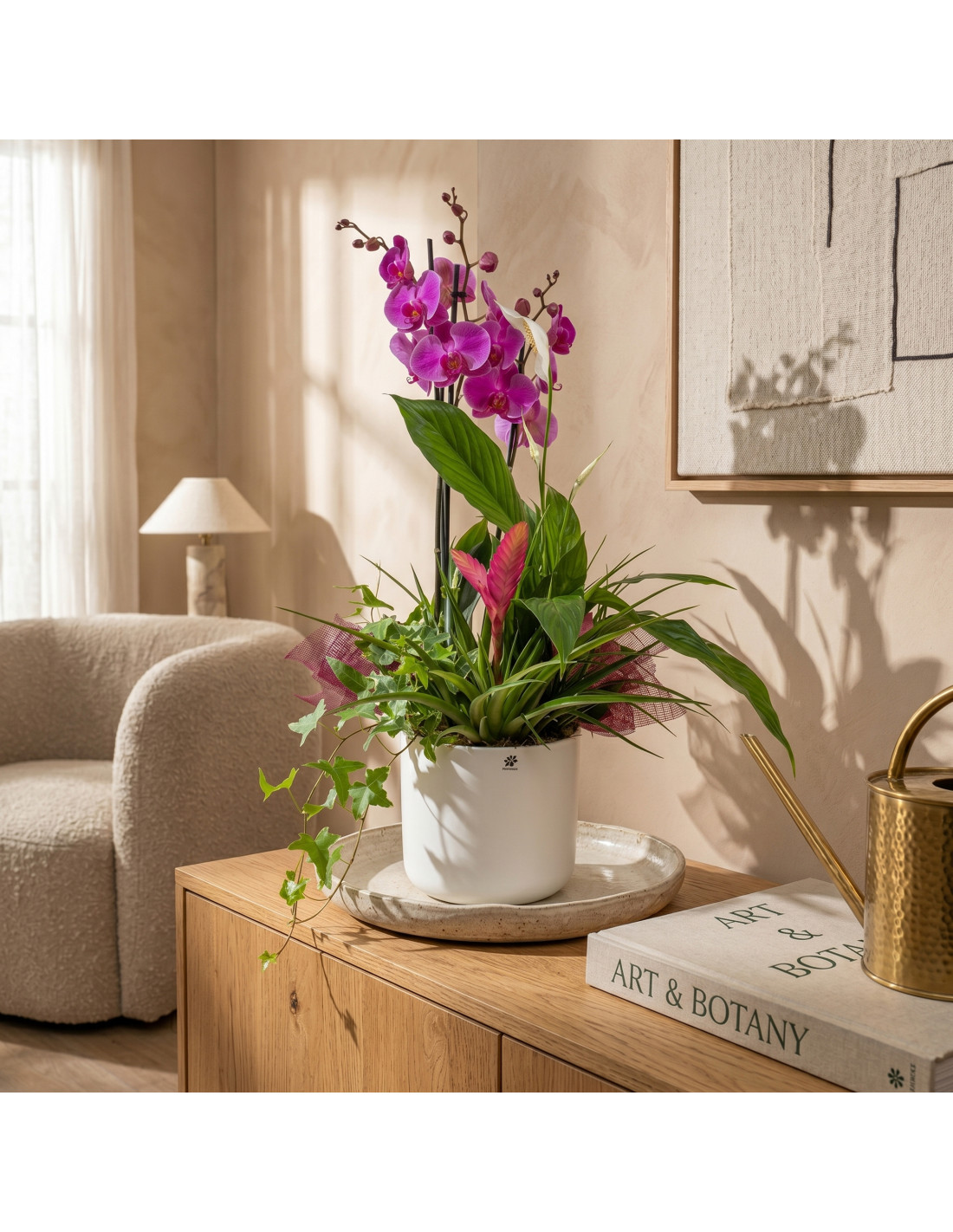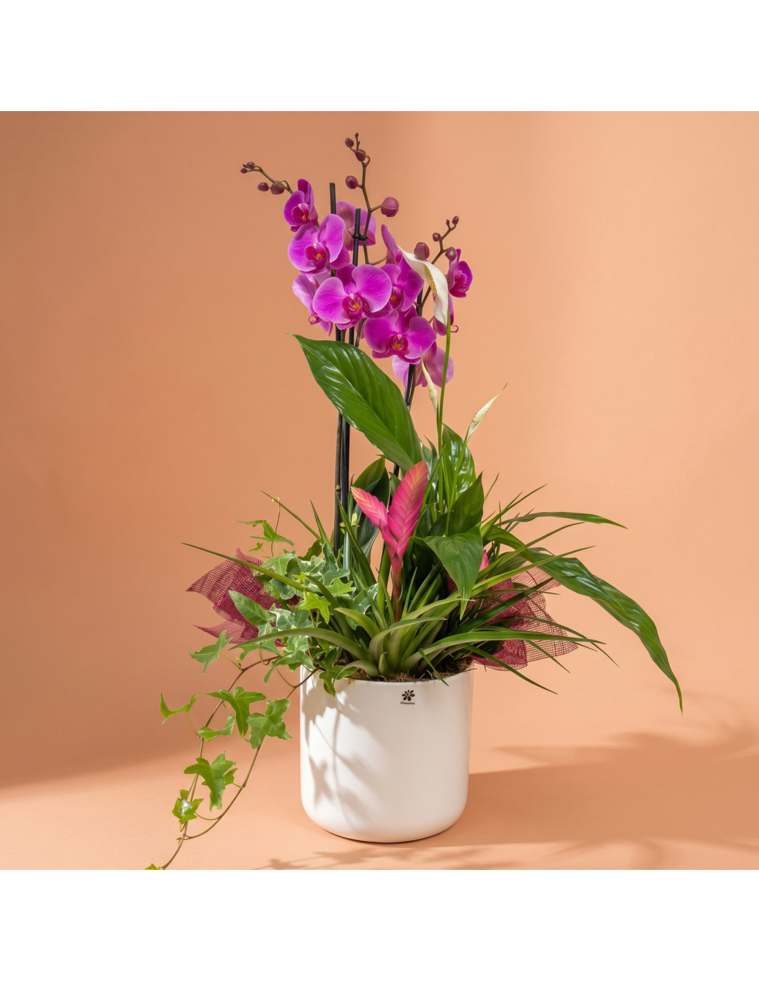 Este grupo de plantas es una obra de arte viviente, diseñada para cautivar y asombrar. En una elegante base de cerámica, el exótico spatiphyllum, las encantadoras tilandsias y la elegante orquídea se combinan para crear un regalo que encarna la belleza y la sofisticación, perfecto para expresar amor.