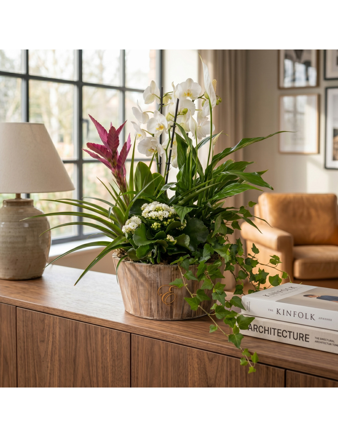 Grupo de plantas de interior elegante y sofisticado Grupo de plantas Turanika, un grupo de plantas con una phaleanopsis es un acierto seguro pero si encima la acompañas de 4 plantas más ya es un existazo y si encima una de ellas es un spatyphillum, planta purificadora de aire, te llevarás todos los alagos. La base del producto puede variar según disponibilidad.