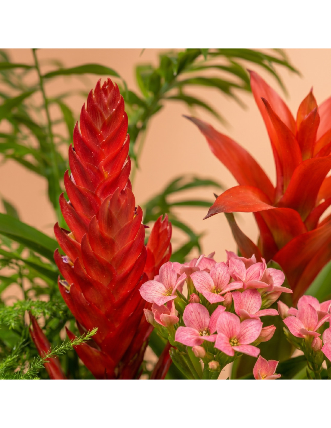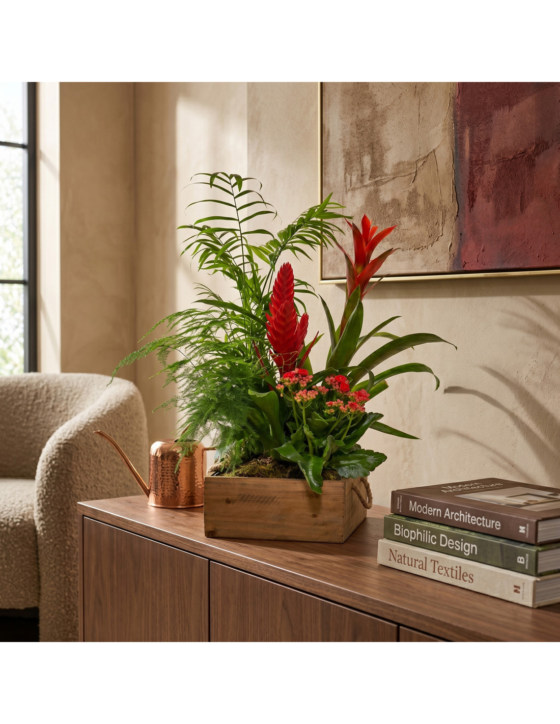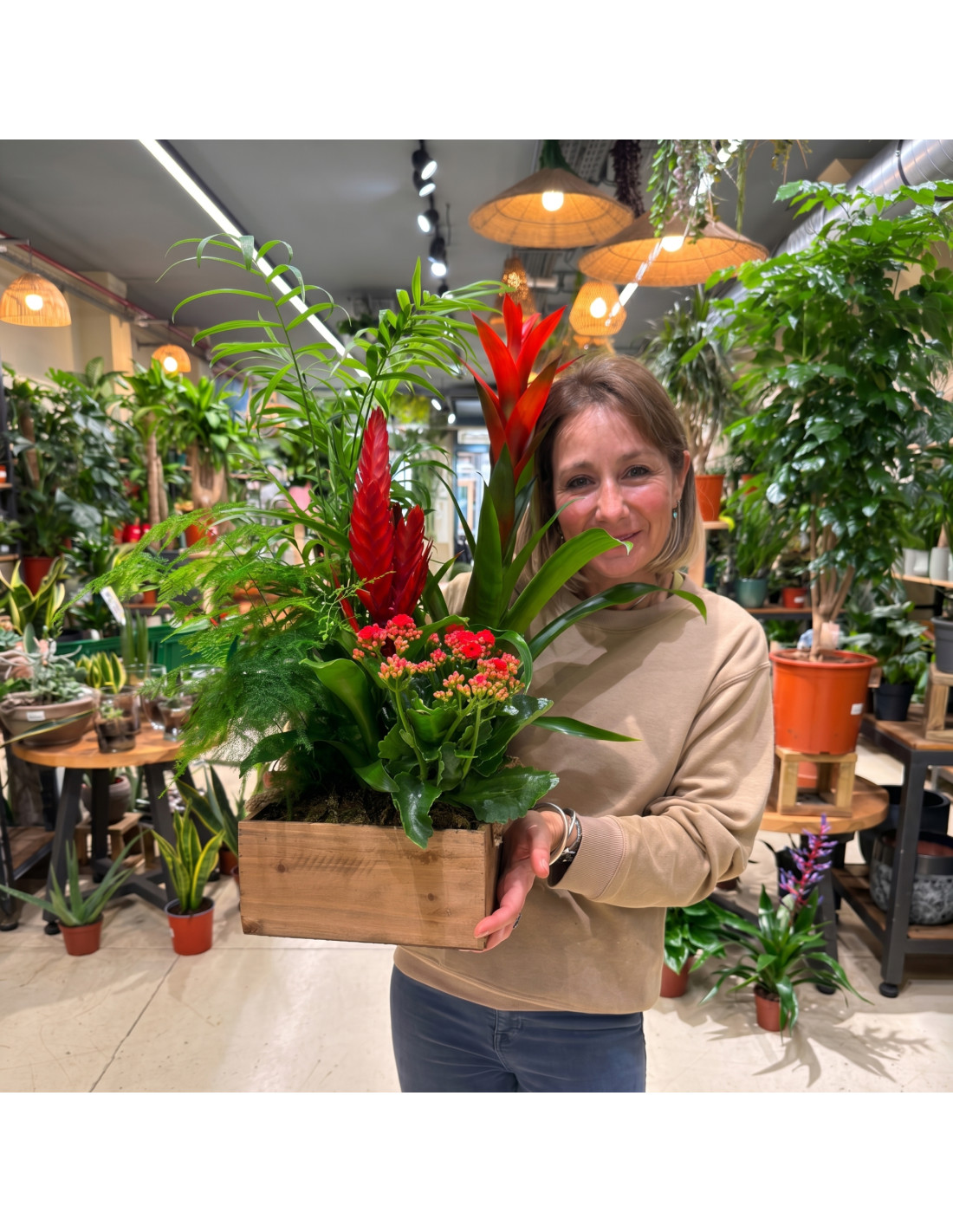 Guzmania roja, chamaedorea, vriesea, kalanchoe y esparraguera pluma en caja de madera. Un rincón de jungla exótica para llenar de frescura cualquier espacio.