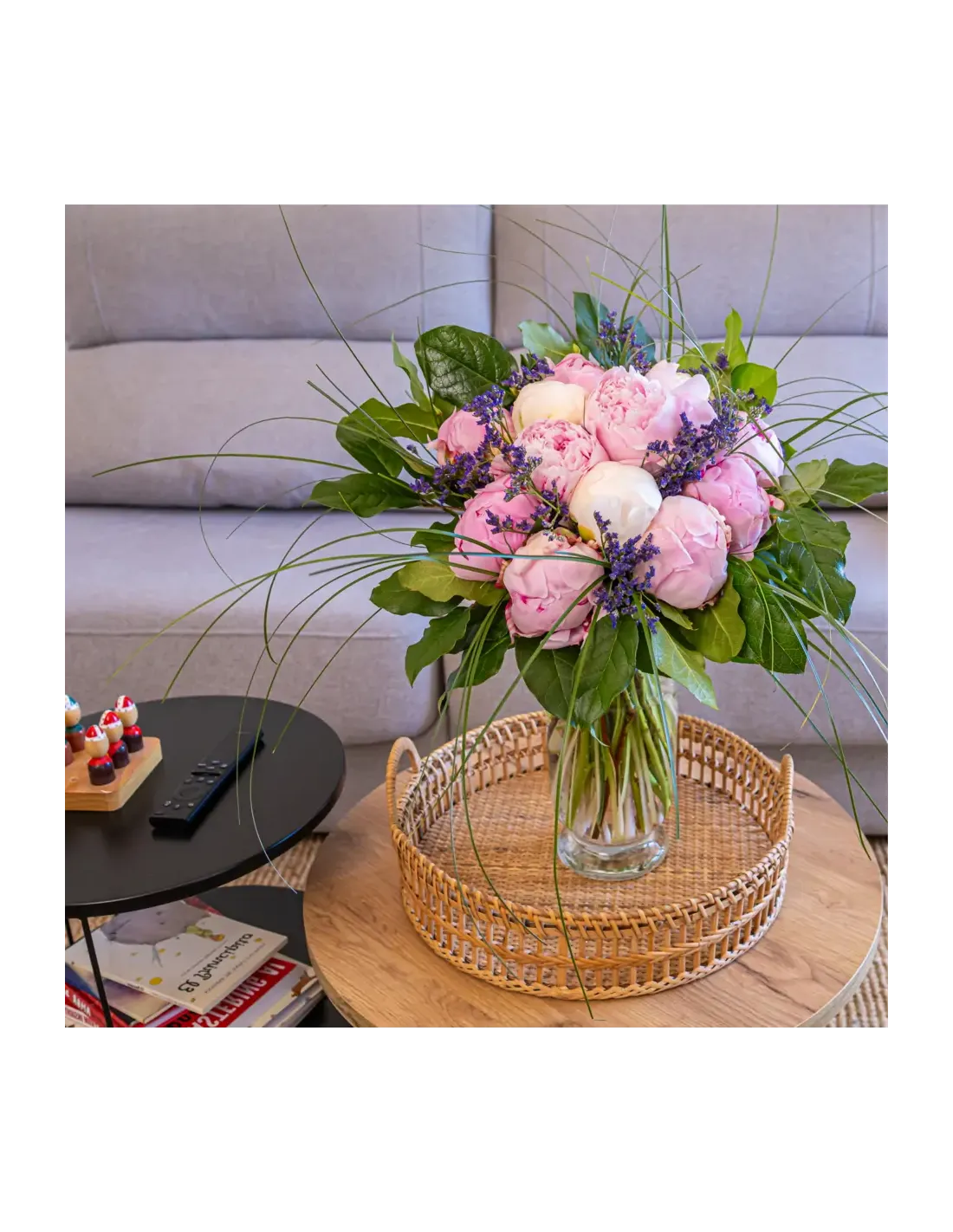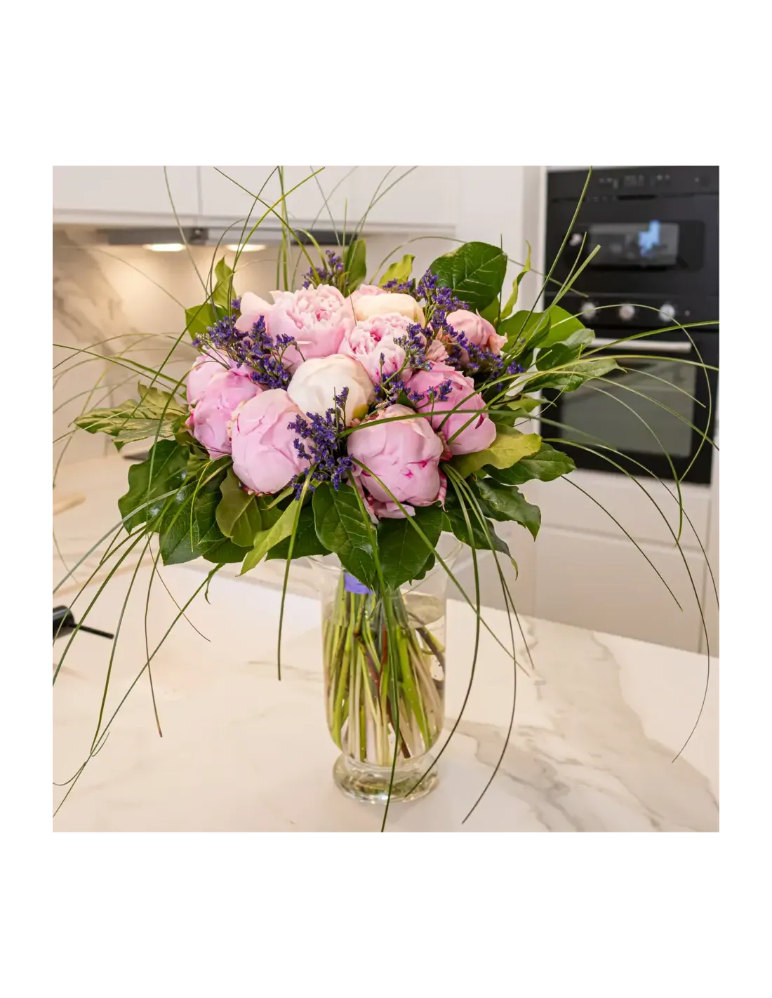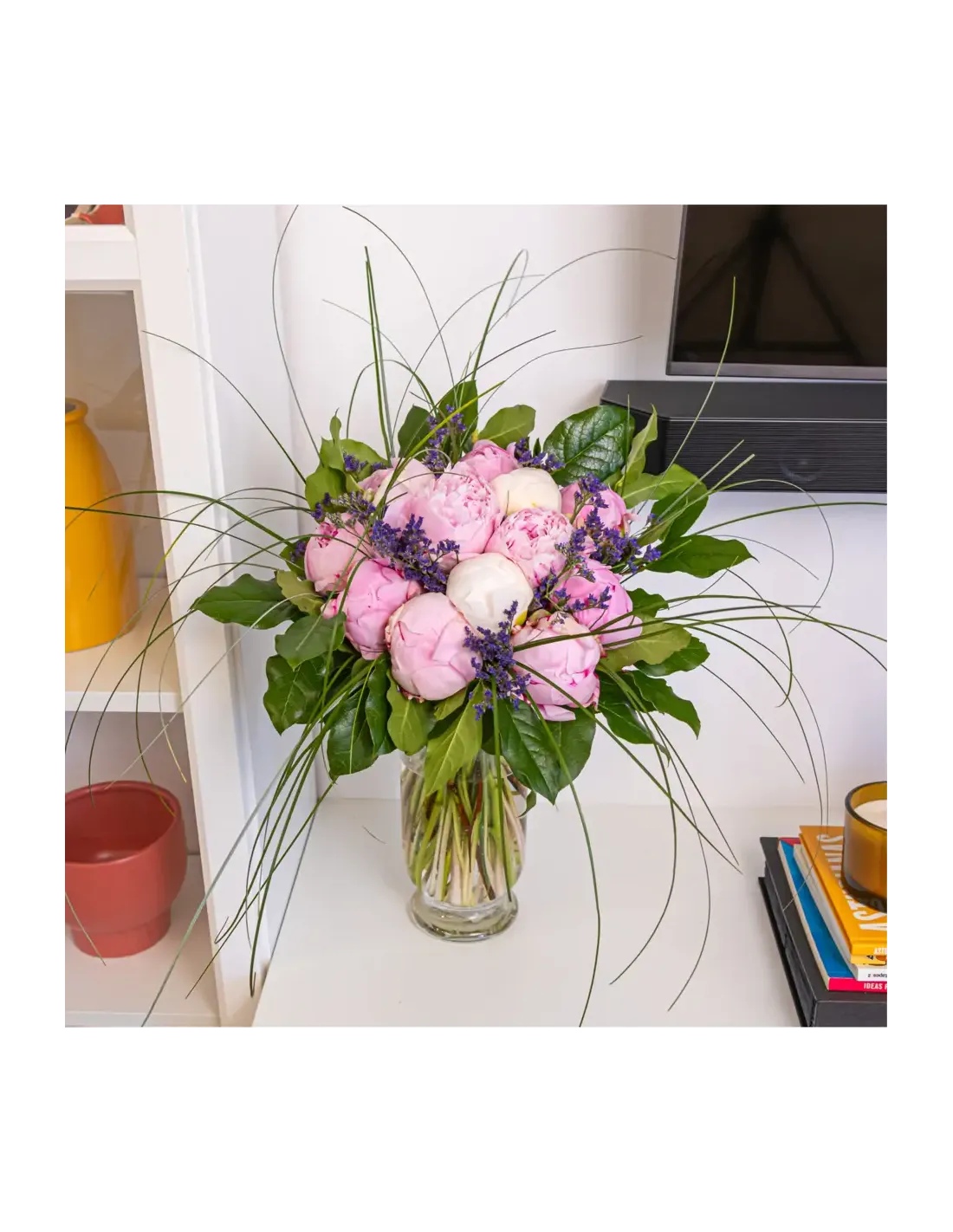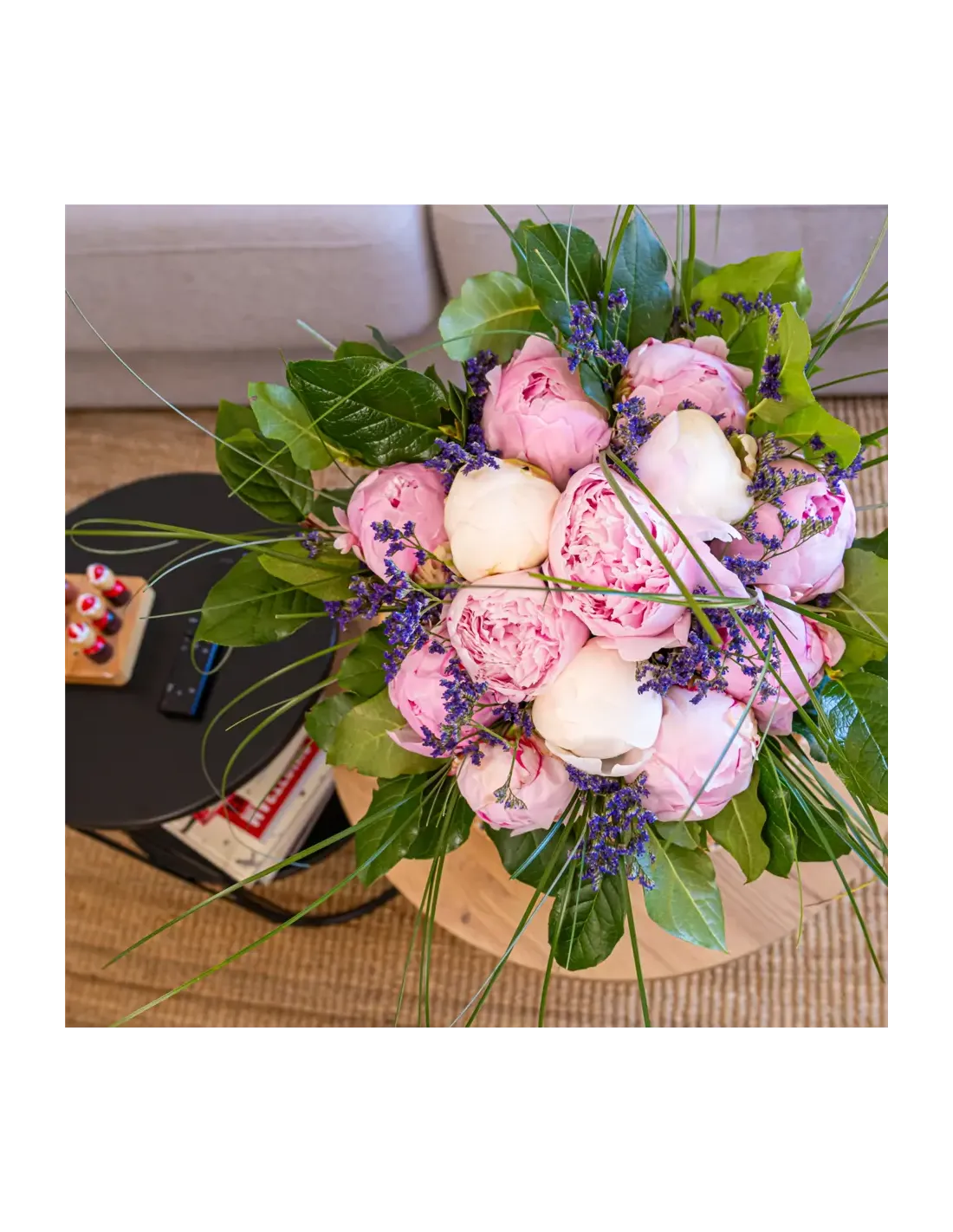 Descubre nuestro bouquet de flores peonia, una creación única con 10 peonias rosas, 3 peonias blancas, 1 pomo limonium, medio beargrass, verdes.