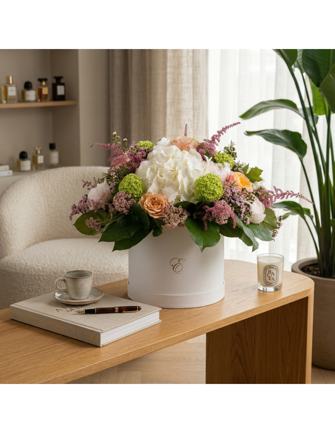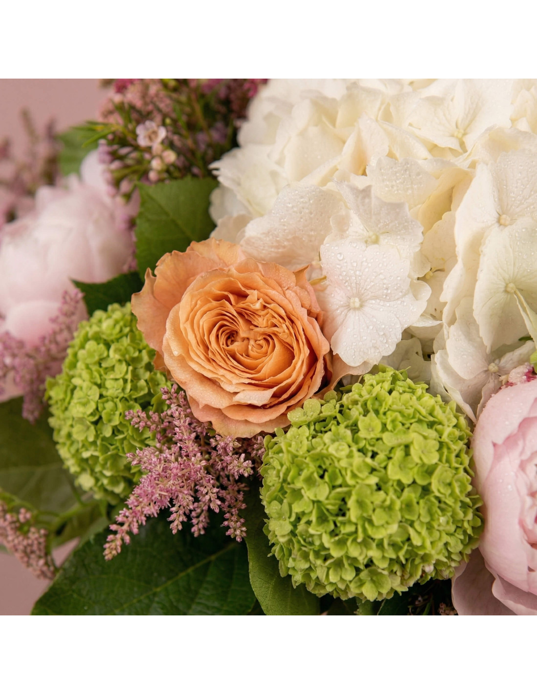 En el corazón del diseño destaca la hortensia blanca, aportando un aire sofisticado y luminoso. Se combina con la delicadeza de la peonía Sara Bernhardt, una de las flores más deseadas por su belleza romántica. Las rosas garden en tonos té y melocotón añaden calidez y un toque ligeramente vintage, mientras que el viburnum roseum aporta contraste con su vibrante verde.