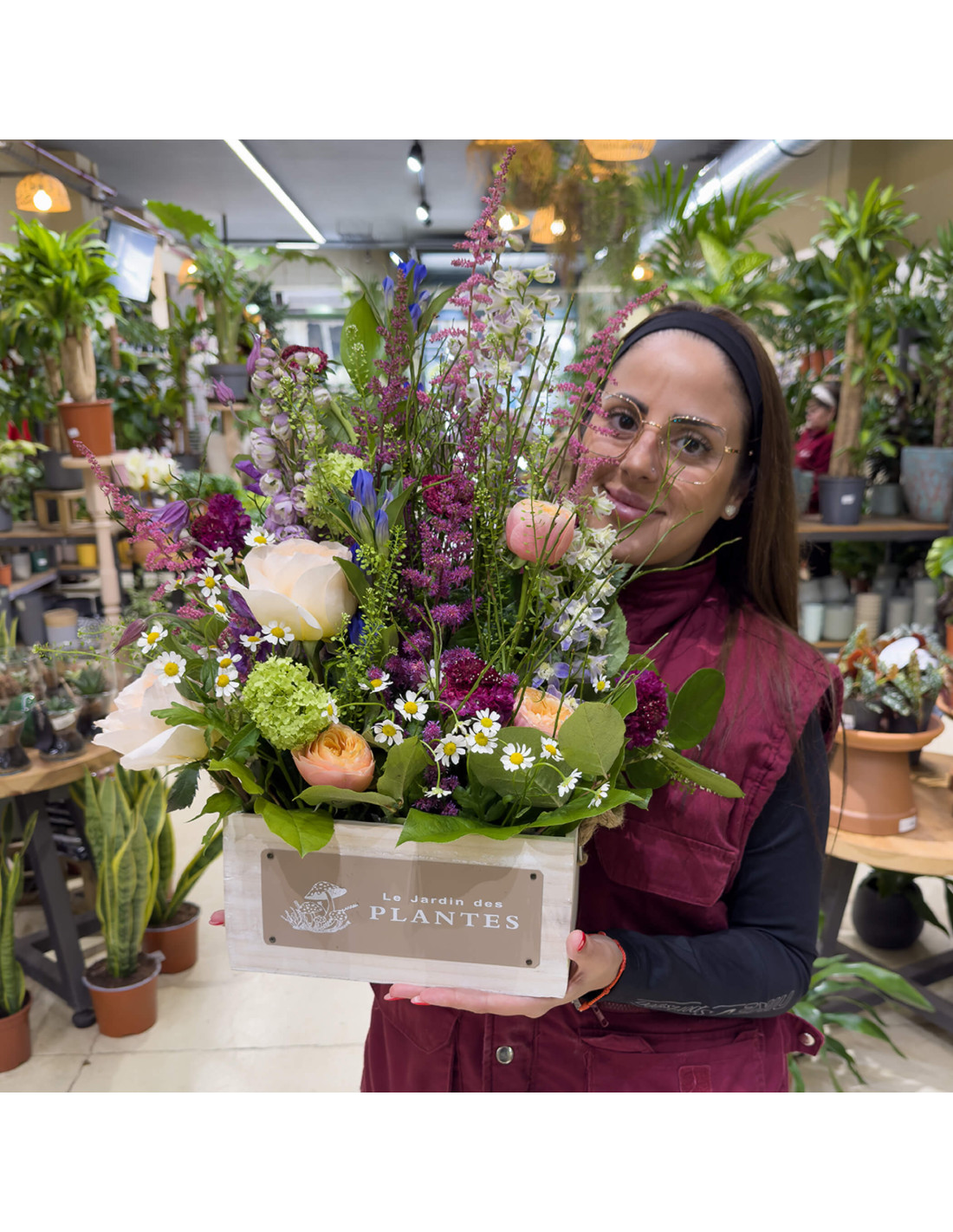 El conjunto se enriquece con la ligereza del astilbe en fucsia y rosa, el toque delicado de la clematis, la frescura vibrante del viburnum roseum y los detalles encantadores de la matricaria (esas pequeñas margaritas que evocan campos infinitos). El thlaspi, por su parte, aporta ese acabado natural que hace que todo fluya con armonía.