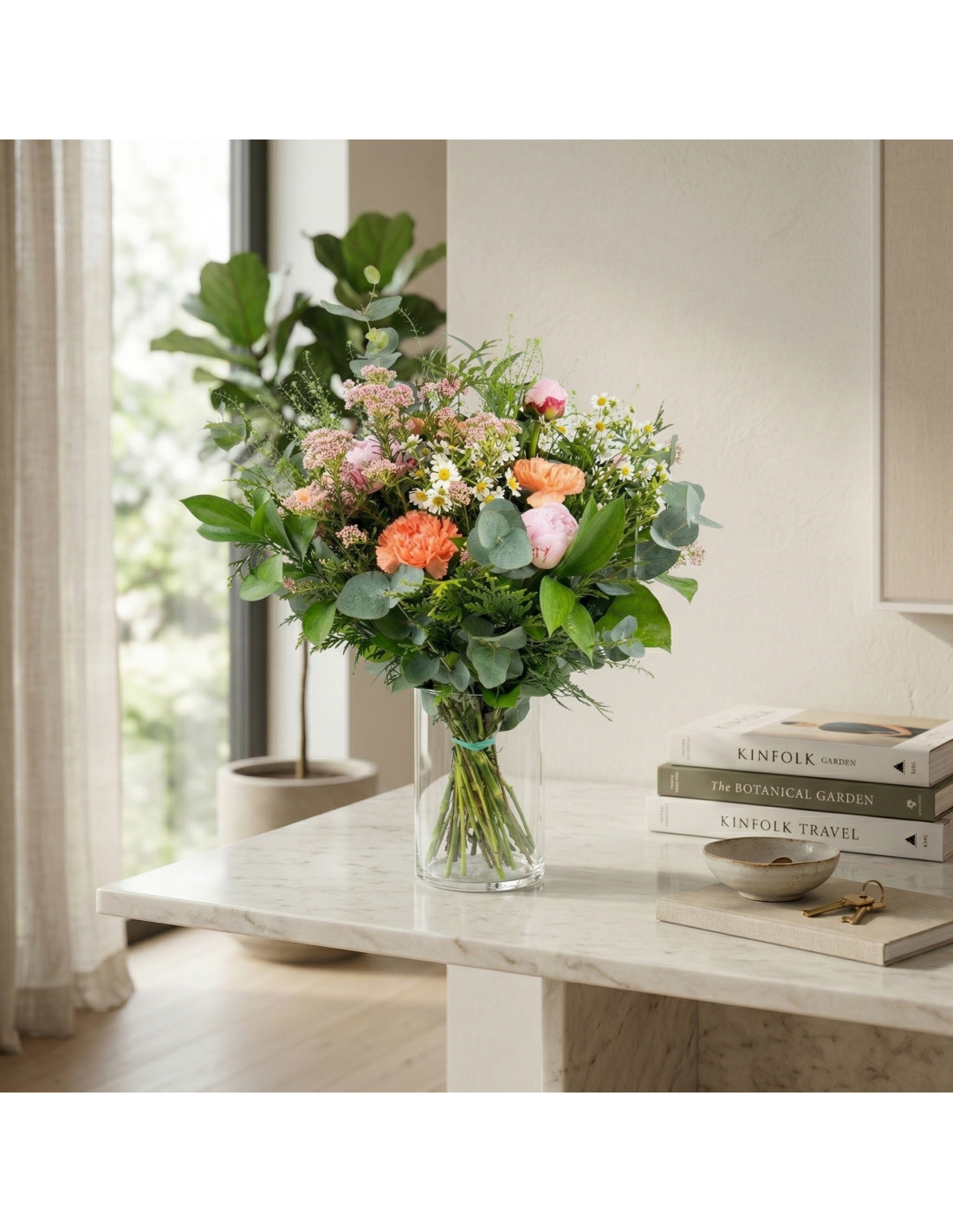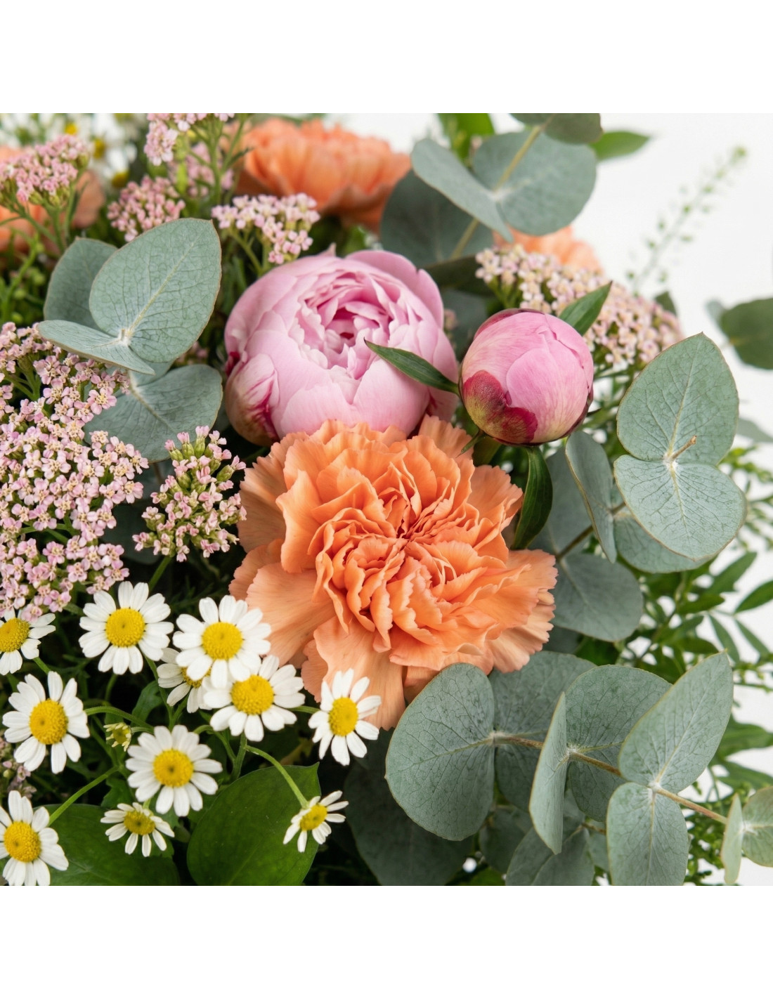 A su alrededor, el clavel salmón introduce un matiz cálido y luminoso, mientras que la matricaria aporta frescura con ese guiño silvestre que recuerda a los campos en primavera. El ozotamus y el thlaspi completan el conjunto con ligereza y textura, consiguiendo un equilibrio natural y muy armonioso.