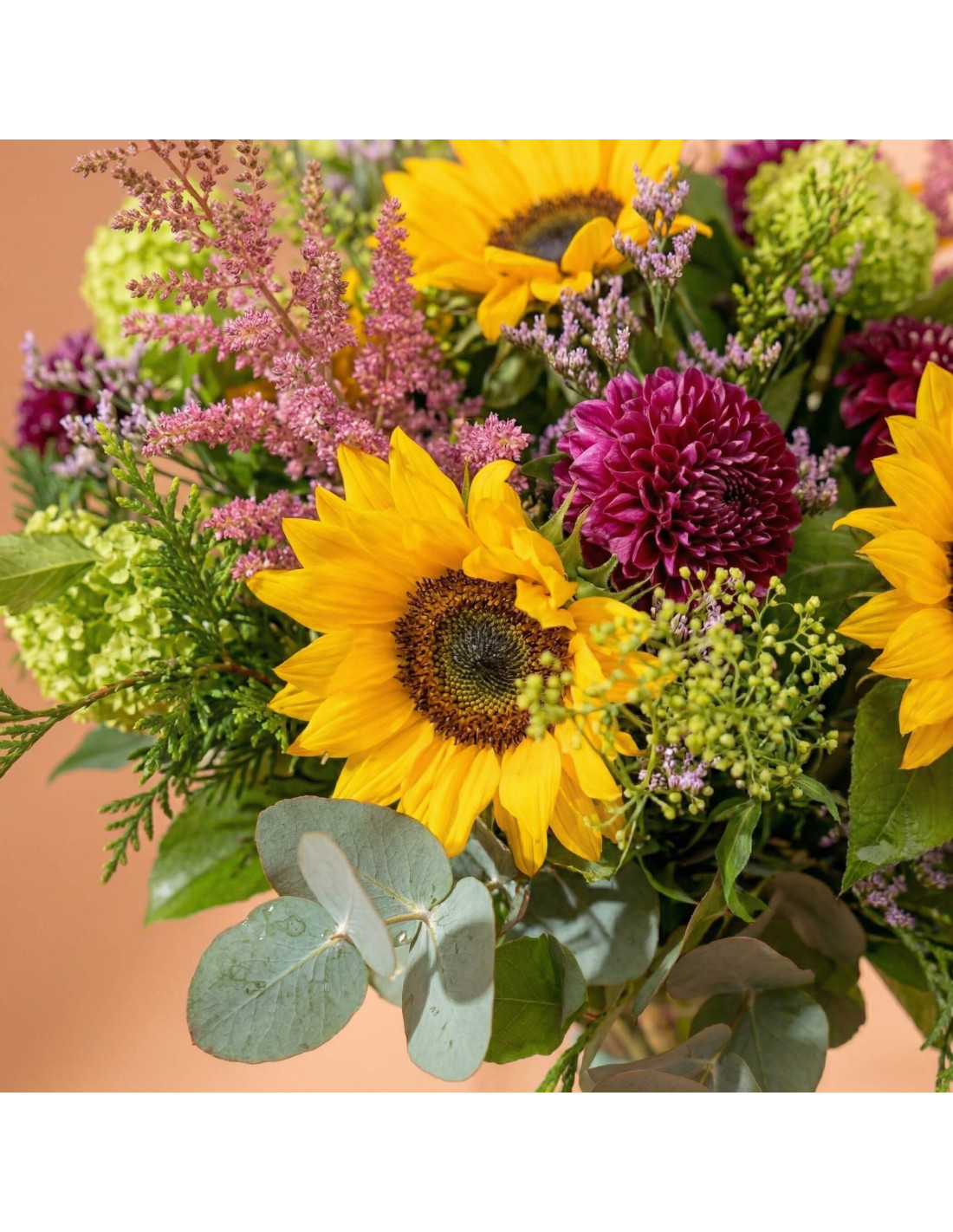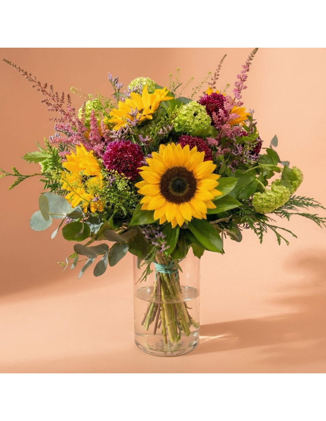 Los girasoles marcan el ritmo del ramo con su energía cálida y optimista, convirtiéndose en el centro de todas las miradas. A su alrededor, el viburnum roseum aporta frescura con sus tonos verdes vibrantes, mientras que la scabiosa granate introduce profundidad y un contraste elegante que eleva todo el conjunto.