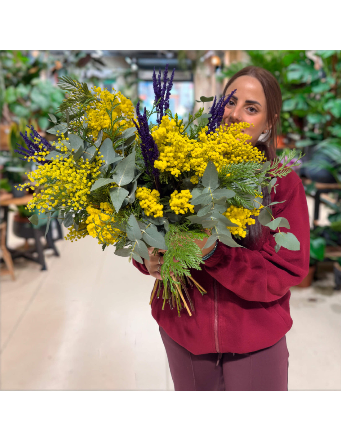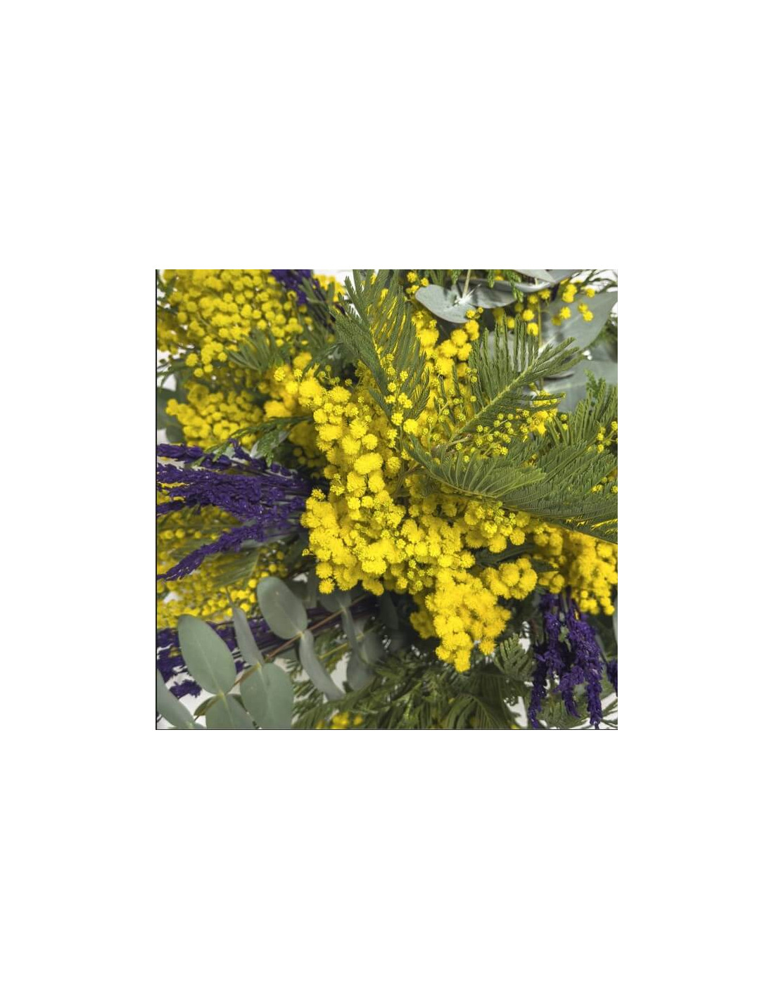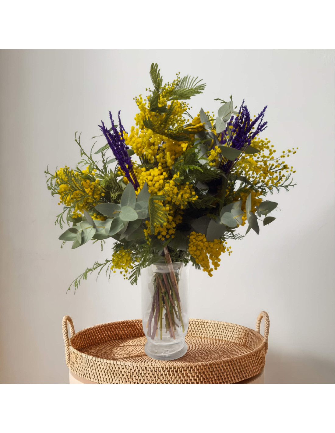Este ramo combina la luminosidad de la mimosa con el aroma envolvente de la lavanda, creando una pieza que transmite frescura, vitalidad y calma. El contraste de colores entre el amarillo vibrante y el violeta profundo lo convierte en una opción atrevida pero armoniosa. Es perfecto para alegrar estancias con personalidad o para regalar un detalle original y lleno de energía positiva. Una fusión natural que invita a respirar hondo y sonreír.
