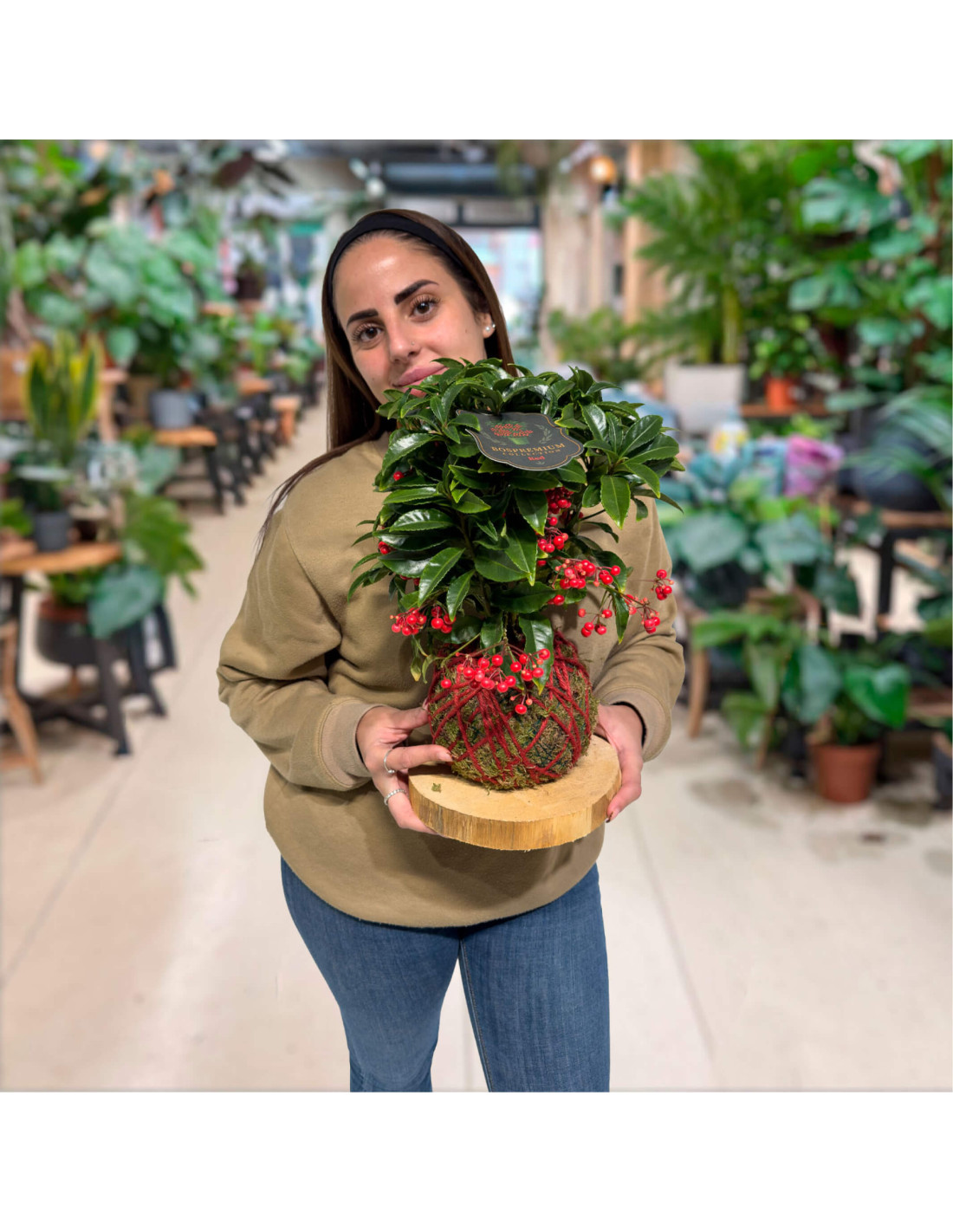 La Kokedama de Ardisia es una pieza decorativa navideña elegante y diferente, ideal para quienes buscan un detalle natural con un toque original. La planta de ardisia, conocida por sus brillantes hojas verdes y sus decorativas bolitas rojas, se presenta con la técnica japonesa de kokedama, donde las raíces se envuelven en musgo y cuerda roja para crear un diseño cálido y artesanal. Colocada sobre una base de madera natural, esta kokedama es perfecta para mesas, recibidores y espacios pequeños que necesitan un acento festivo y sofisticado. Elaborada a mano por nuestros floristas y disponible para entrega en Barcelona y área metropolitana.