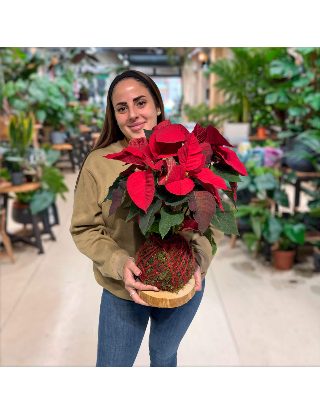 La Kokedama de Poinsettia es una forma original y elegante de decorar en Navidad. Presentada sobre una base natural de madera, esta poinsettia de alta calidad está trabajada con la técnica japonesa de kokedama, envolviendo las raíces en musgo y cuerda decorativa roja para crear un diseño único, cálido y artesanal. Su estilo minimalista y festivo la convierte en una pieza ideal para mesas, recibidores y espacios pequeños donde se busca un toque navideño distinto y con personalidad. Elaborada a mano por los floristas de Flores Navarro y disponible para entrega en Barcelona y área metropolitana.