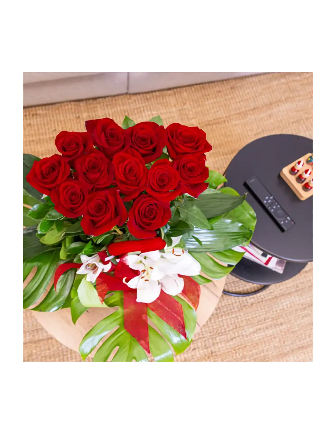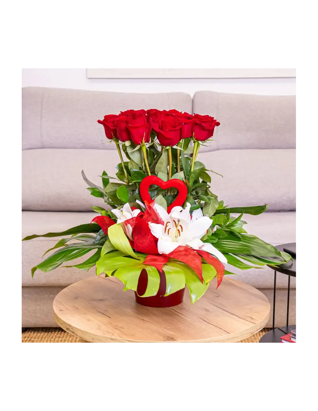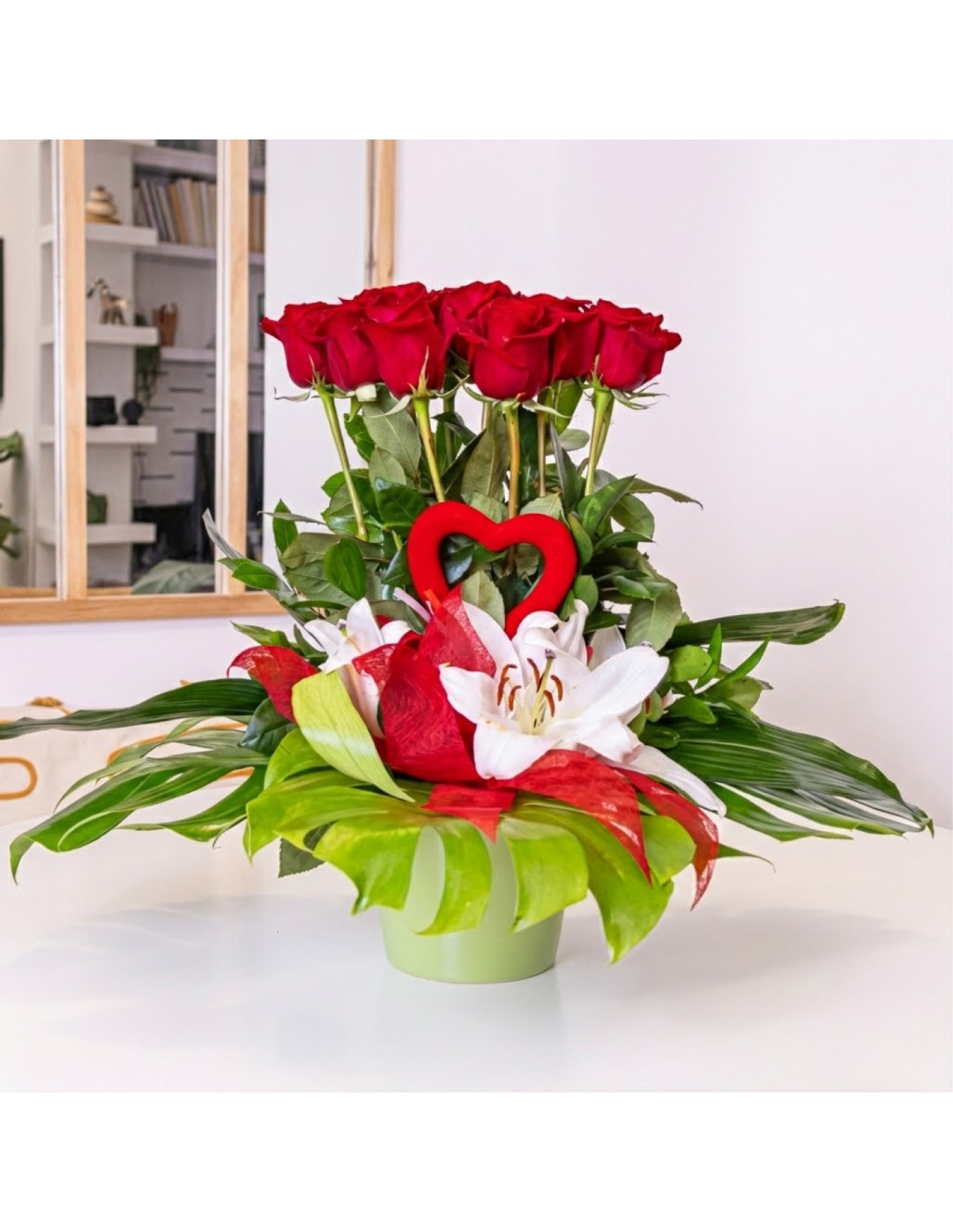 ¡Sorprende a tu ser querido con nuestro impresionante Centro de 12 Rosas Rojas! Este arreglo floral único presenta 12 hermosas rosas rojas dispuestas verticalmente, creando una declaración de amor que se eleva literalmente por encima del resto.Para añadir un toque especial, hemos incluido detalles de lilium que aportan un encanto extra a este centro elegante. Los verdes decorativos complementan perfectamente las rosas, creando una combinación visualmente impactante.