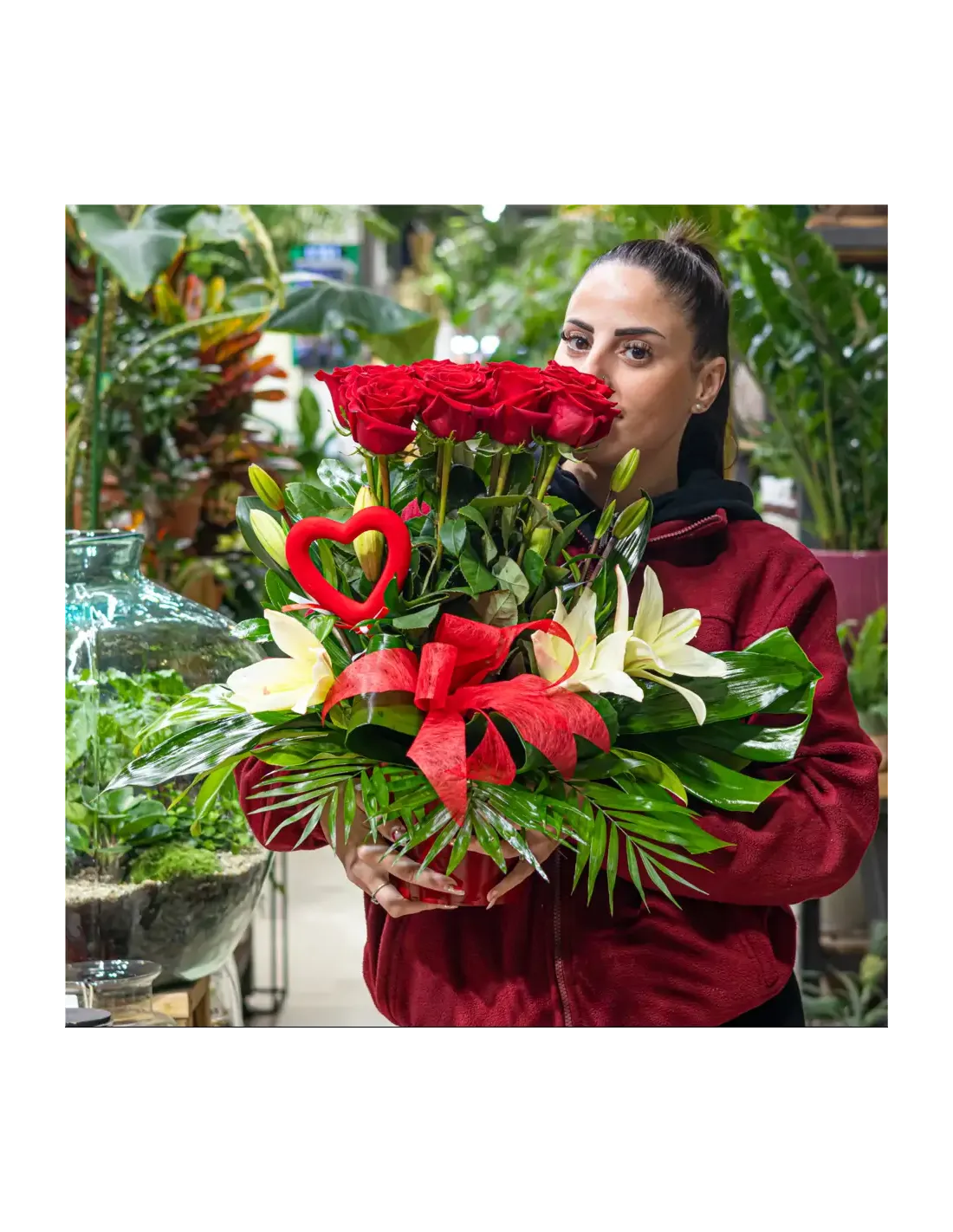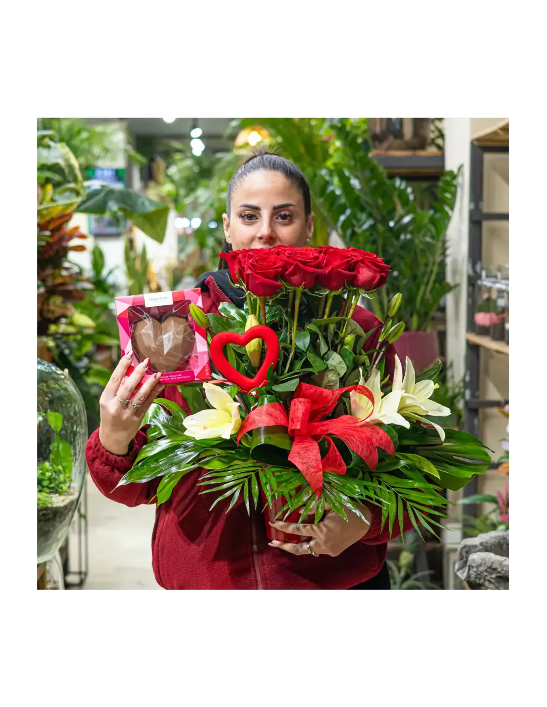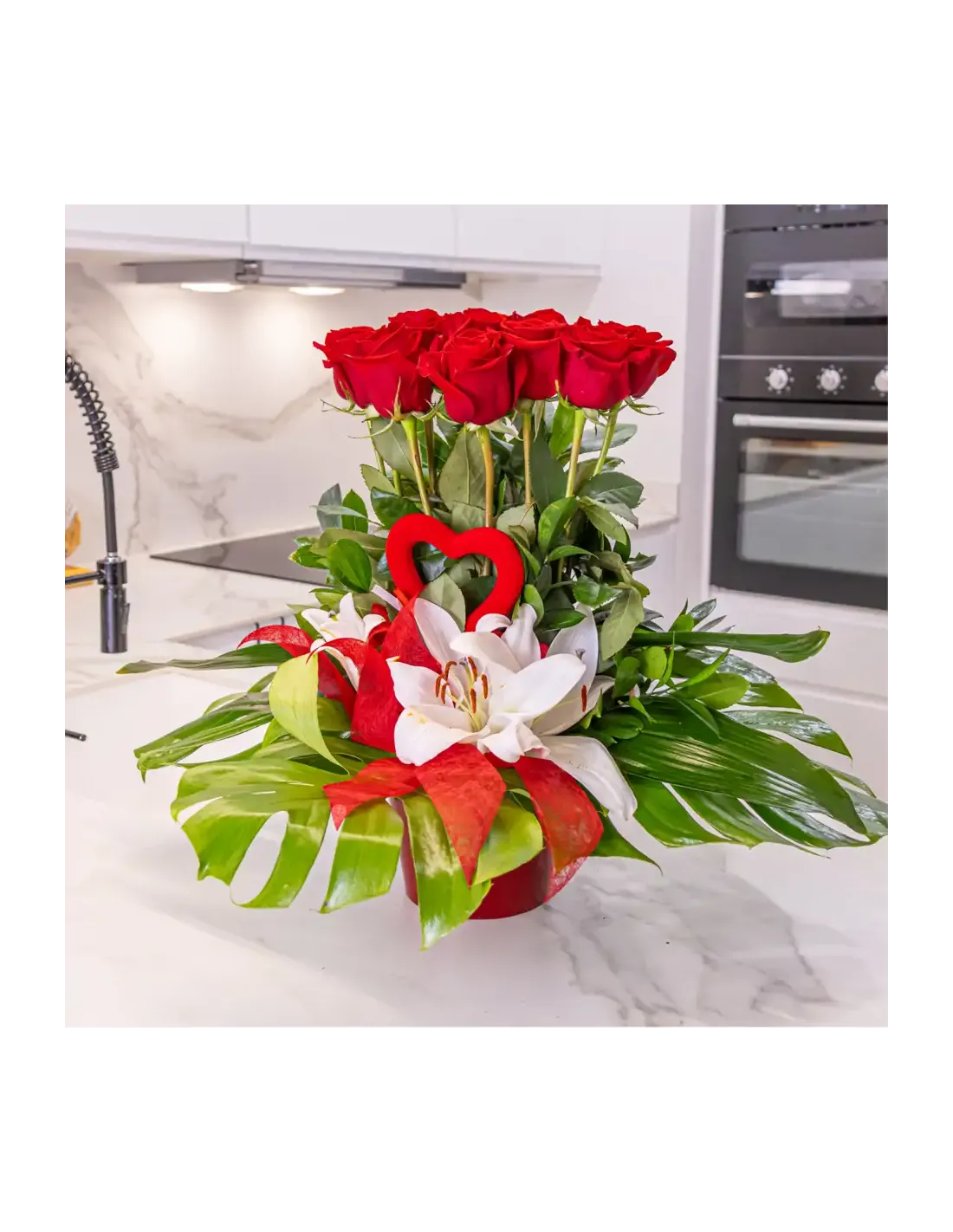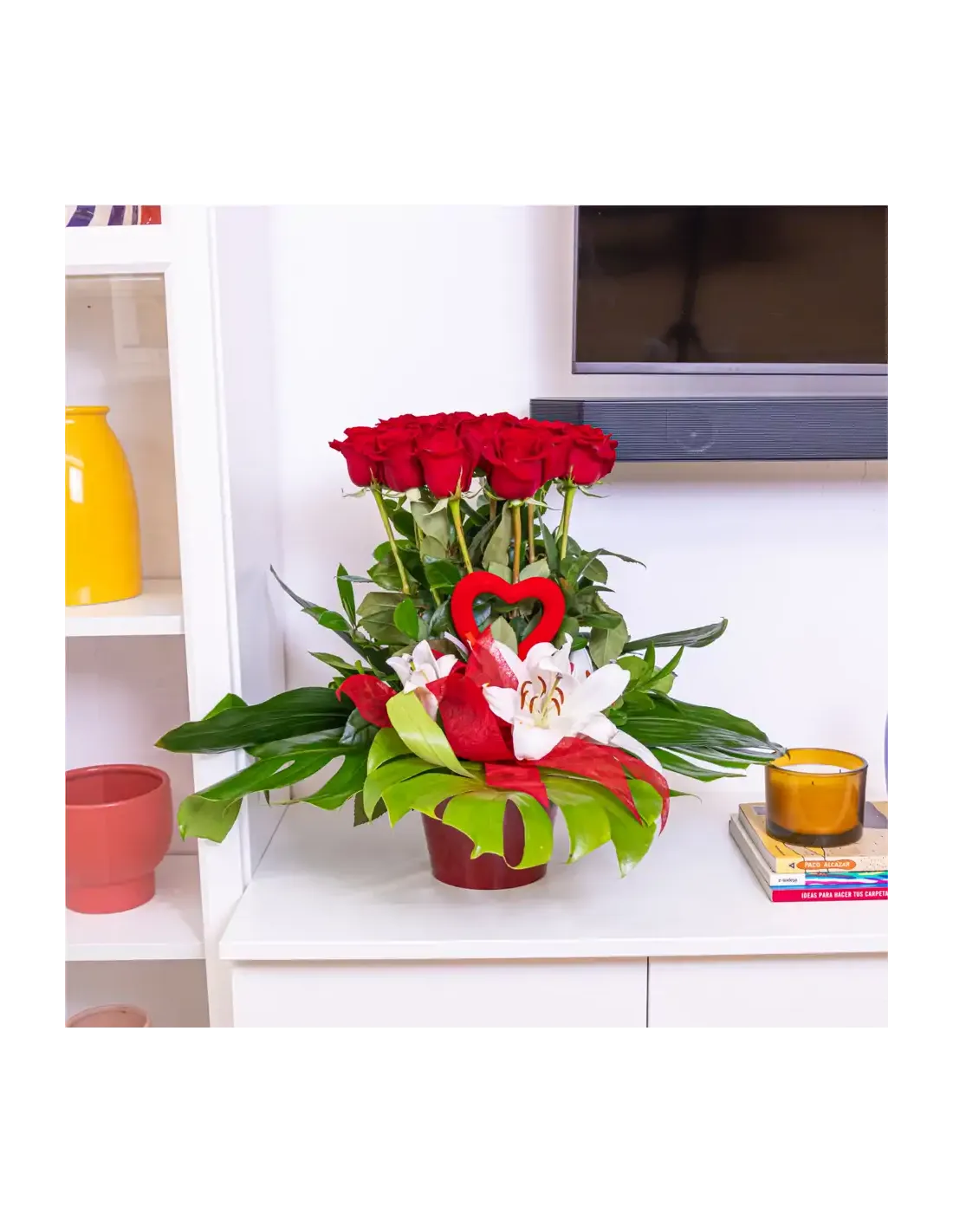 ¡Sorprende a tu ser querido con nuestro impresionante Centro de 12 Rosas Rojas! Este arreglo floral único presenta 12 hermosas rosas rojas dispuestas verticalmente, creando una declaración de amor que se eleva literalmente por encima del resto.Para añadir un toque especial, hemos incluido detalles de lilium que aportan un encanto extra a este centro elegante. Los verdes decorativos complementan perfectamente las rosas, creando una combinación visualmente impactante.