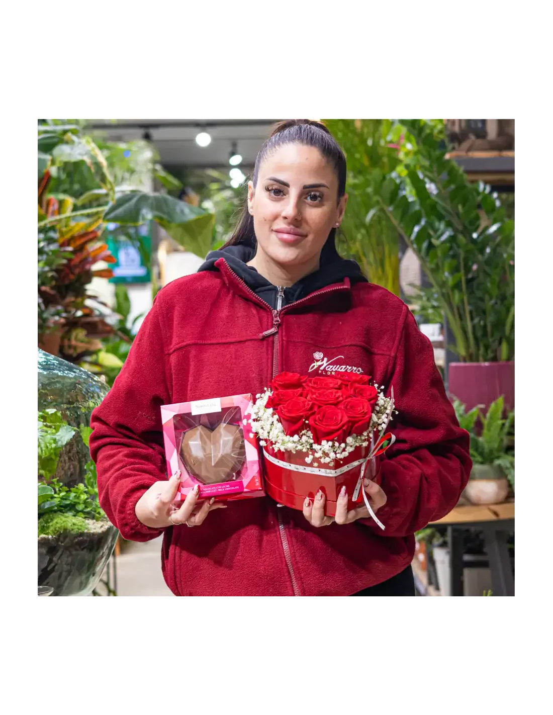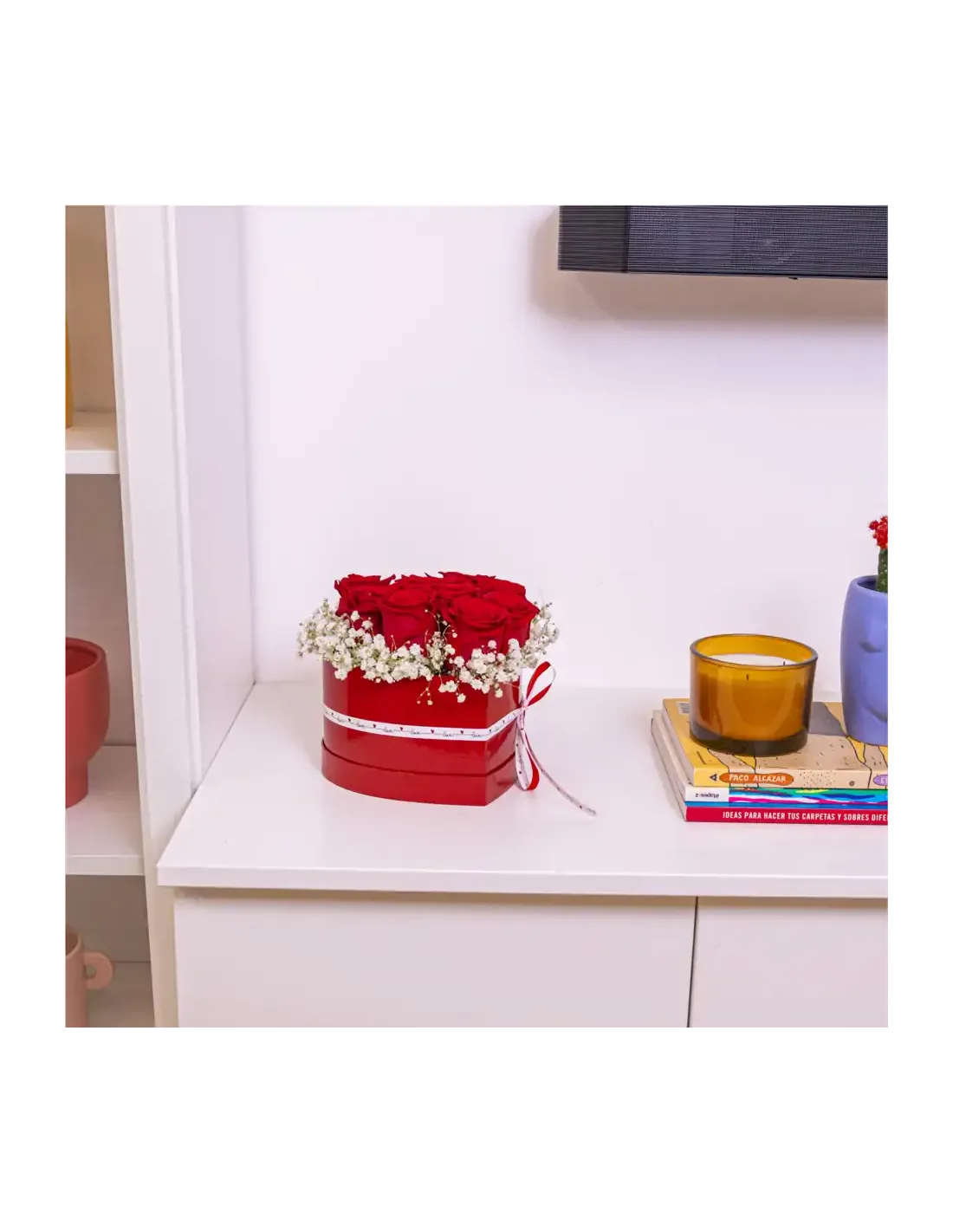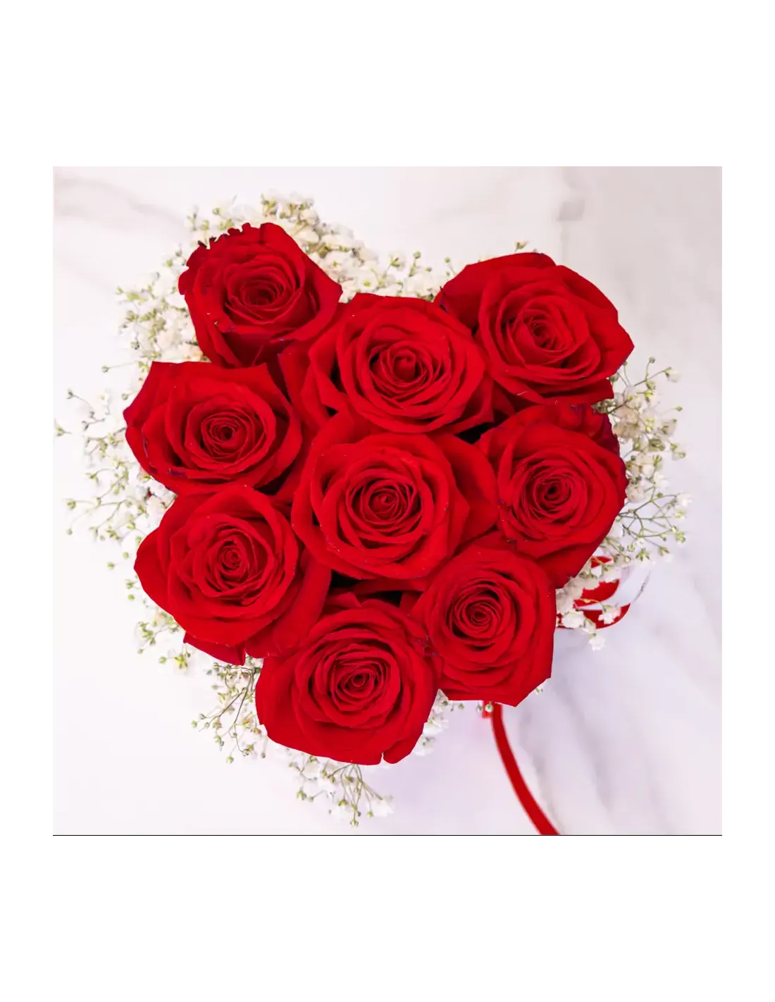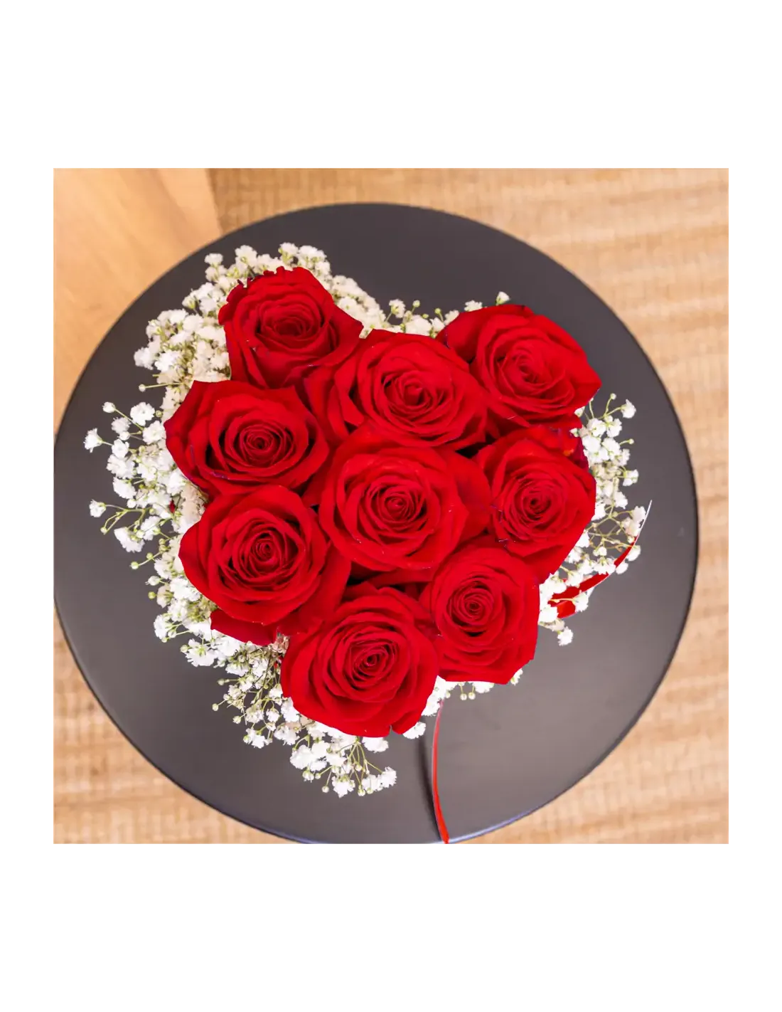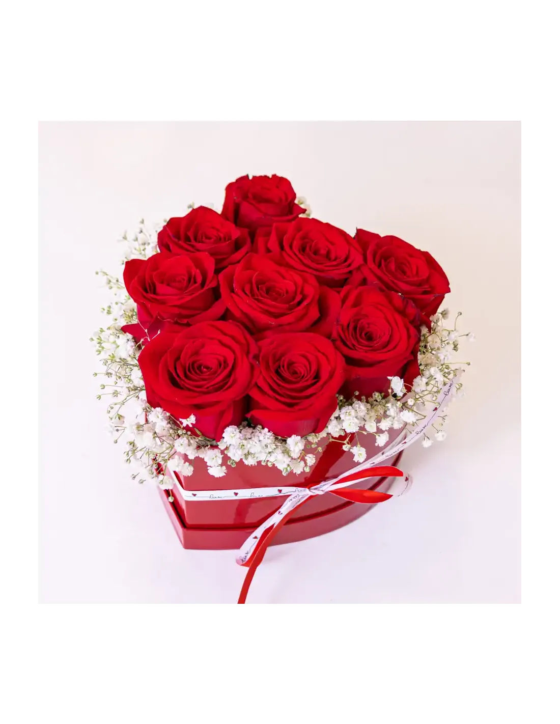 Expresa todo tu amor con esta elegante y sofisticada caja en forma de corazón, llena de vibrantes rosas rojas frescas, símbolo eterno de la pasión y el amor. Decorada con delicada paniculata blanca, añade un toque romántico y delicado que convierte este arreglo en el regalo perfecto para San Valentín.