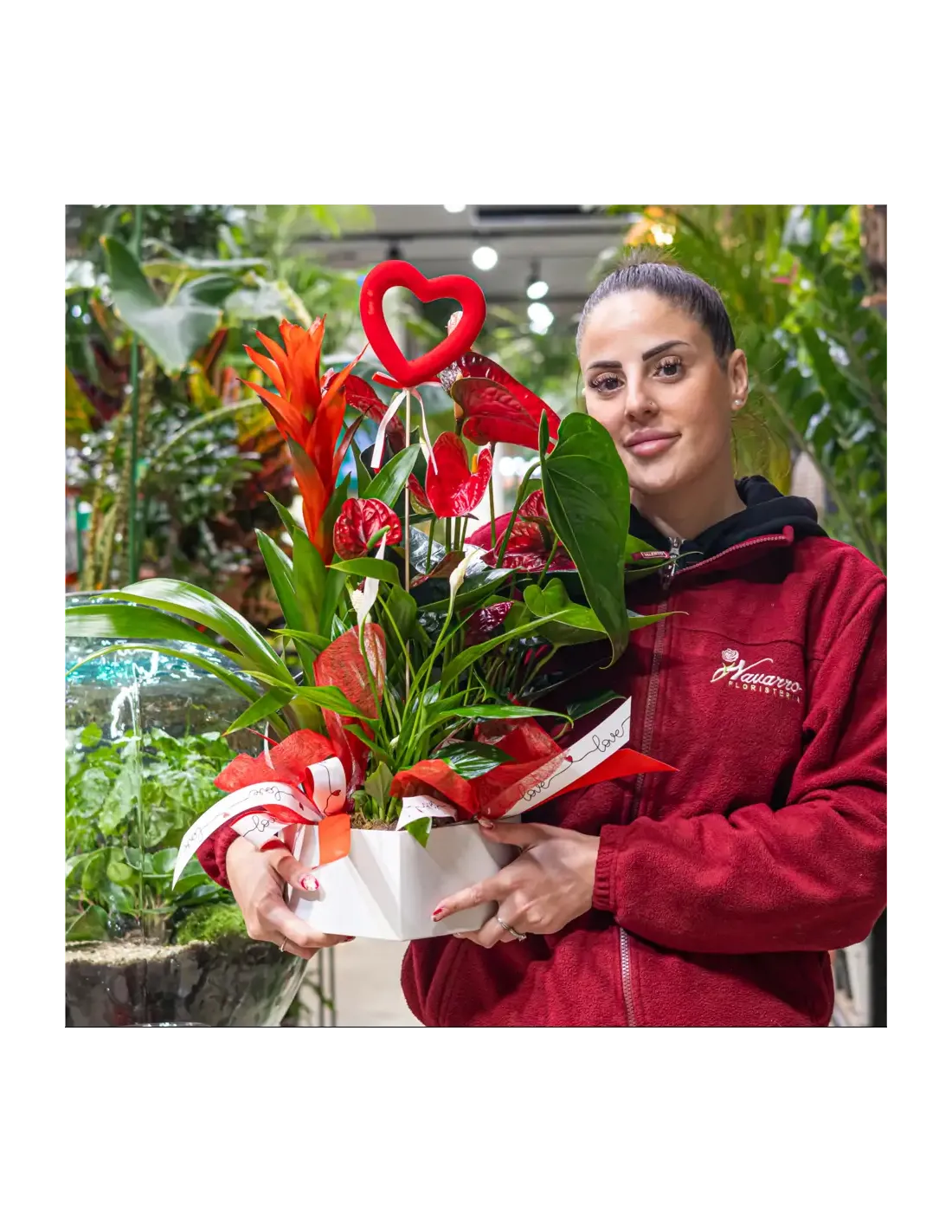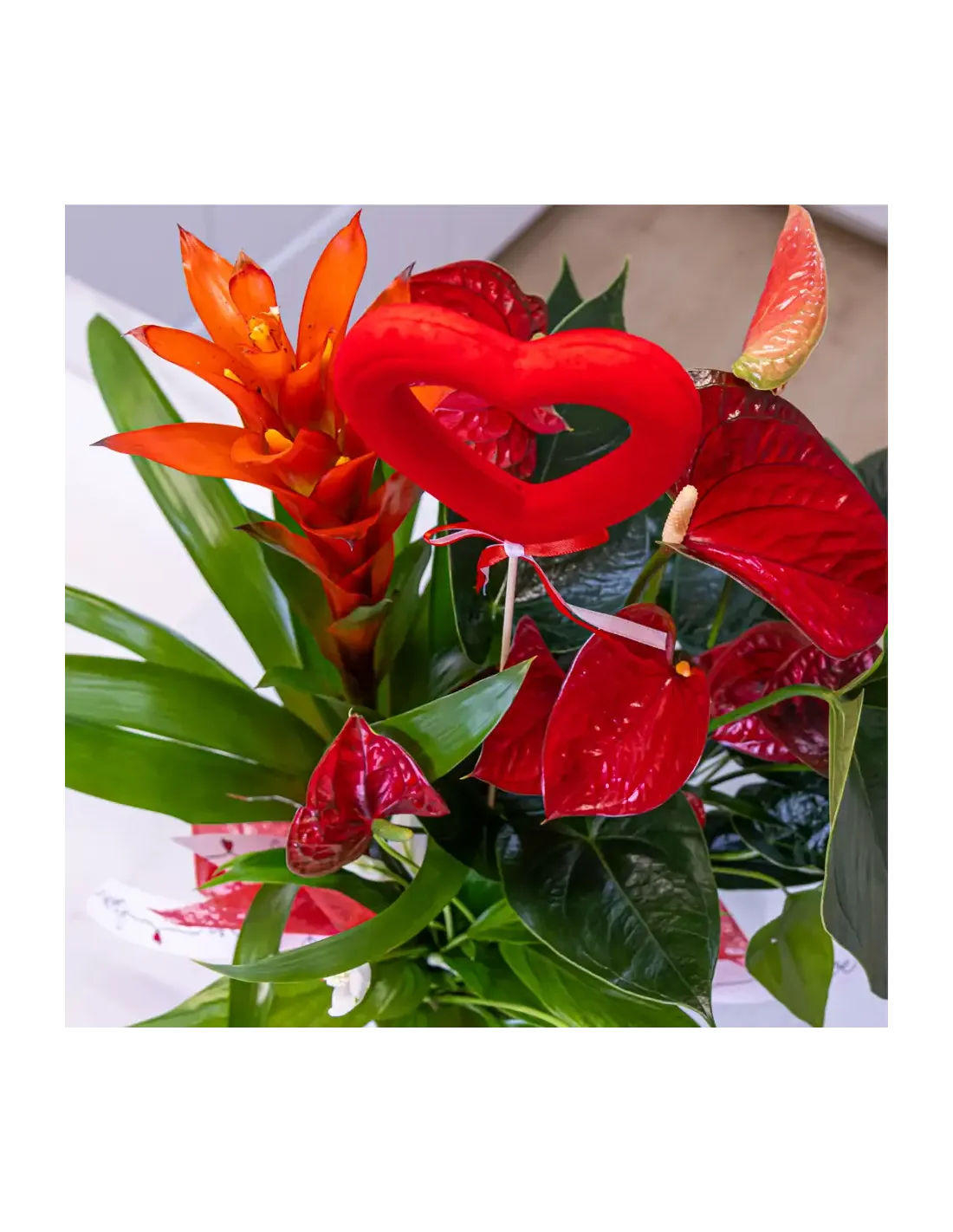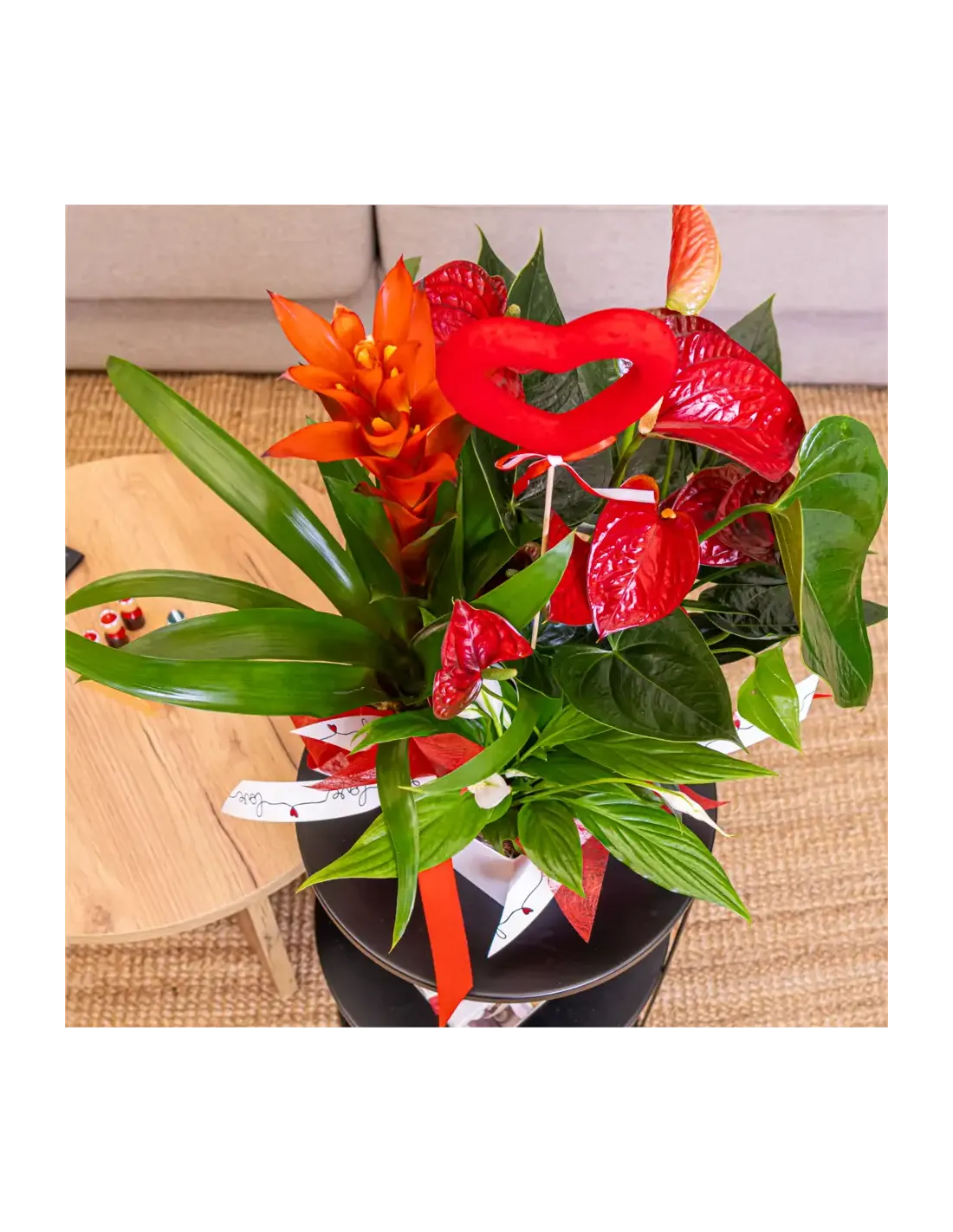 Un diseño único que combina la fuerza de las plantas exóticas con la delicadeza de una caja en forma de corazón. Este arreglo floral destaca por su frescura, elegancia y su mensaje de amor